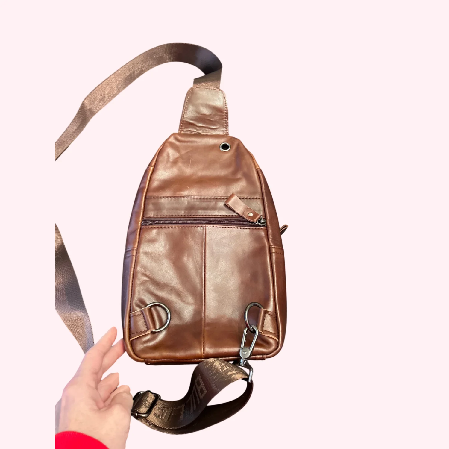Elegant, brown, leather bowl, captain Crossbody, bag for men, perfect for hands-free convenience. Features a stylish design with secured zippered compartments. New with tags.