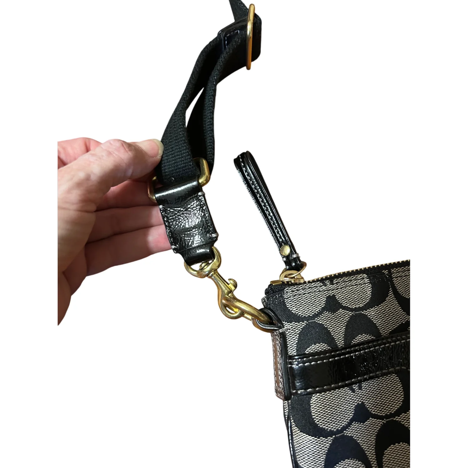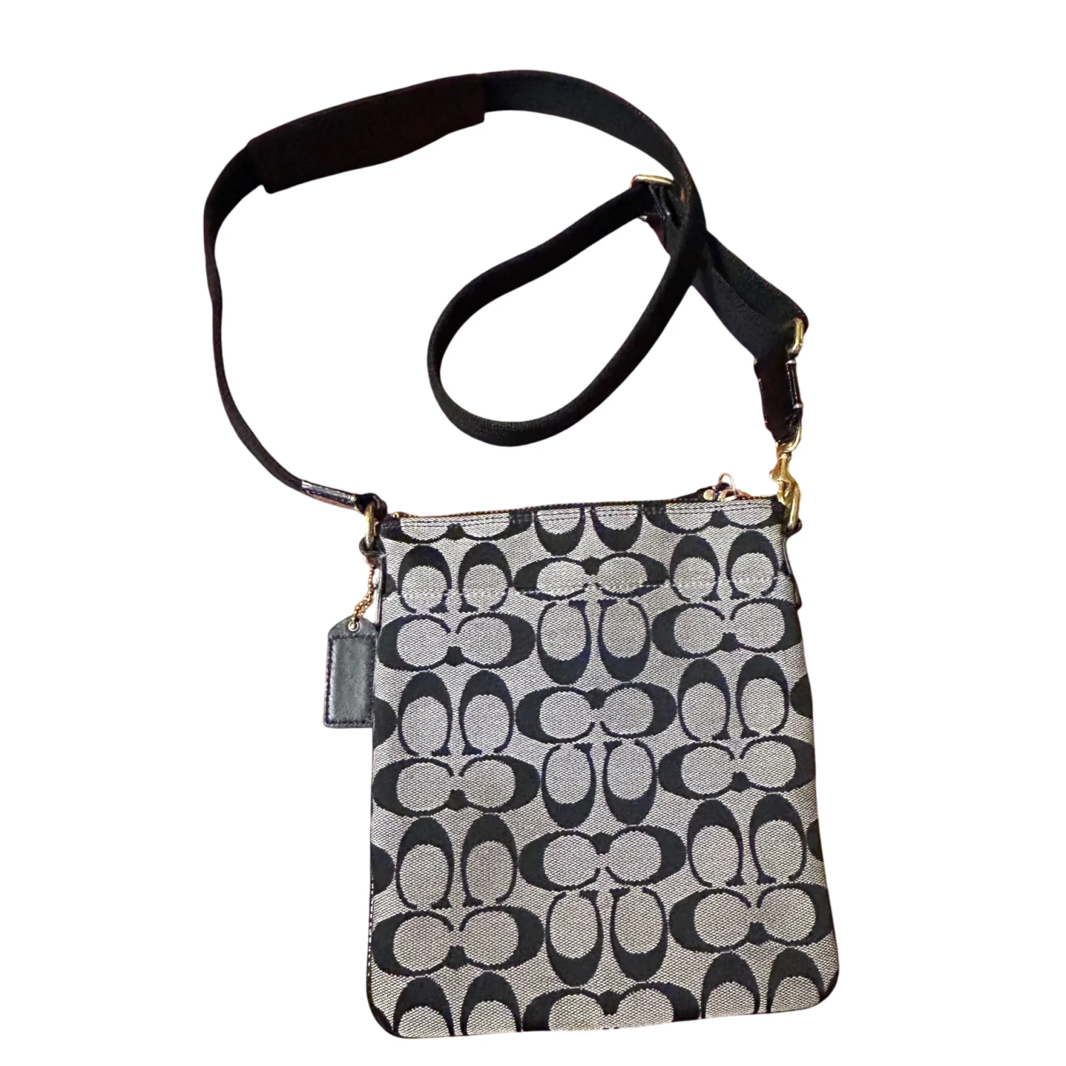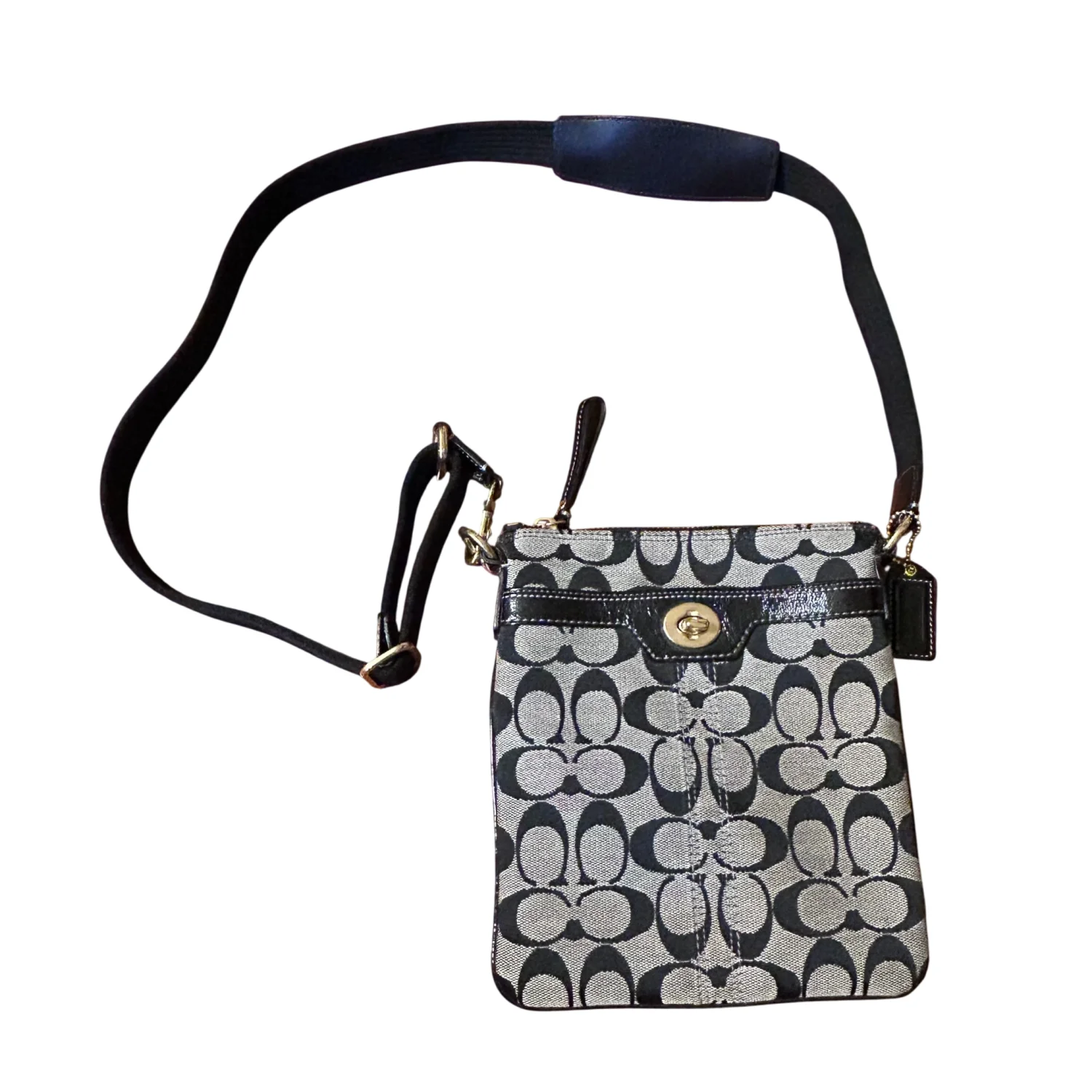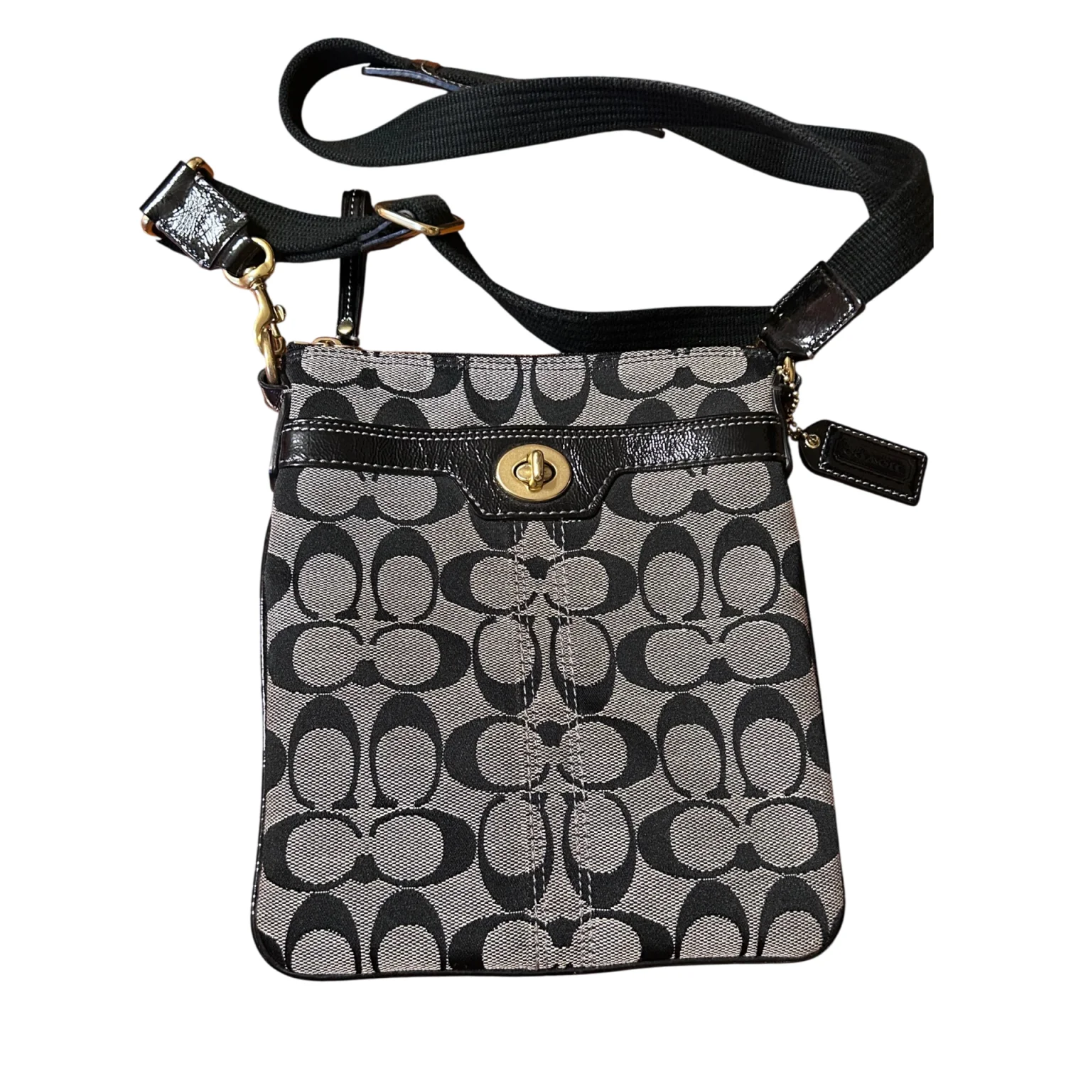 This is a Coach Hamptons Signature Swingpack crossbody bag in black and white jacquard canvas with black patent leather trim and brass hardware