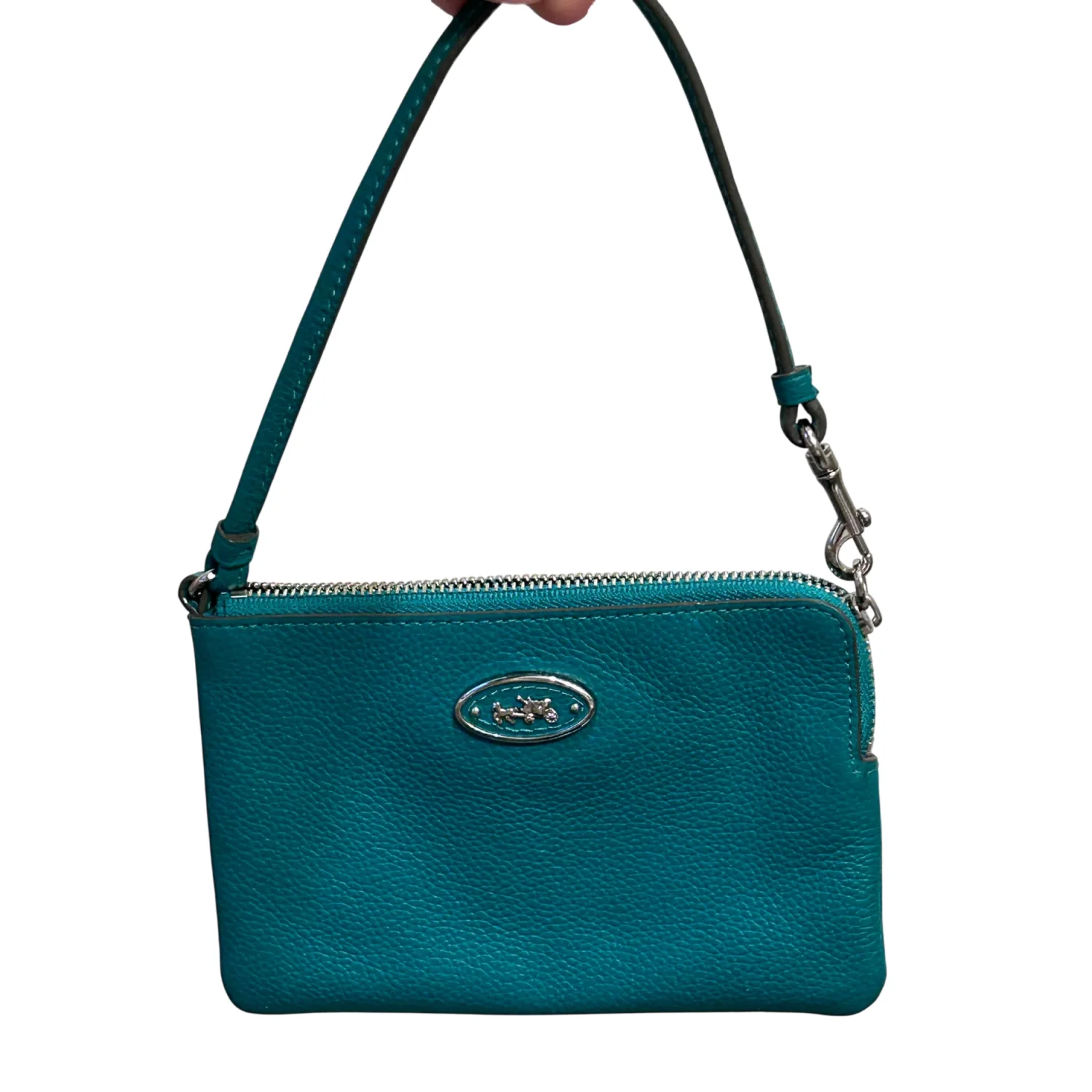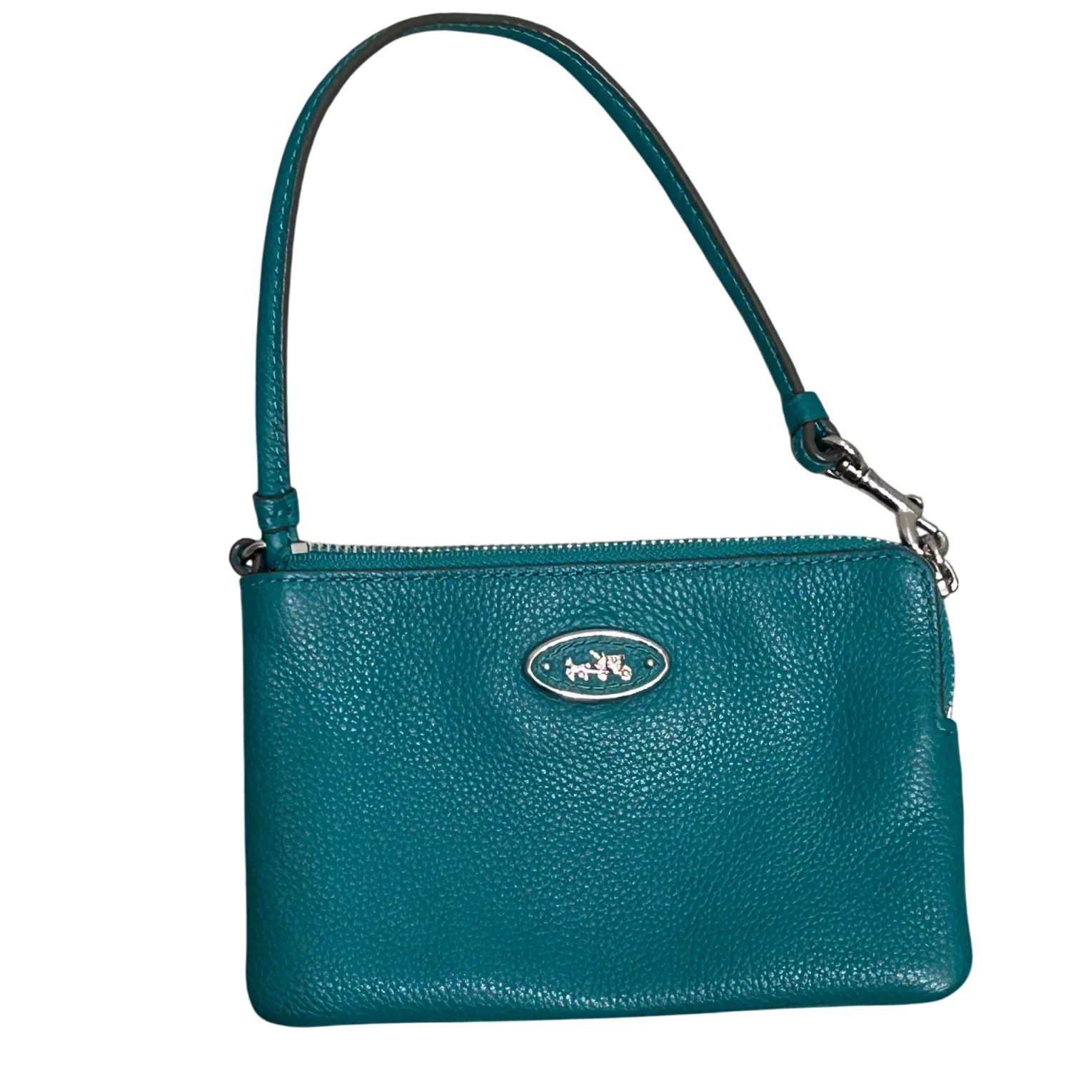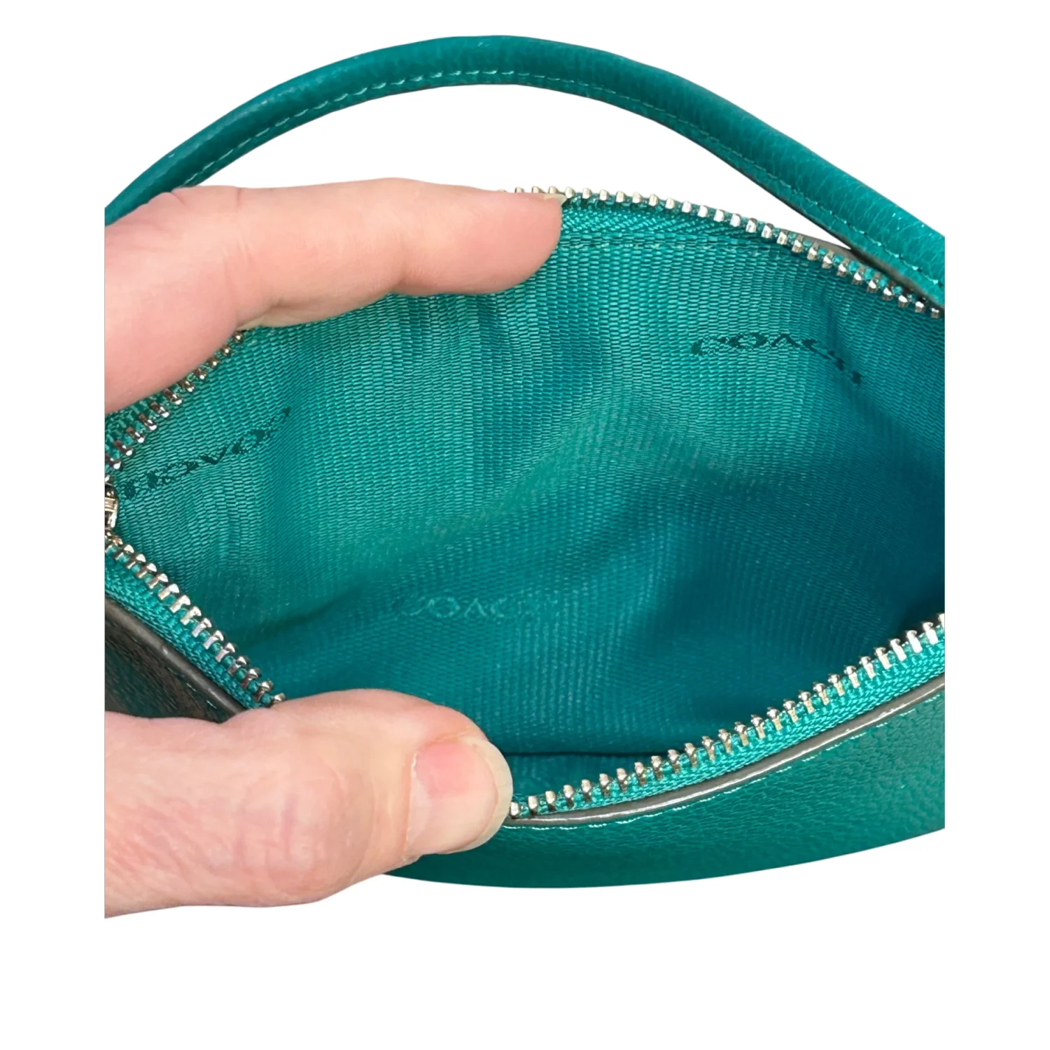 Coach chic and compact teal leather wristlet, perfect for on-the-go style. The interior typically includes two credit card slots. This wristlet made of polished pebble leather in a teal or deep turquoise color. It features a zip-top closure, a detachable wrist strap, and a silver-toned oval Coach logo emblem on the front. The interior includes two credit card slots. Stylish, classy and a beautiful jewel toned color