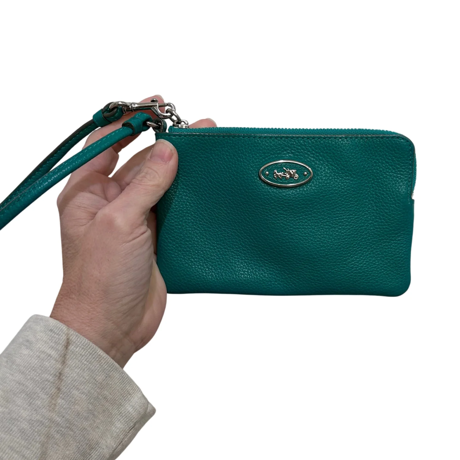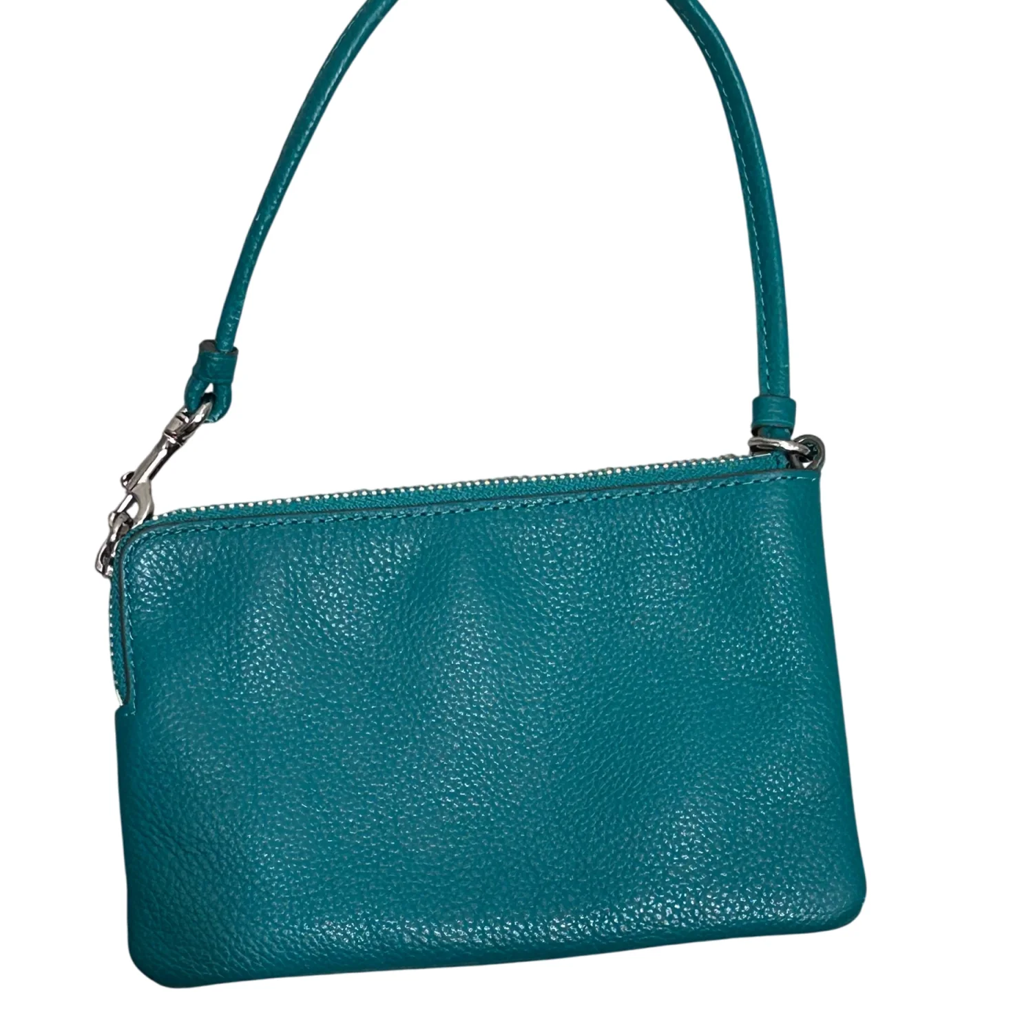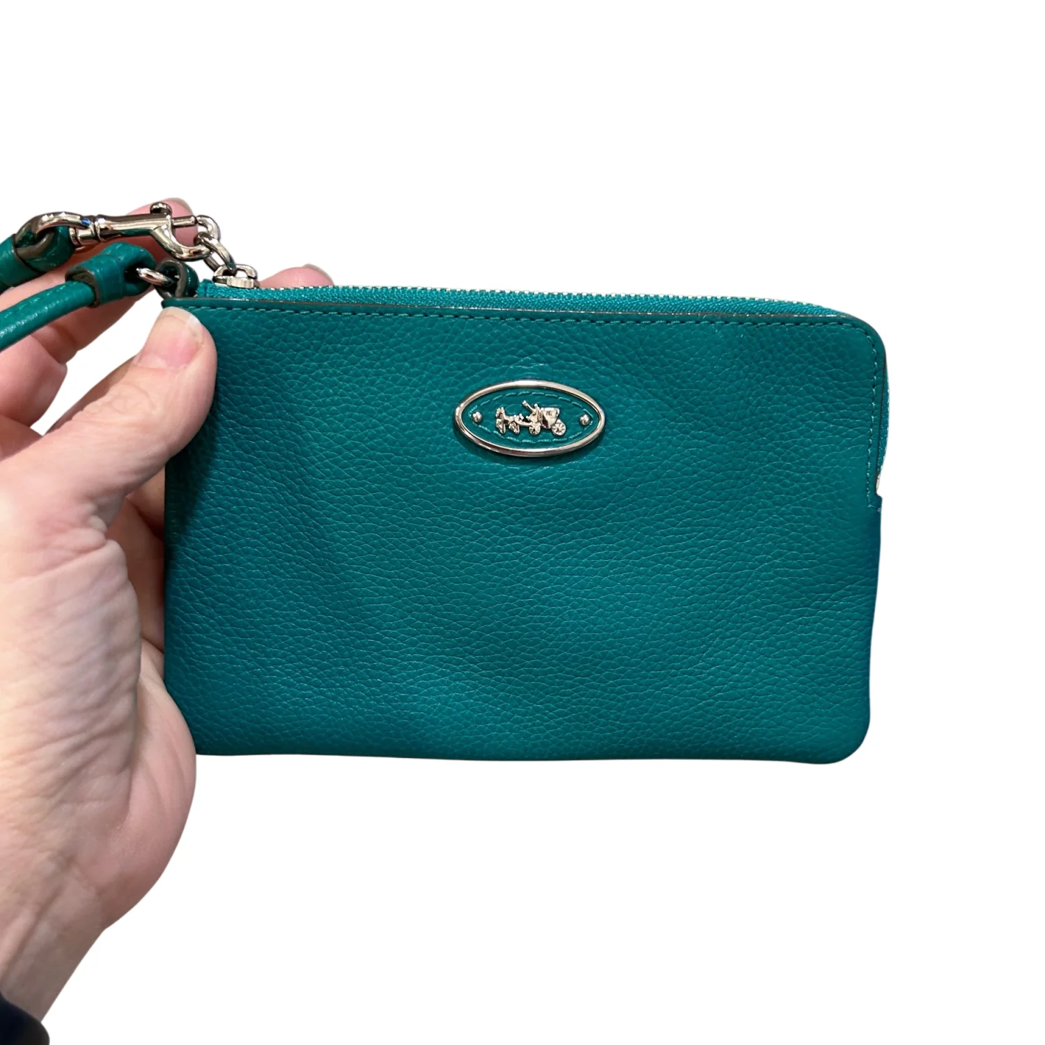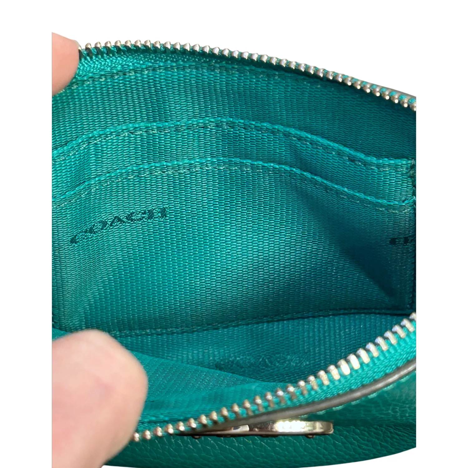 Coach chic and compact teal leather wristlet, perfect for on-the-go style. The interior typically includes two credit card slots. This wristlet made of polished pebble leather in a teal or deep turquoise color. It features a zip-top closure, a detachable wrist strap, and a silver-toned oval Coach logo emblem on the front. The interior includes two credit card slots. Stylish, classy and a beautiful jewel toned color