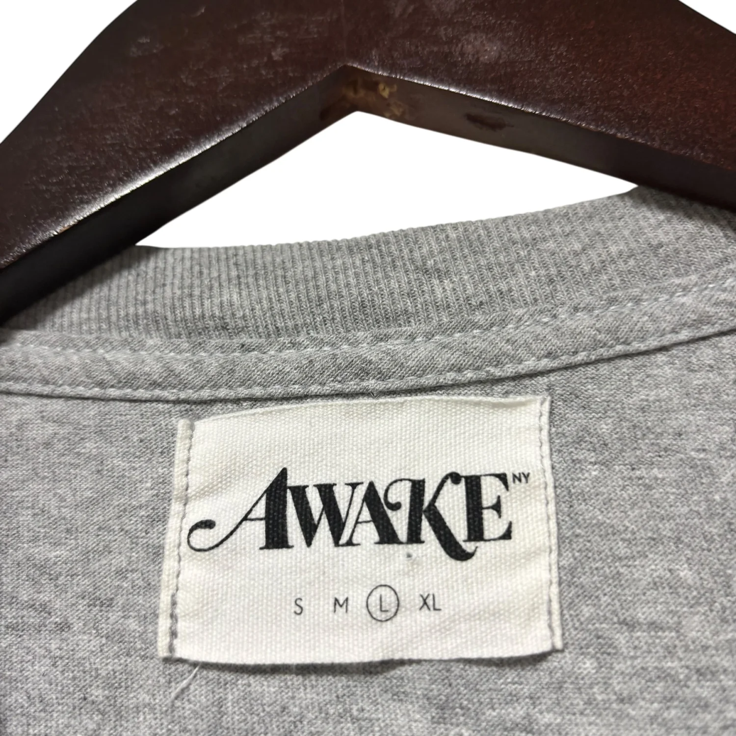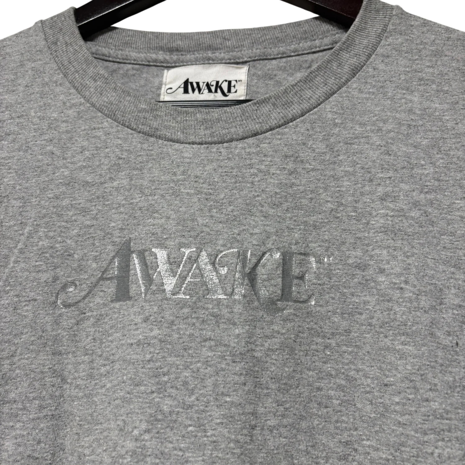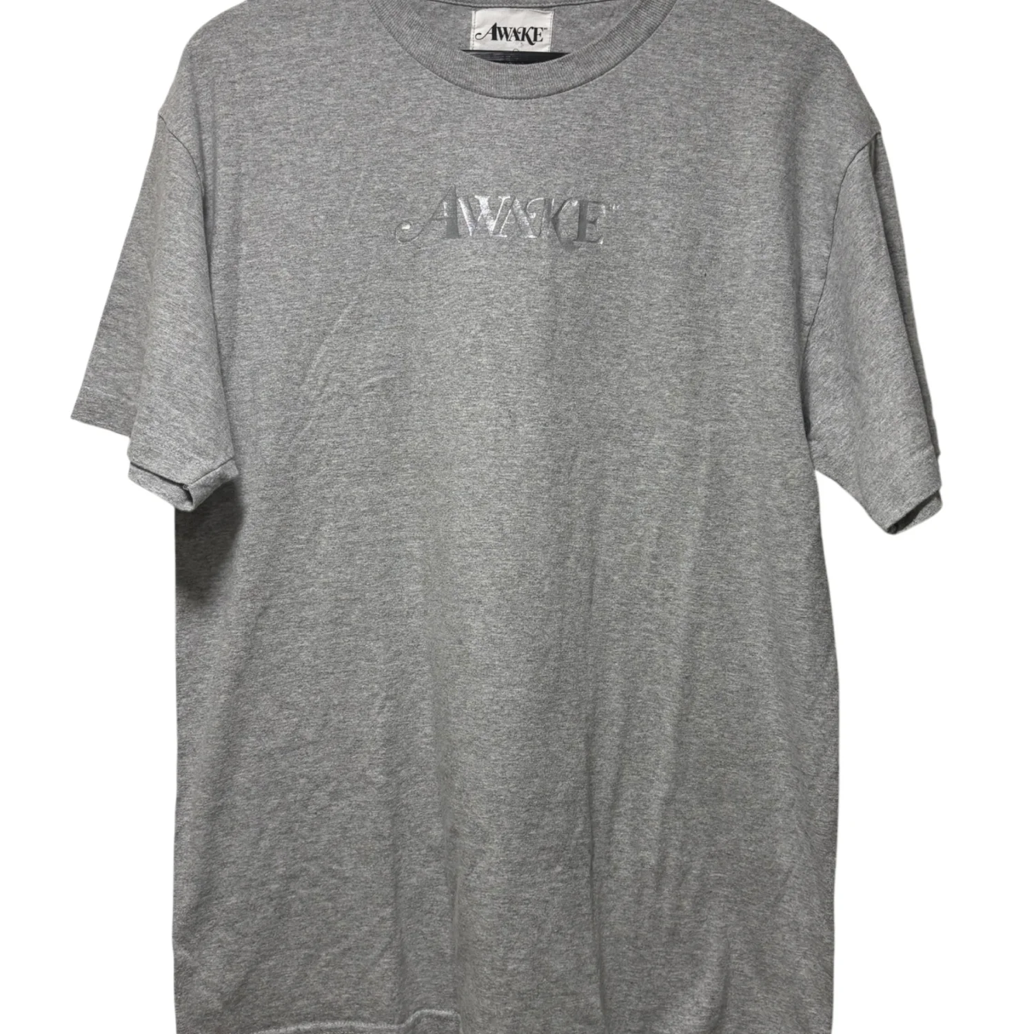 This Awake NY T-shirt features a minimalist design with 'Awake' printed in silver across the chest. The shirt is made from soft, comfortable grey fabric, perfect for casual wear. It's a regular fit, ideal for everyday style. Tags: #casual #AwakeNY #basictee