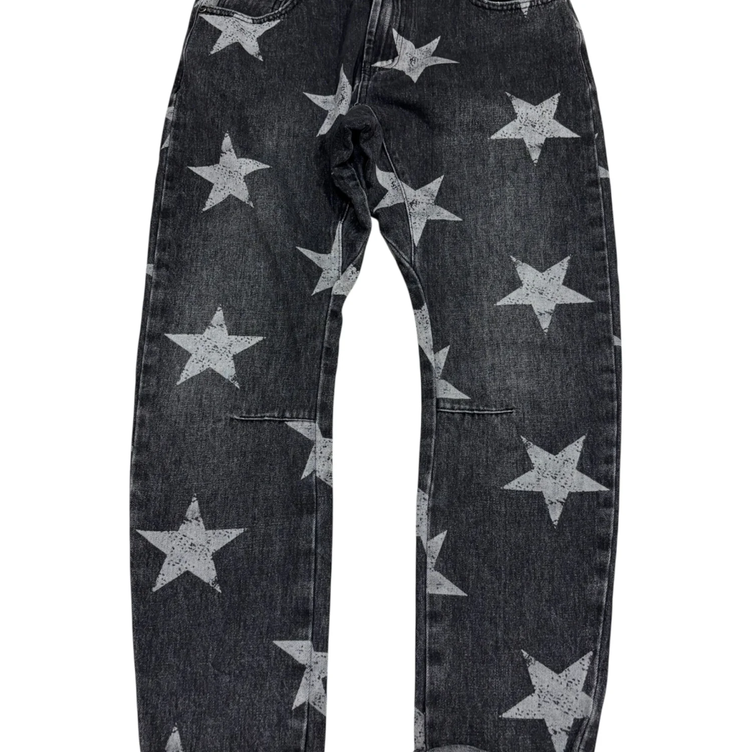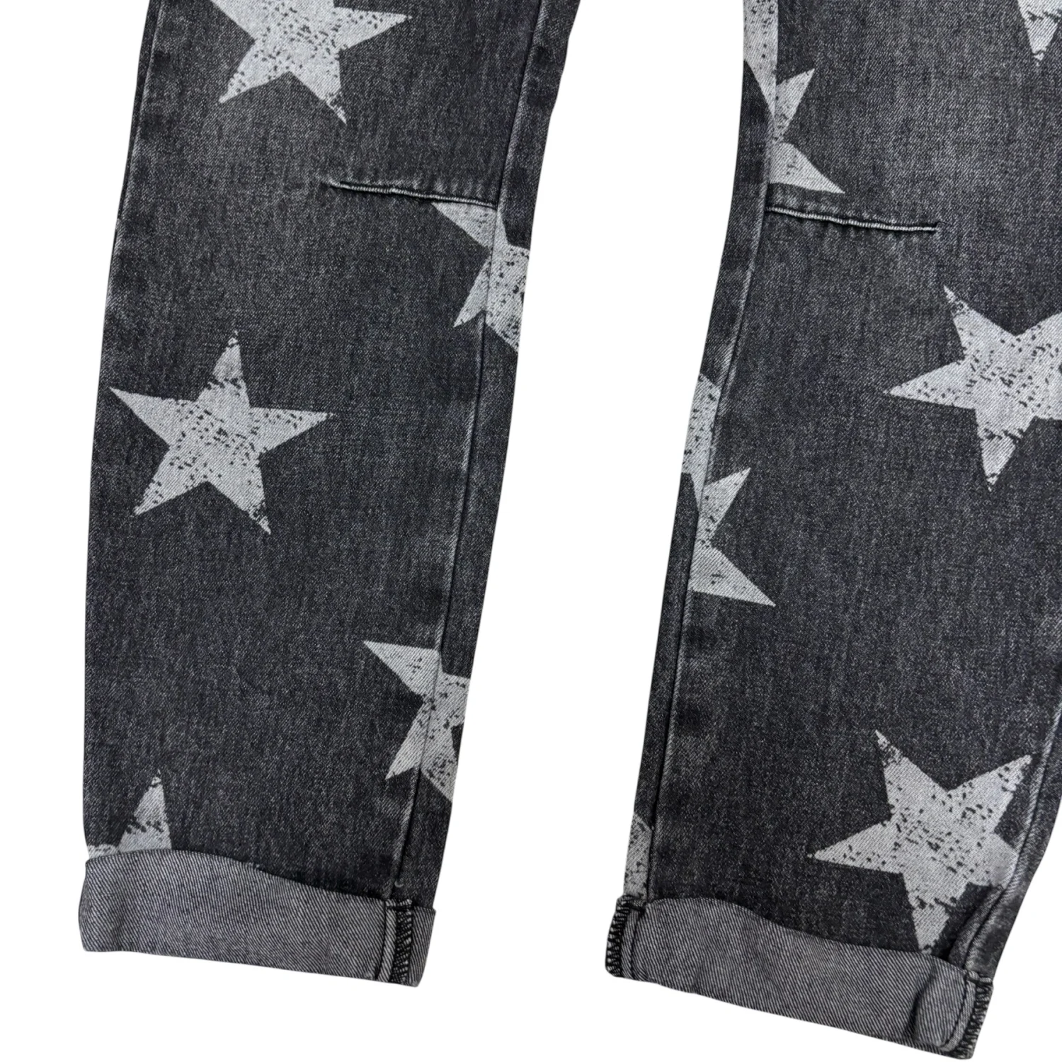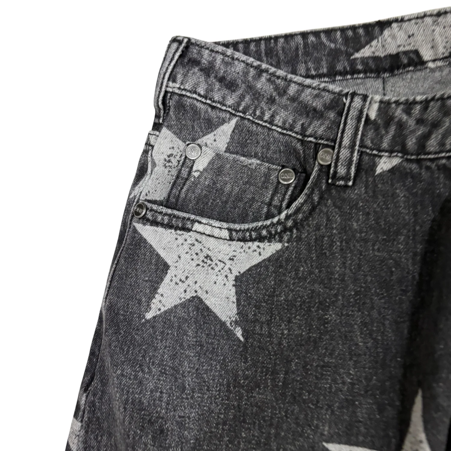 Women's OneTeaspoon jeans featuring a bold star print on dark denim. These jeans are perfect for making a statement with their unique pattern and stylish design. Made of high-quality denim fabric, they provide a comfortable fit ideal for casual wear. These jeans come in a waist size 26, offering a regular fit. Care instructions: machine wash cold with similar colors. #starprint #boldstyle #casualwear