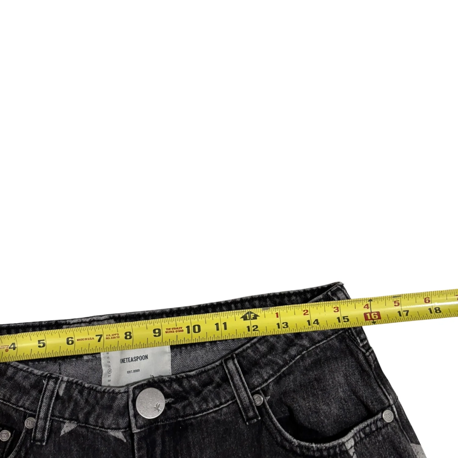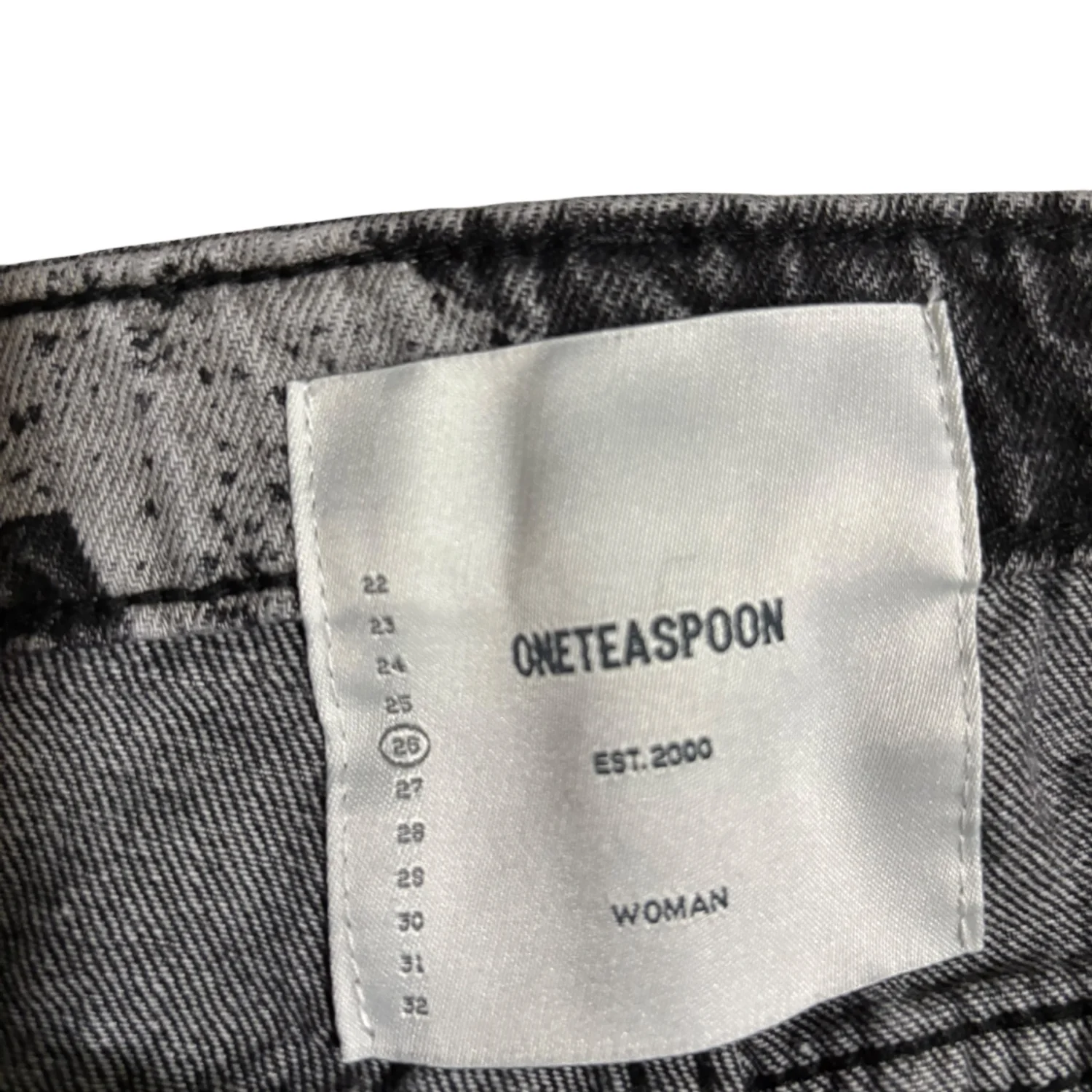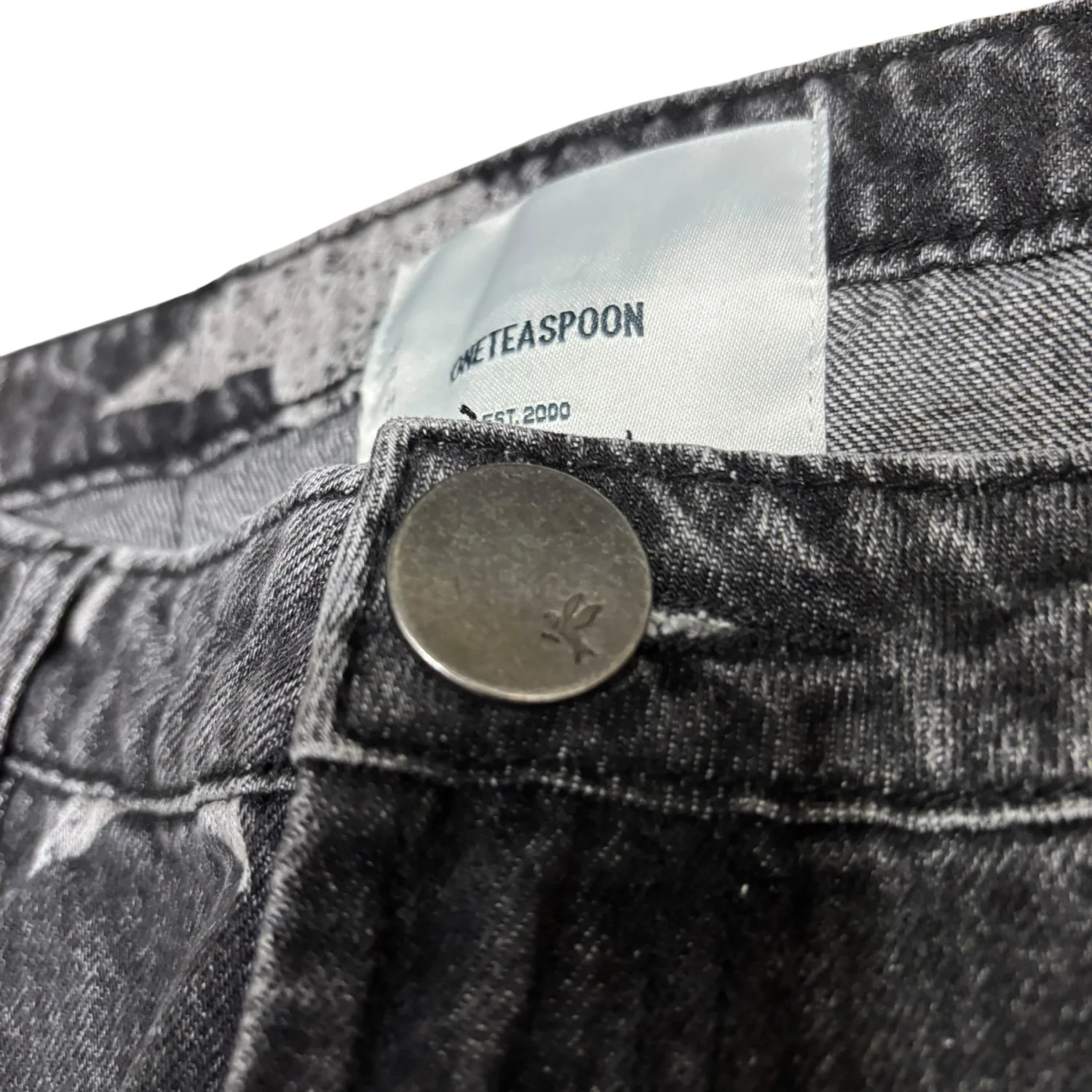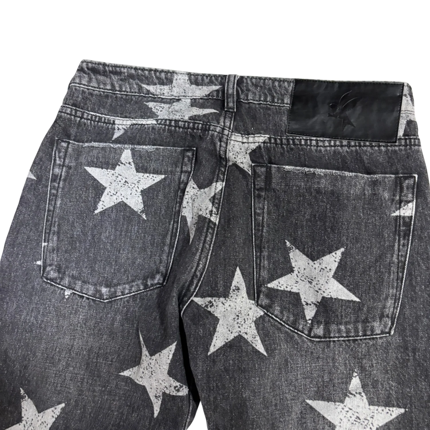 Women's OneTeaspoon jeans featuring a bold star print on dark denim. These jeans are perfect for making a statement with their unique pattern and stylish design. Made of high-quality denim fabric, they provide a comfortable fit ideal for casual wear. These jeans come in a waist size 26, offering a regular fit. Care instructions: machine wash cold with similar colors. #starprint #boldstyle #casualwear