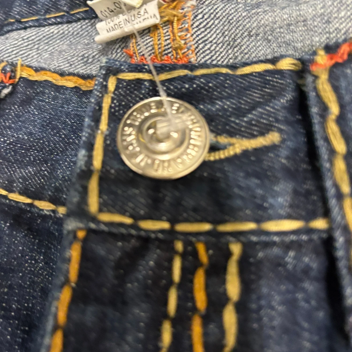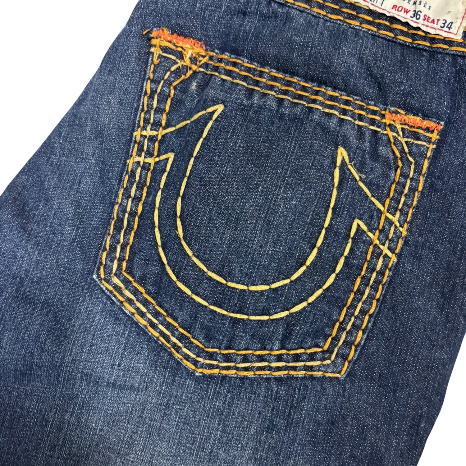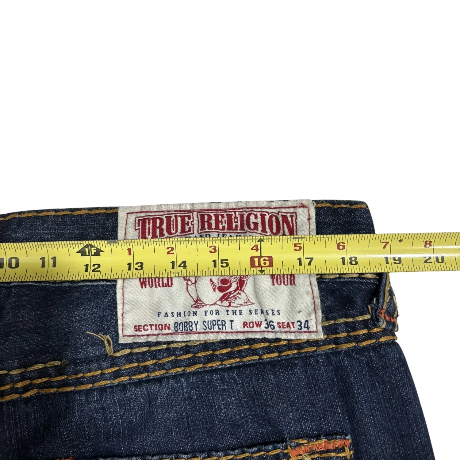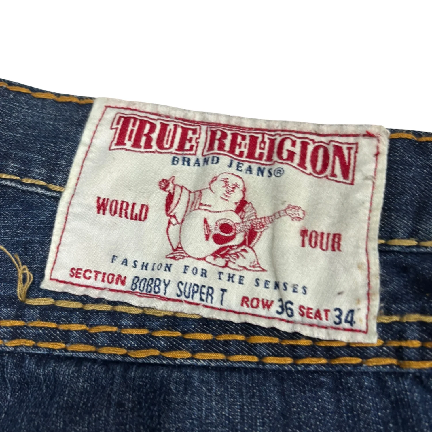These True Religion Bobby Super T Jeans feature a classic blue denim with distinctive yellow contrast stitching. The jeans have an embroidered back pocket logo and metal rivets for durability. Made from high-quality denim, they promise a comfortable fit. Tag reads 'SECTION BOBBY SUPER T, ROW 36, SEAT 34'. Perfect for casual wear. #TrueReligion #Denim #BobbySuperT