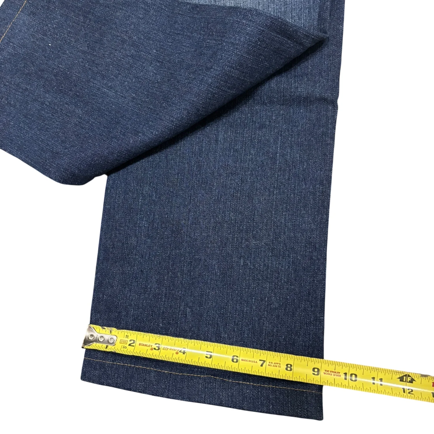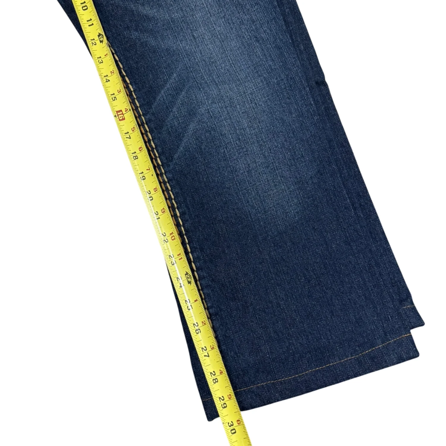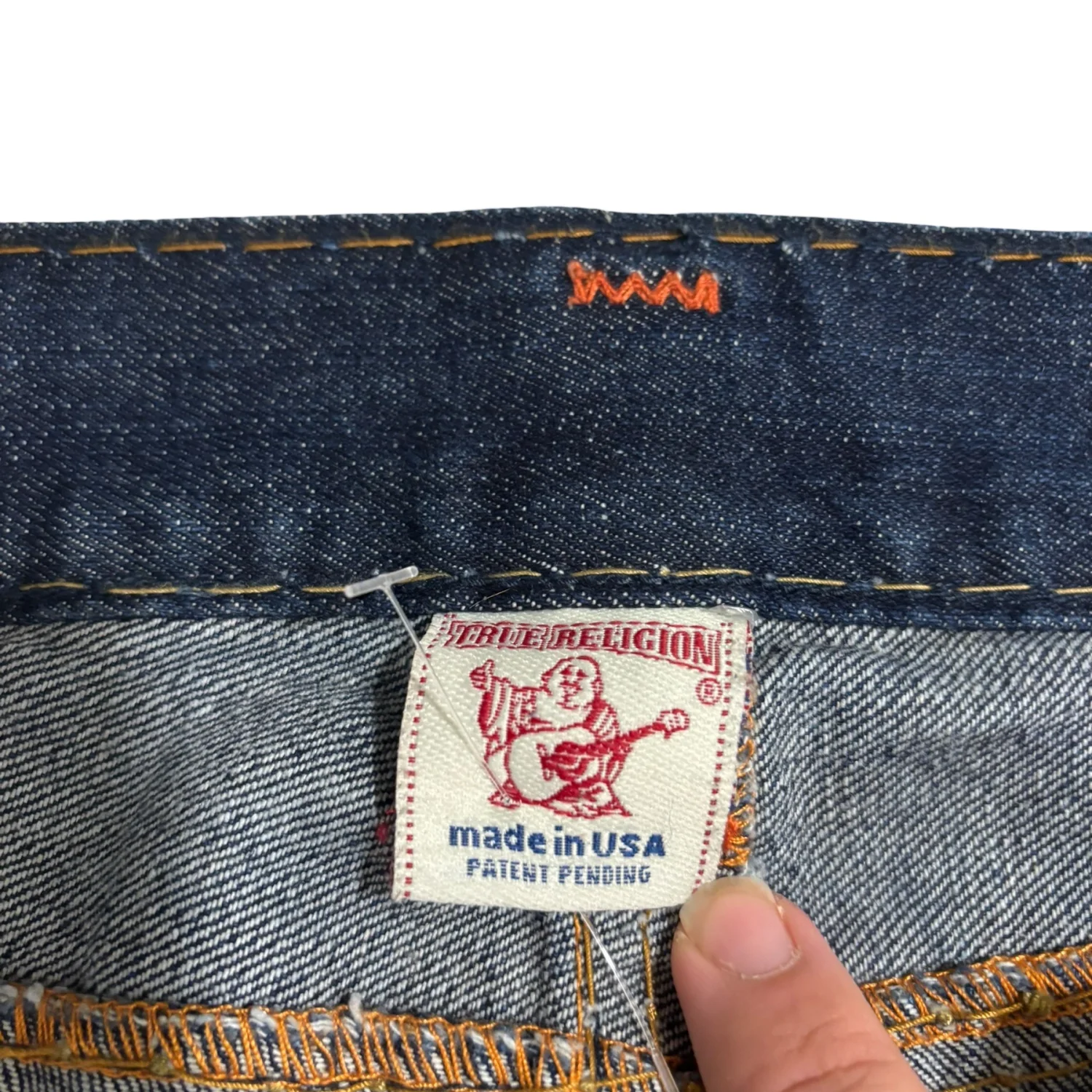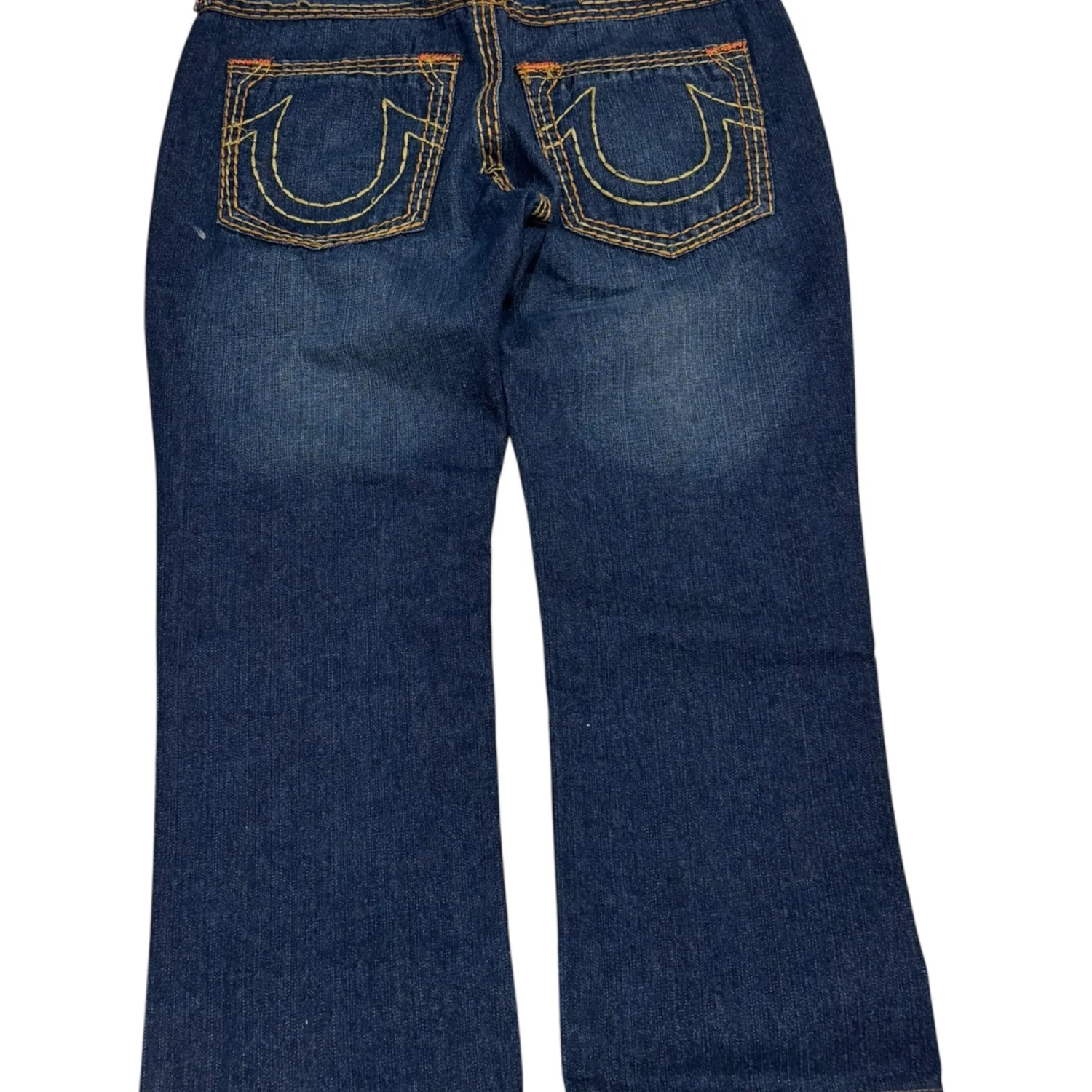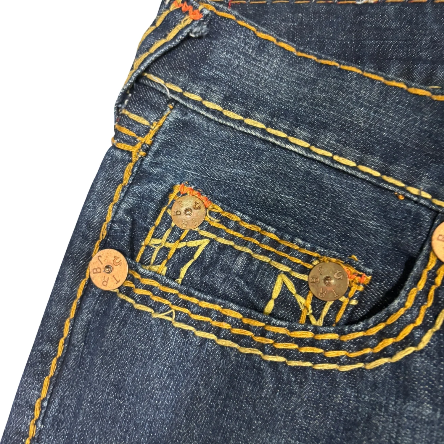 These True Religion Bobby Super T Jeans feature a classic blue denim with distinctive yellow contrast stitching. The jeans have an embroidered back pocket logo and metal rivets for durability. Made from high-quality denim, they promise a comfortable fit. Tag reads 'SECTION BOBBY SUPER T, ROW 36, SEAT 34'. Perfect for casual wear. #TrueReligion #Denim #BobbySuperT