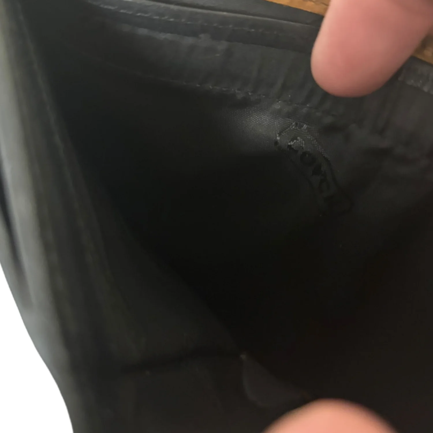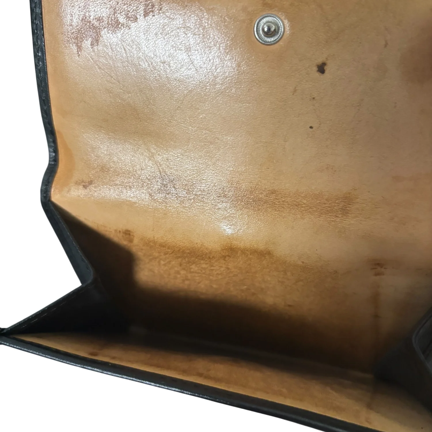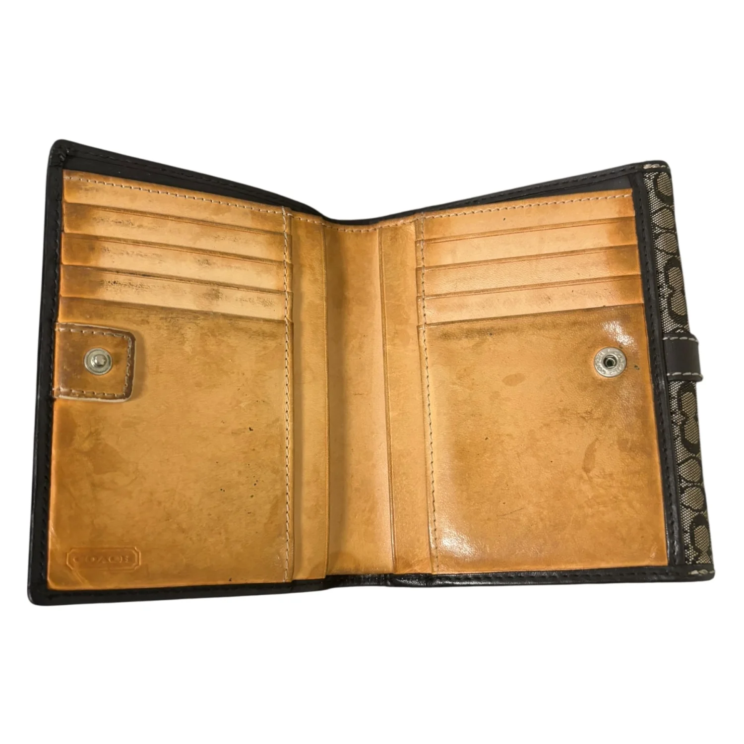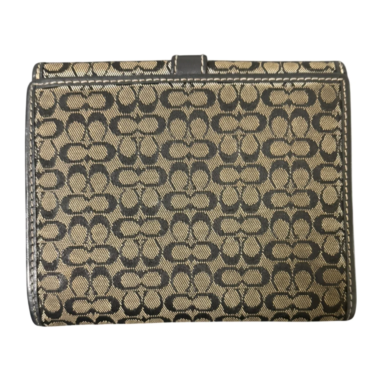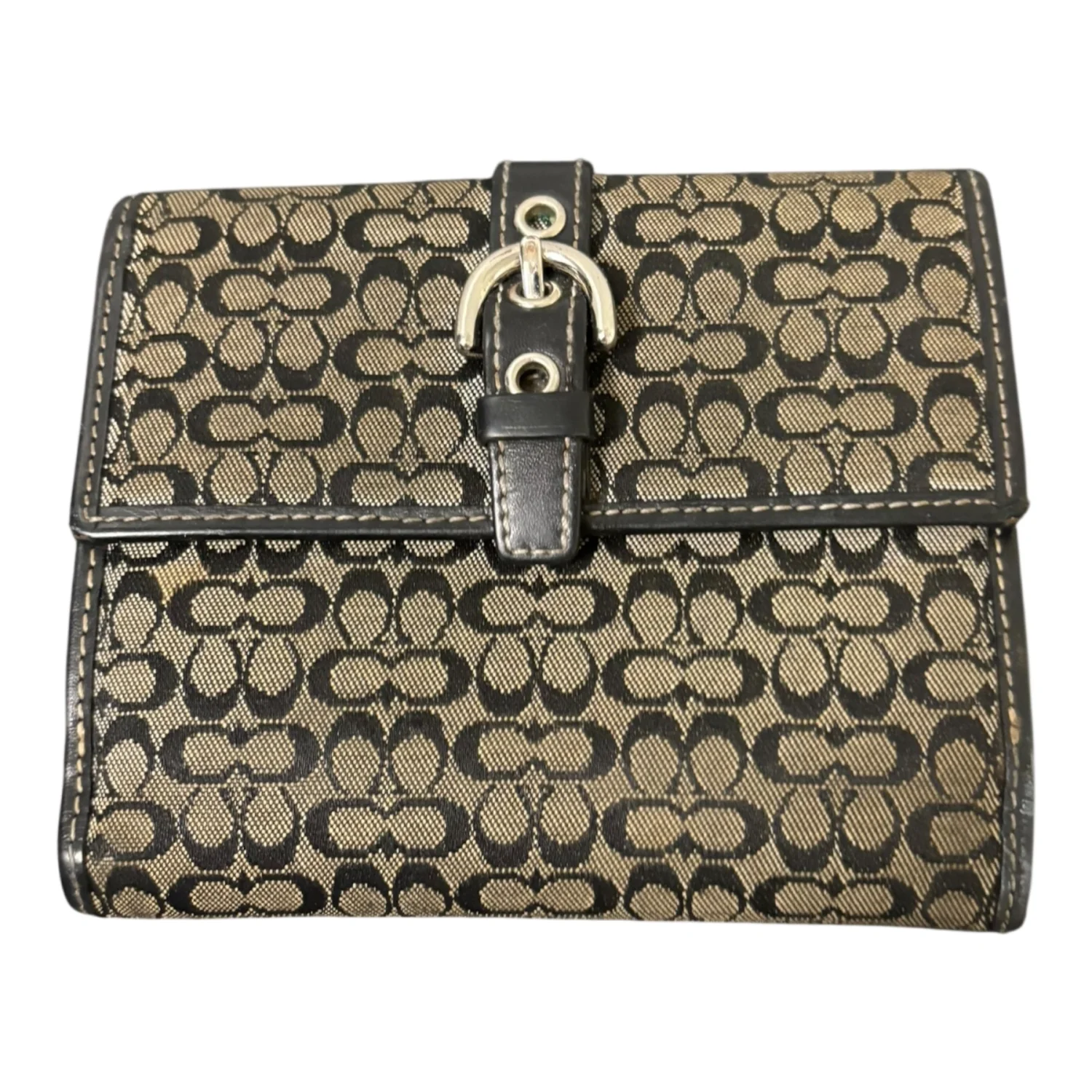 Stylish designer wallet with a signature monogram pattern in beige and black. Features a secure buckle closure and spacious interior with multiple card slots and compartments. Note: Interior shows signs of use and wear. Perfect for adding a touch of elegance to your daily essentials. #designer #wallet #monogram