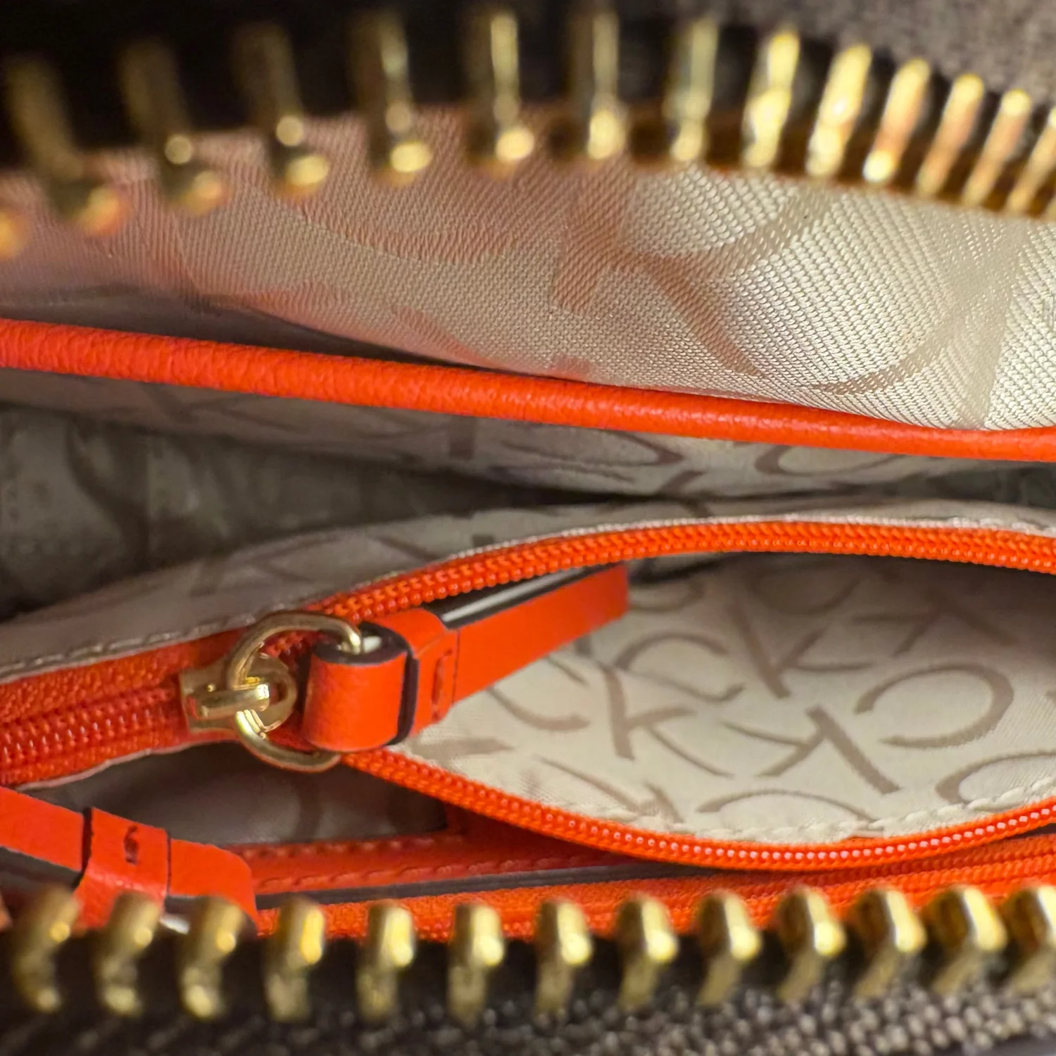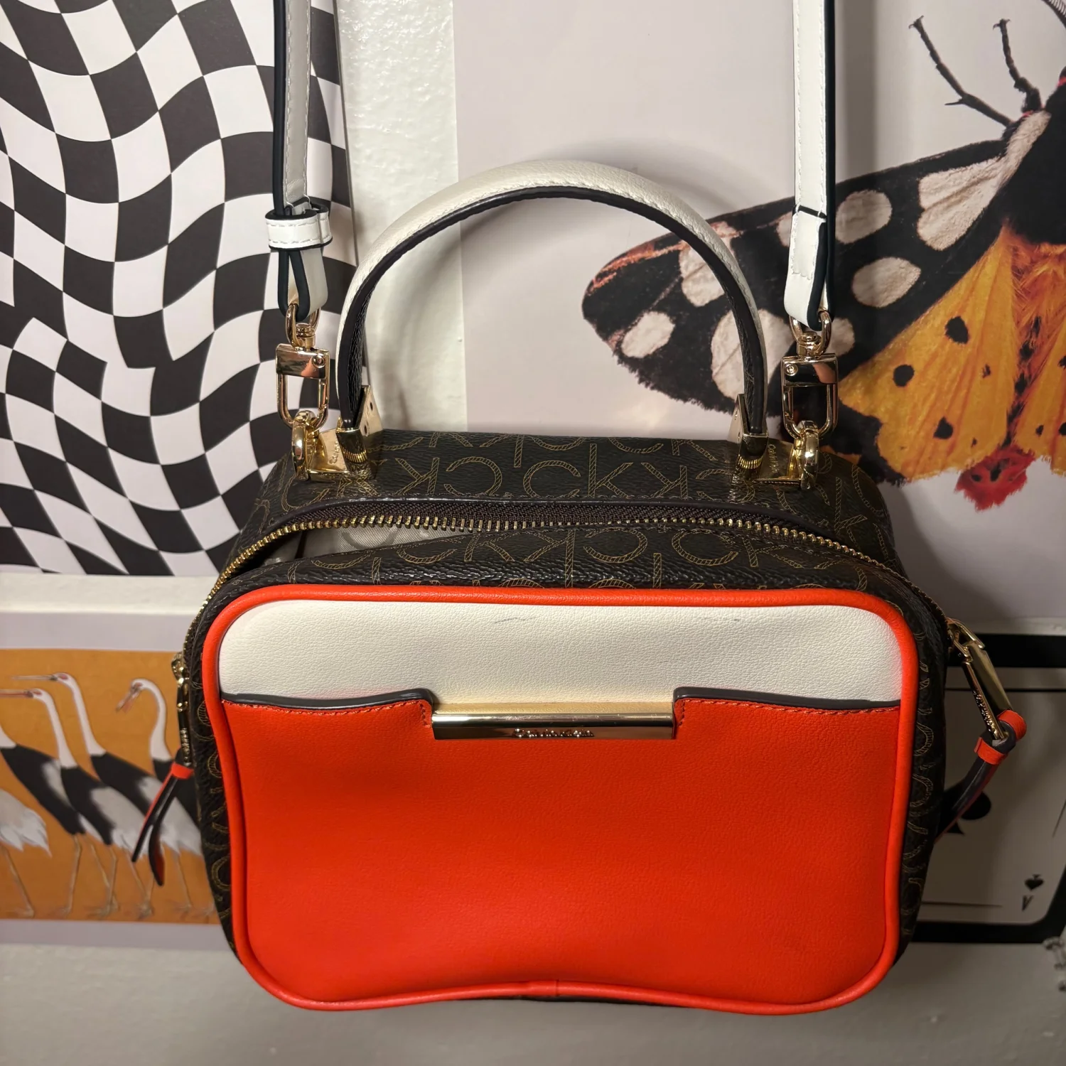 Calvin Klein structured satchel in a bold orange + white colorblock with classic CK monogram sides. Gold hardware, top handle, and adjustable crossbody strap. Interior is clean with CK lining and bright orange trim. Condition: Great overall. Small thin black scuff on exterior (shown in pics). Hardware + interior in excellent shape. Details: • Authentic CK • Orange/white leather + monogram • Zip closure • Multiple interior pockets • Everyday/work size Perfect pop‑of‑color designer bag that still feels polished and modern.