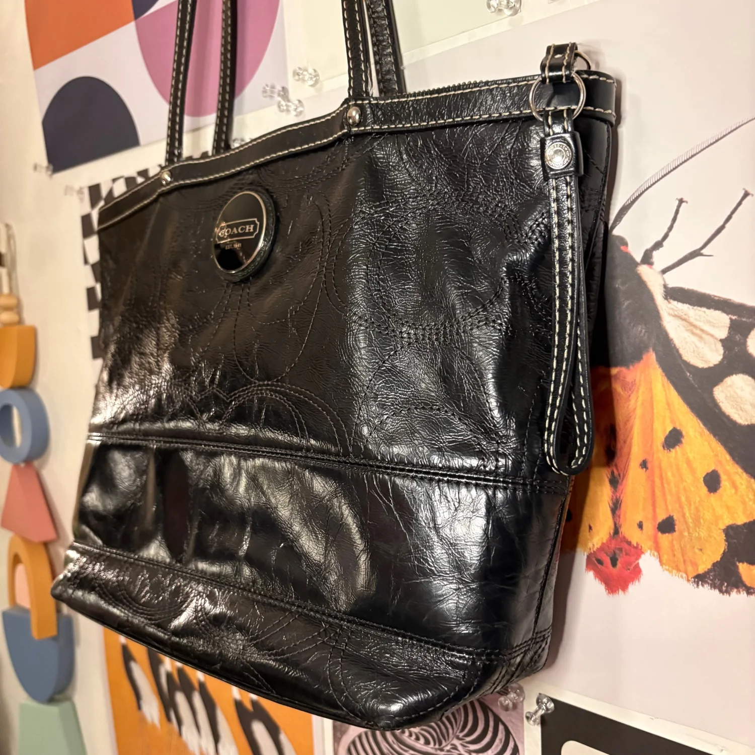Coach Black Embroidered Leather Tote with Silver Hardware