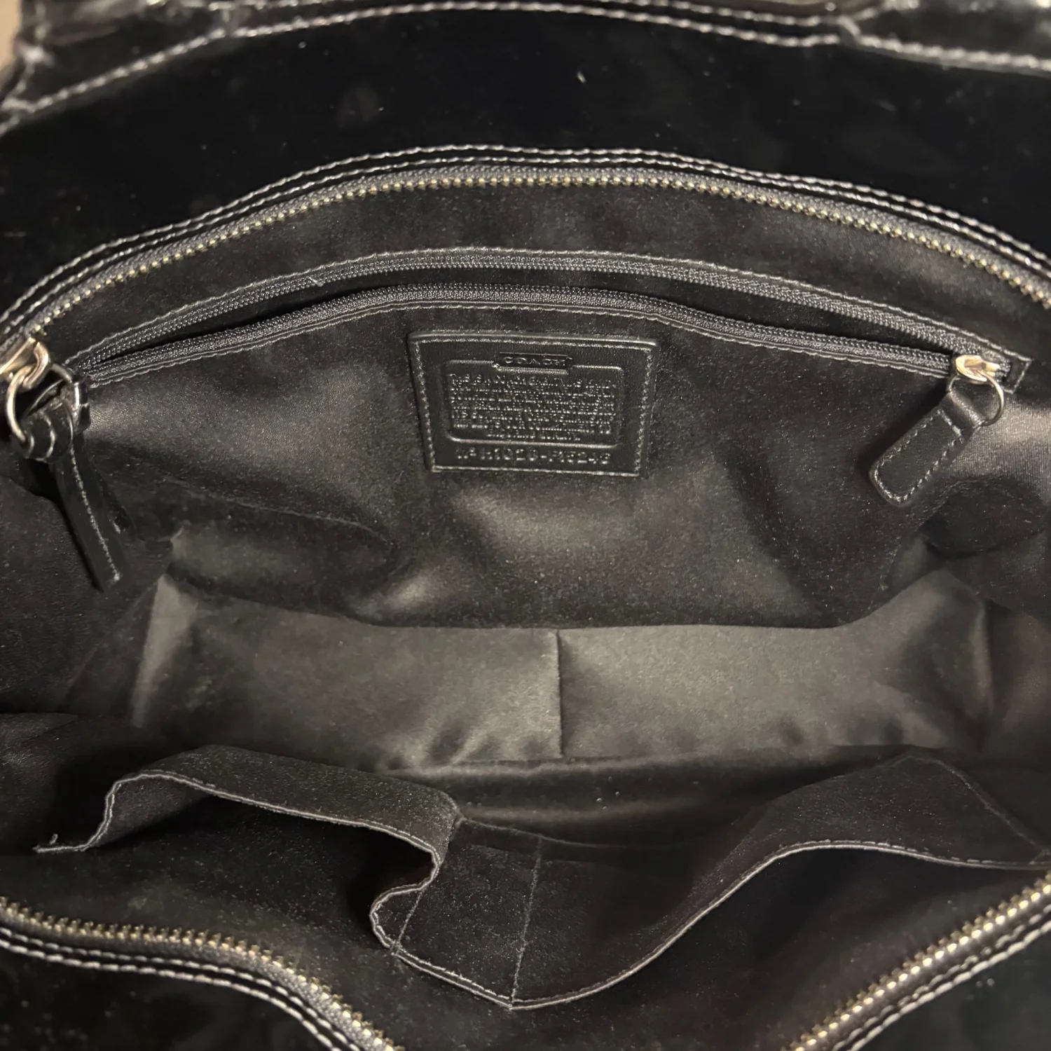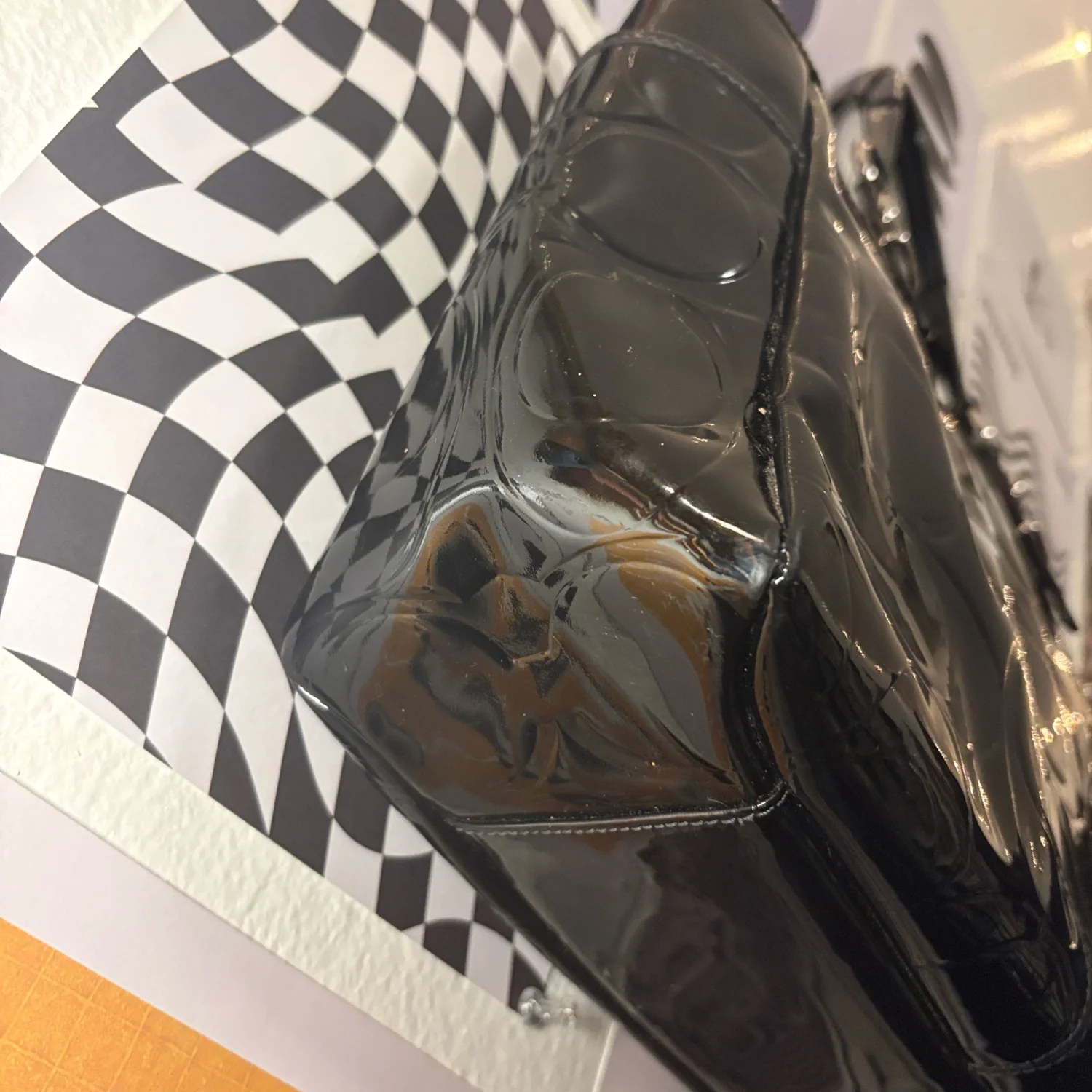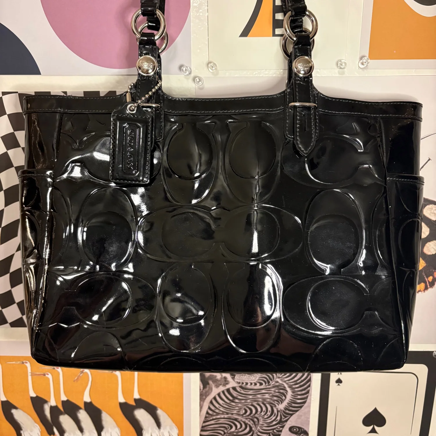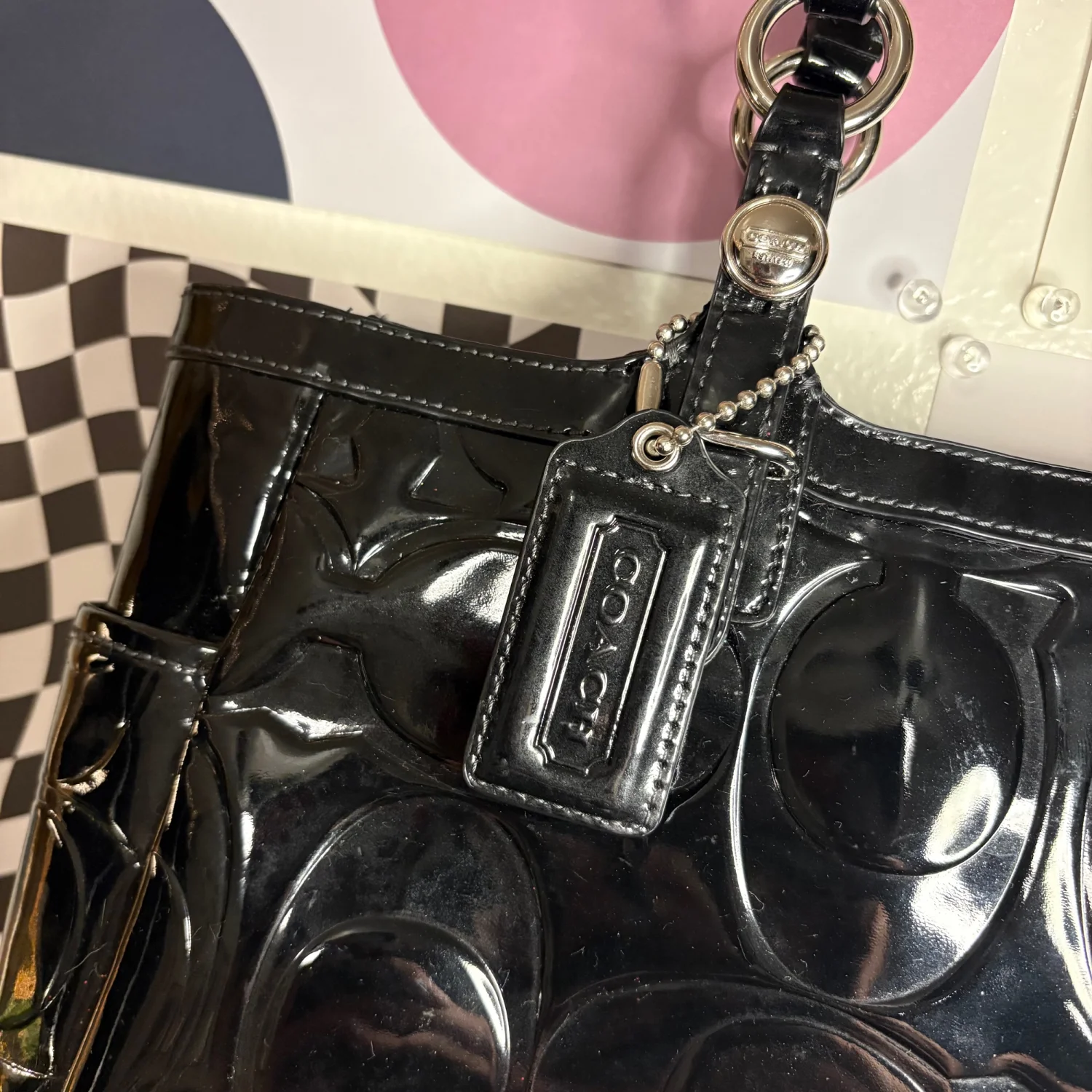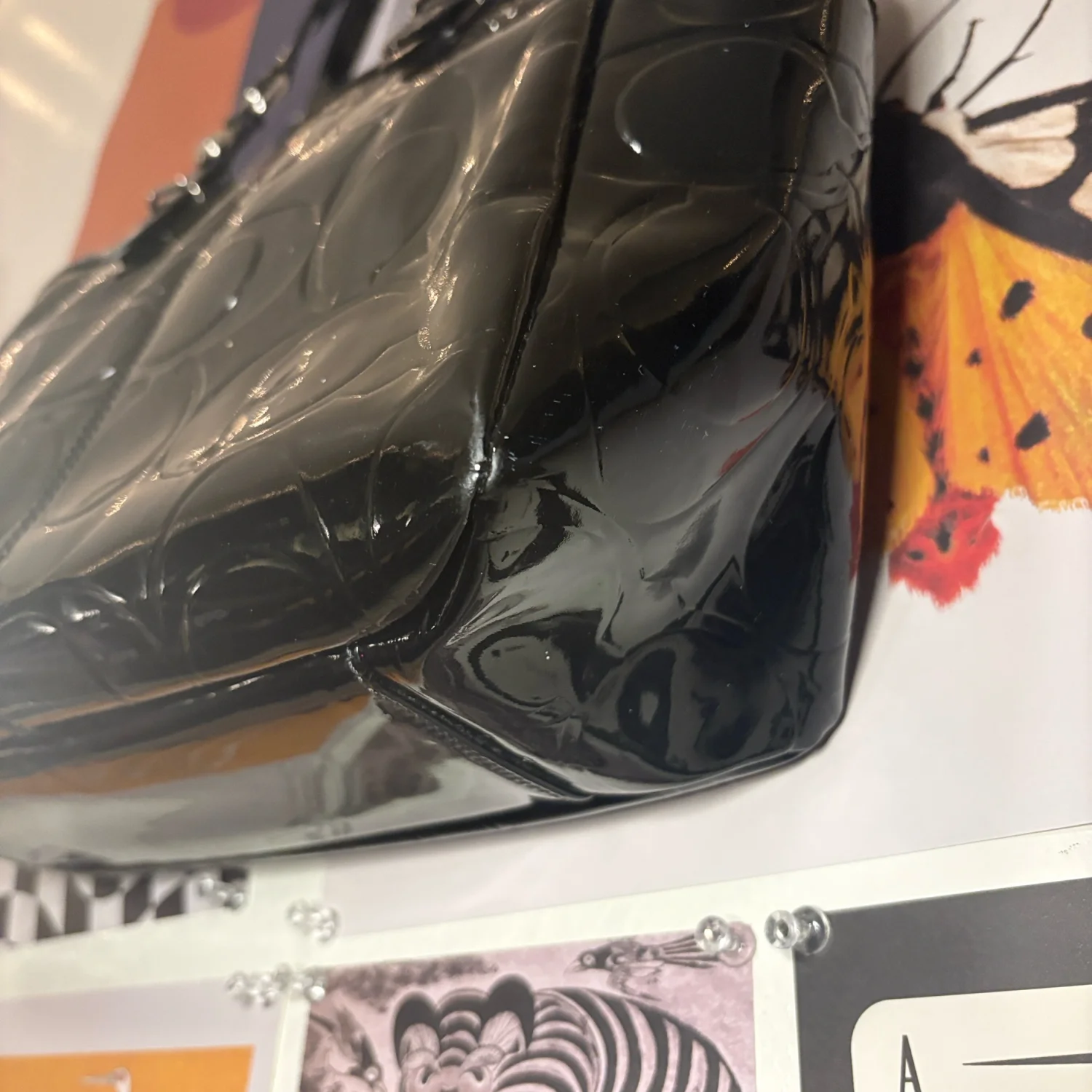 Coach Patent Leather Embossed Satchel – Gloss Black Elegance 🖤 Sleek, structured, and unmistakably Coach. This high-shine patent leather satchel features the iconic embossed “C” motif and polished silver-tone hardware for a modern yet timeless look. • Style: F15246 – Authentic Coach Signature Patent Leather Satchel • Color: Jet black with a mirror-gloss finish • Details: Dual handles with silver rings, Coach hangtag, interior zip pocket + multifunction slots • Interior: Clean and spacious with stitched creed patch (No H1020-F15246) • Condition: Excellent pre-loved condition – minimal signs of wear, no cracking or peeling 🪩 A collector’s favorite from the early 2010s – perfect for elevating everyday fits or adding a sleek accent to your night-out look. Dimensions strap drop - 8 inches depth - approx. 5 inches. width - 15.5 inches height - 9 inches