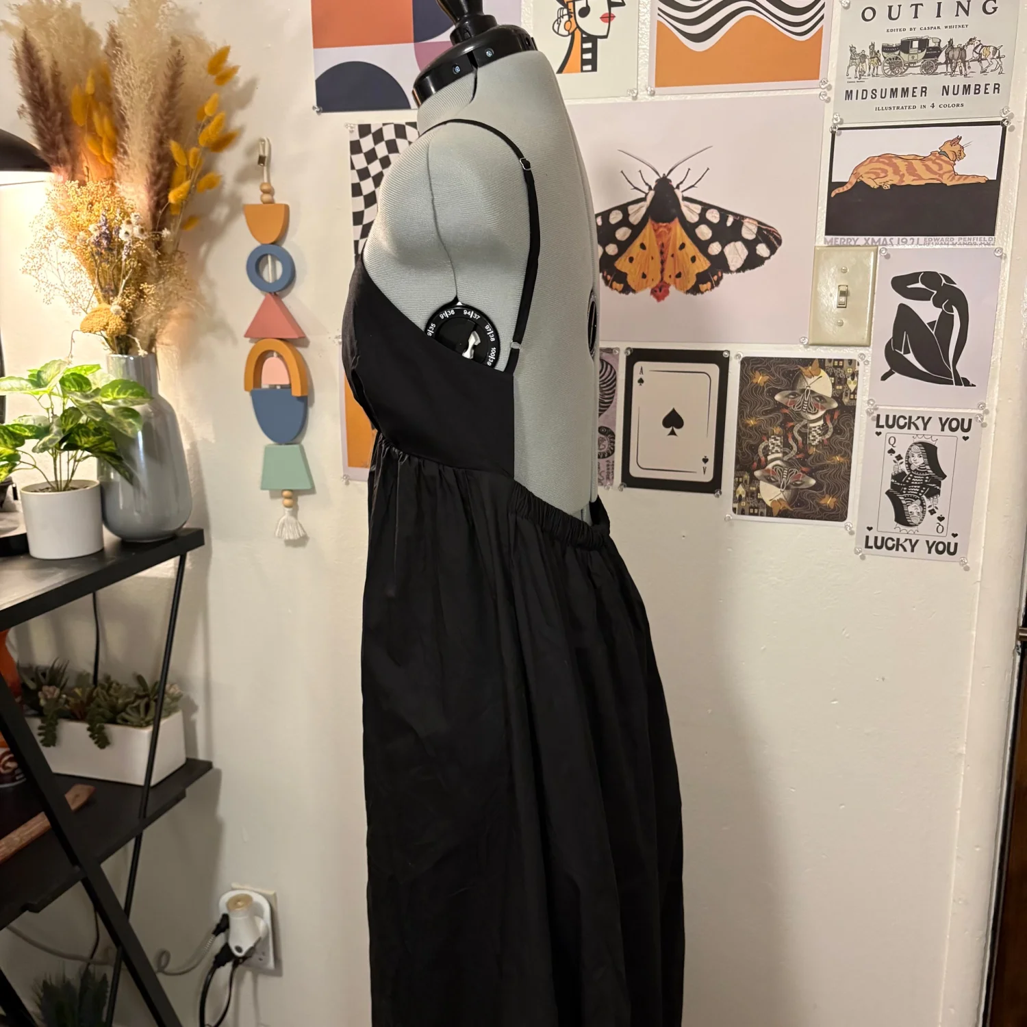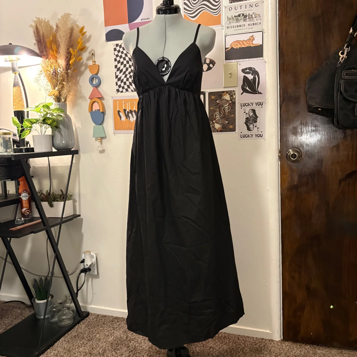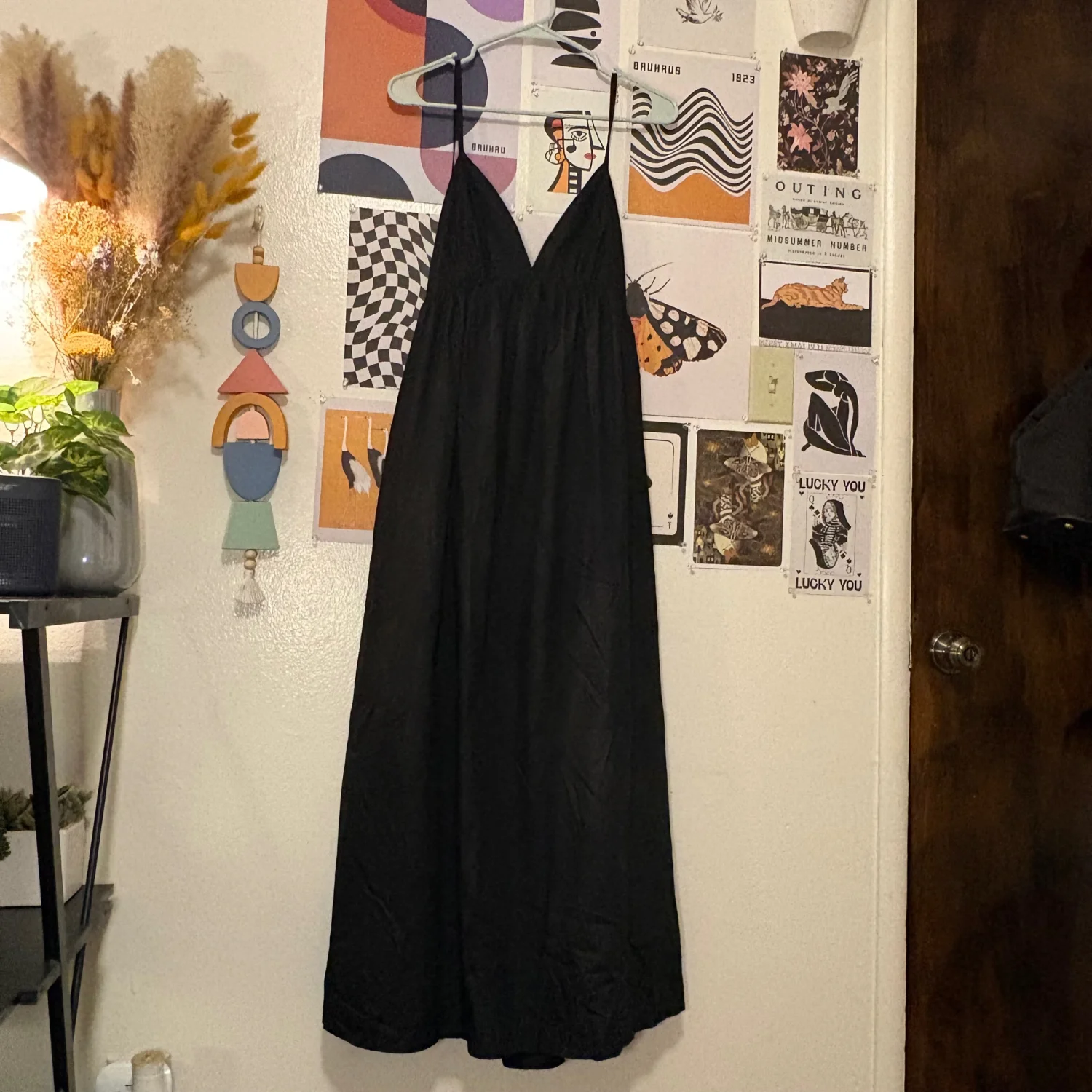 🖤 COMMENSE black maxi dress 🖤 Modern minimalism meets editorial drama in this flowing black maxi by Commense. Features a deep V neckline, adjustable straps with metal ring detail, and a gathered seam that adds subtle volume to the skirt. Lightweight and fluid—perfect for layering or wearing solo with statement accessories. 💌 Tagged size M — best for S-M depending on desired fit 🌙 NWT 🎀 For the I-Feel-Good-ism (brand tag quote)