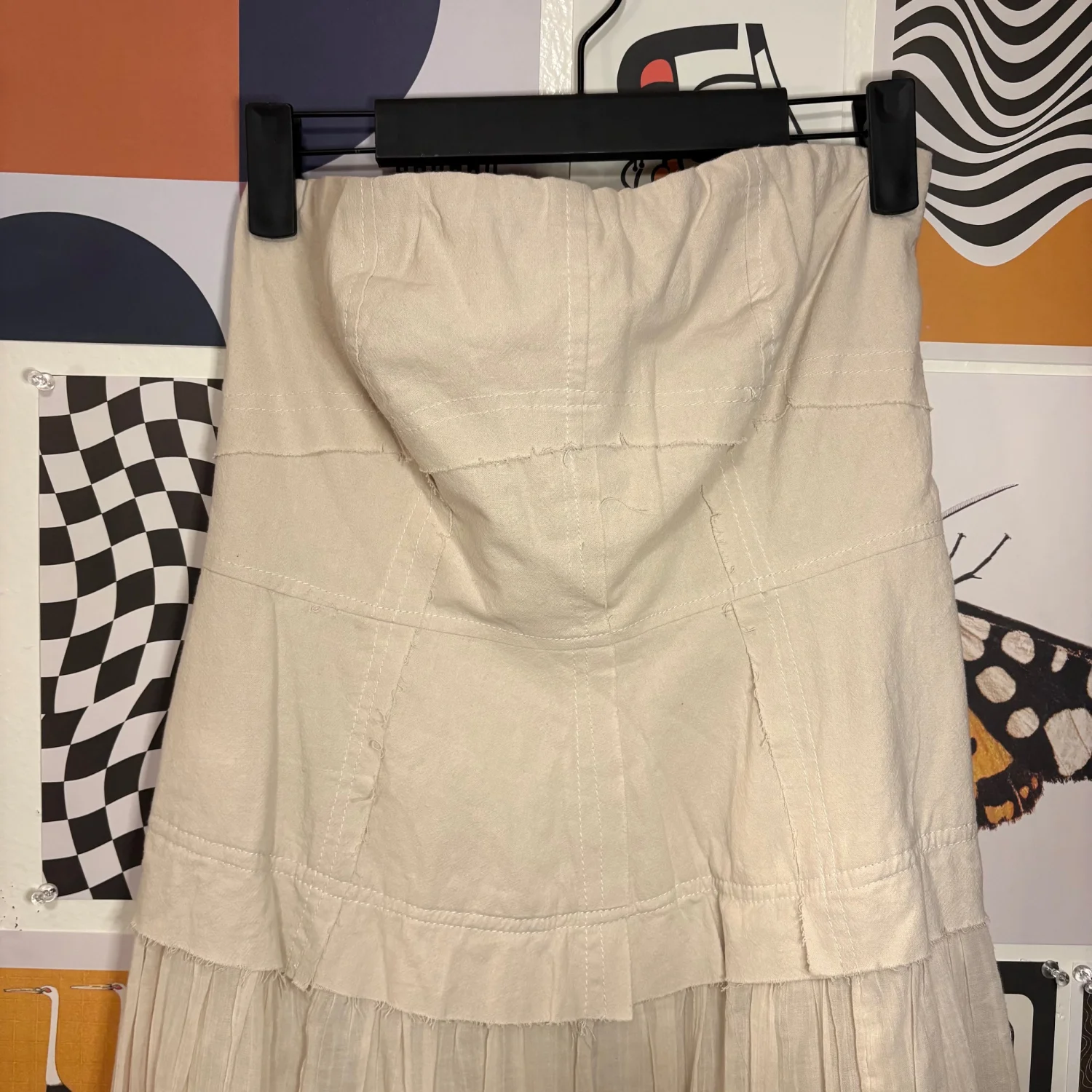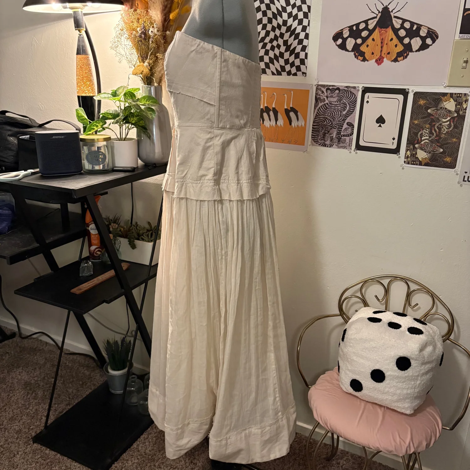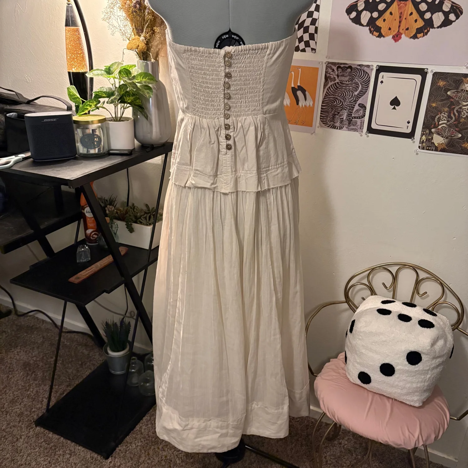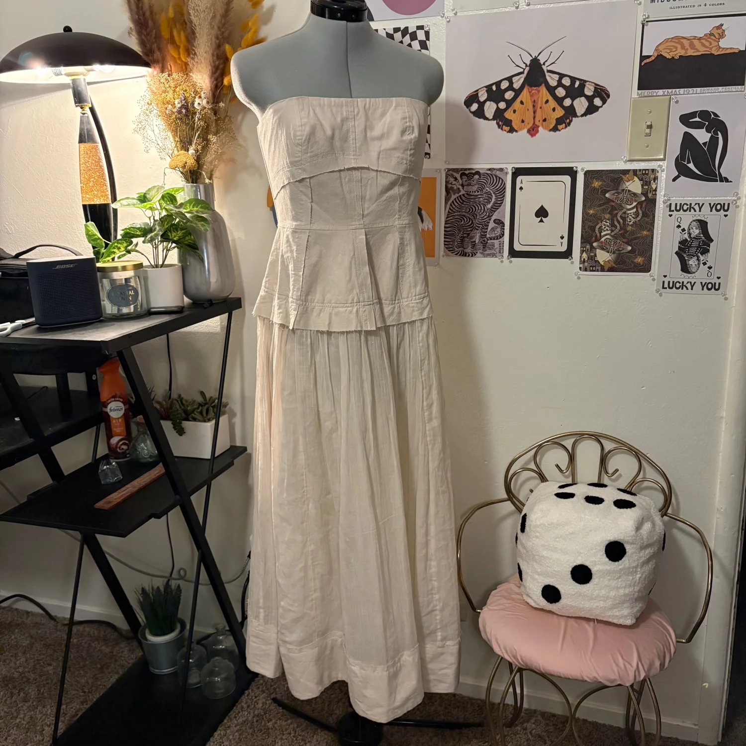 🤍 Free People NWT Strapless Maxi – Soft Prairie Elegance 🤍 New with tags and full of romantic charm, this Free People dress is a collector’s dream. With a smocked bodice, natural wood-toned buttons, and a tiered, crinkled skirt, it evokes sunlit meadows and vintage summer diaries. Built-in boning adds structure and support, making it as flattering as it is effortless. • Color: Cream / soft ivory • Style: Strapless maxi with smocked bodice + button front • Structure: Built-in boning for added support and shape • Details: Tiered skirt, lightweight texture, raw hem finish • Condition: Brand new with tags attached • Size: Small 🕊️ Perfect for layering with a chunky knit or worn solo for a barefoot boho vibe. 📏 Measurements available upon request