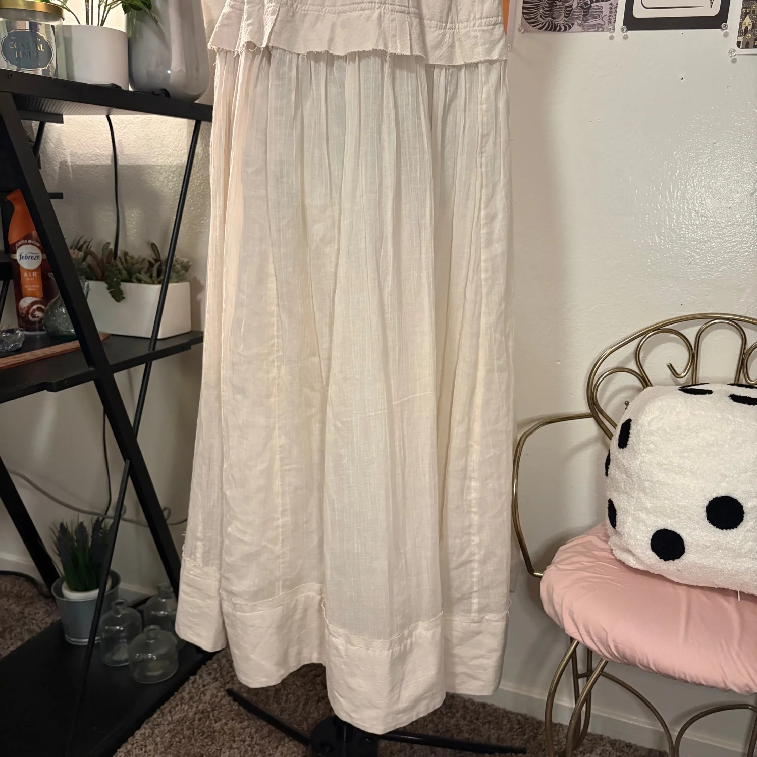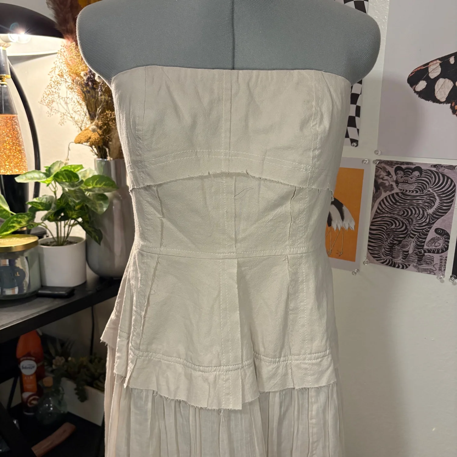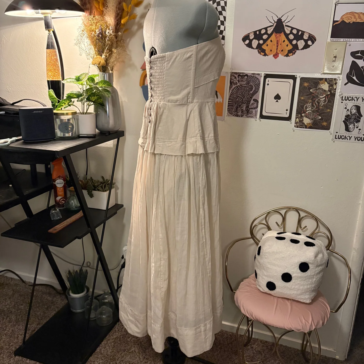 🤍 Free People NWT Strapless Maxi – Soft Prairie Elegance 🤍 New with tags and full of romantic charm, this Free People dress is a collector’s dream. With a smocked bodice, natural wood-toned buttons, and a tiered, crinkled skirt, it evokes sunlit meadows and vintage summer diaries. Built-in boning adds structure and support, making it as flattering as it is effortless. • Color: Cream / soft ivory • Style: Strapless maxi with smocked bodice + button front • Structure: Built-in boning for added support and shape • Details: Tiered skirt, lightweight texture, raw hem finish • Condition: Brand new with tags attached • Size: Small 🕊️ Perfect for layering with a chunky knit or worn solo for a barefoot boho vibe. 📏 Measurements available upon request