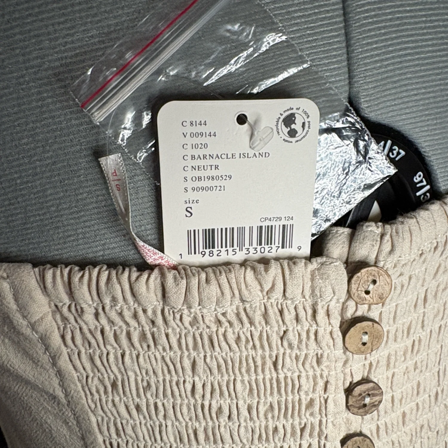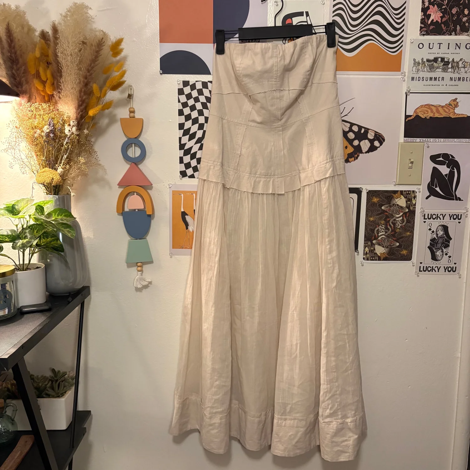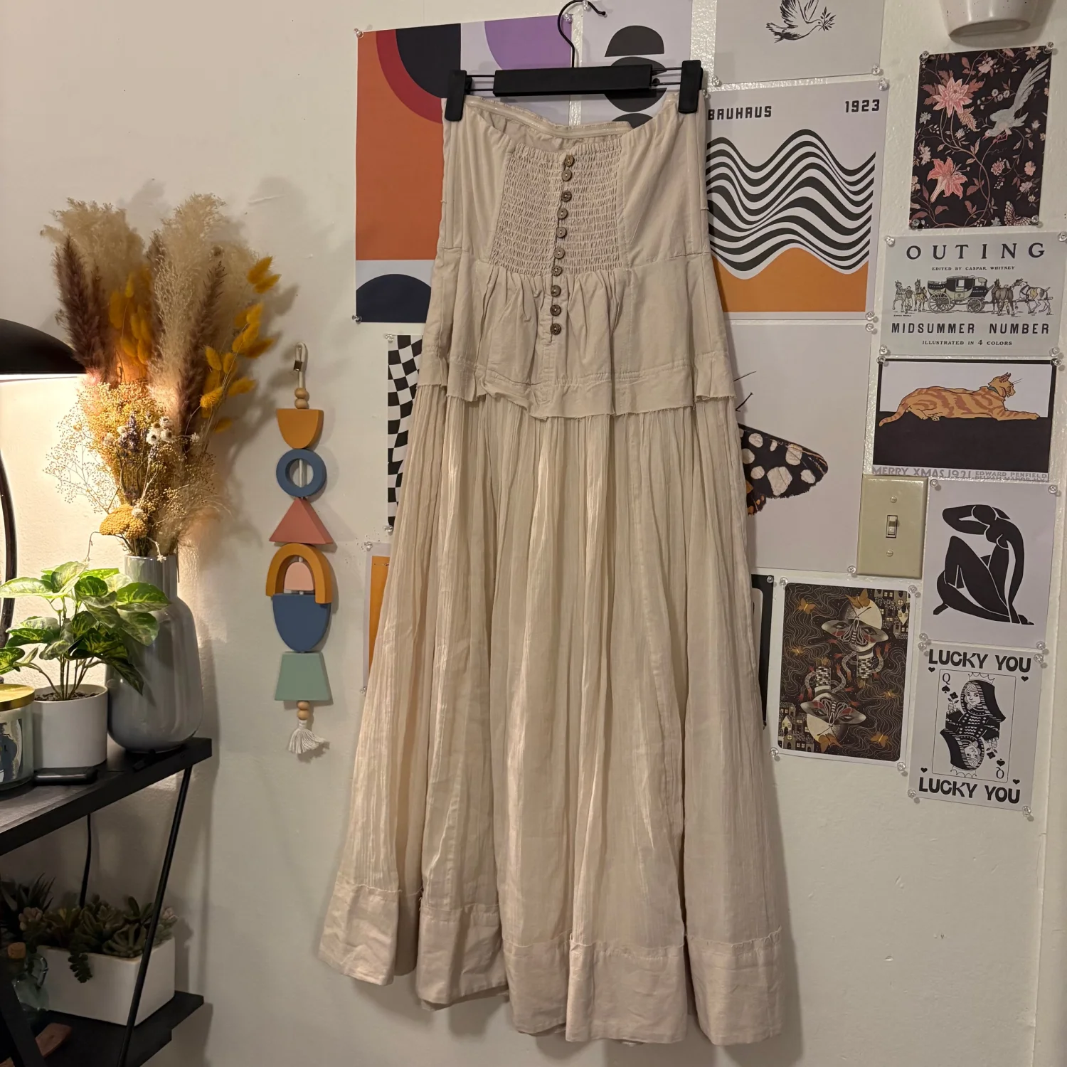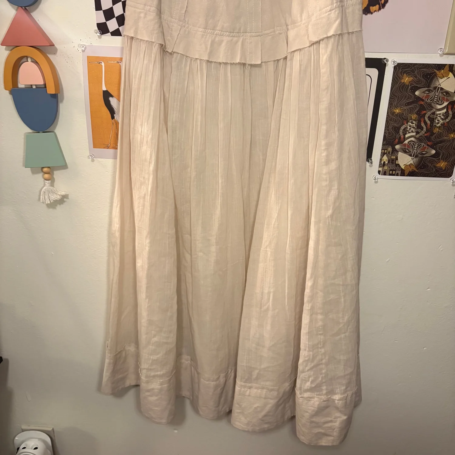 🤍 Free People NWT Strapless Maxi – Soft Prairie Elegance 🤍 New with tags and full of romantic charm, this Free People dress is a collector’s dream. With a smocked bodice, natural wood-toned buttons, and a tiered, crinkled skirt, it evokes sunlit meadows and vintage summer diaries. Built-in boning adds structure and support, making it as flattering as it is effortless. • Color: Cream / soft ivory • Style: Strapless maxi with smocked bodice + button front • Structure: Built-in boning for added support and shape • Details: Tiered skirt, lightweight texture, raw hem finish • Condition: Brand new with tags attached • Size: Small 🕊️ Perfect for layering with a chunky knit or worn solo for a barefoot boho vibe. 📏 Measurements available upon request