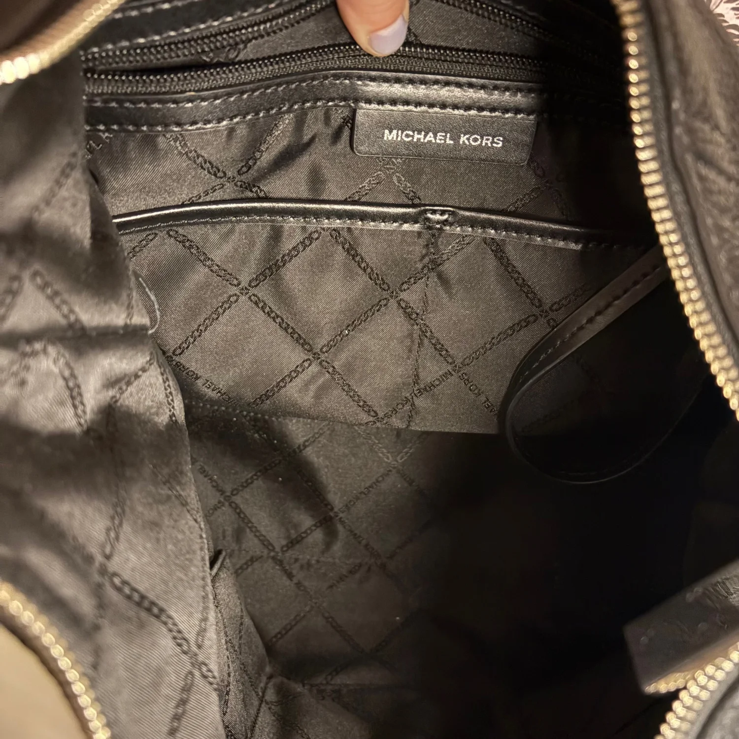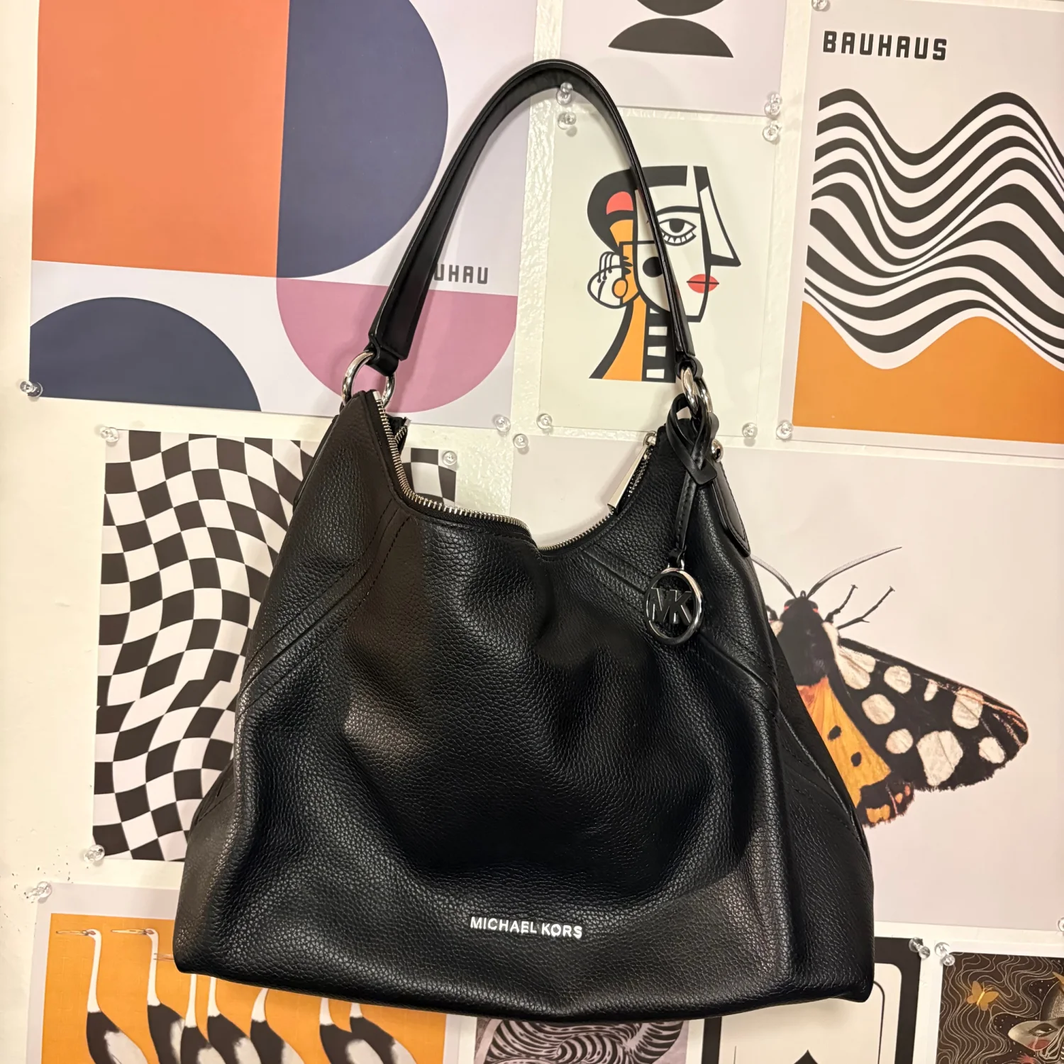 Michael Kors Pebbled Leather Shoulder Bag A timeless staple with a luxe edge. This black pebbled leather shoulder bag features silver-tone hardware, a zip-top closure, and the iconic MK charm for a touch of polish. Spacious enough for daily essentials, yet sleek enough for elevated styling. ✨ Details: • Authentic Michael Kors • Pebbled leather exterior • Silver-tone MK logo charm • Zip-top closure • Interior zip pocket + slip compartments • Clean MK-branded lining • Approx. 13” W x 10” H x 4” D • Strap drop: 9” 💌 Style tip: Perfect with vintage denim, oversized blazers, or a slip dress layered with a leather jacket.