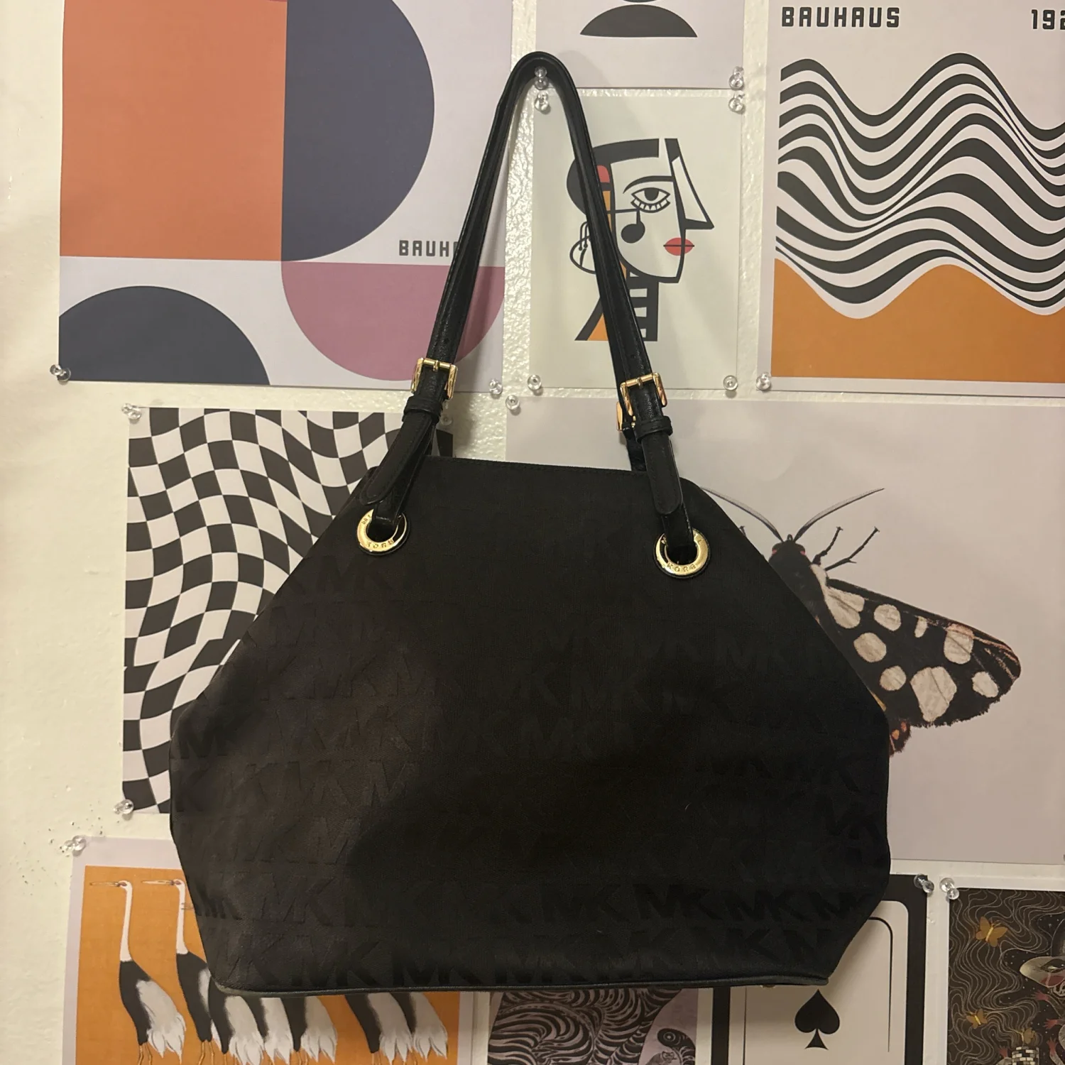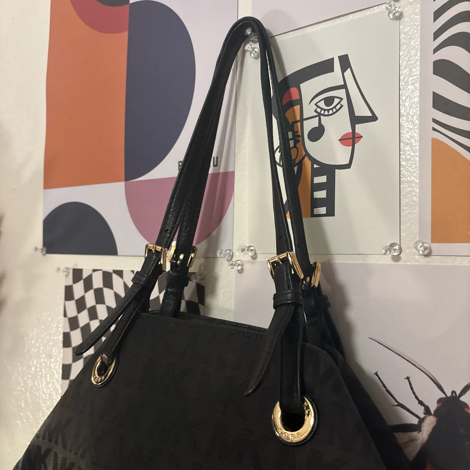 Michael Kors Jet Set Grab Bag with gold hardware and monogram pattern #michaelkors #monogram #purse #bag #womens #MK Stylish and versatile, the Michael Kors Black Grab Bag is perfect for any occasion. Its sleek design and spacious interior make it a must-have accessory. Women’s purse, Michael Kors, MK, handbag, purse, bag, grab bag, jet set, monogram, casual, minimalist, contemporary measurements (taken with bag laying flat) • length - 16 inches • depth - 6.5 inches • height - 10.5 inches • strap drop (currently) - 9 inches