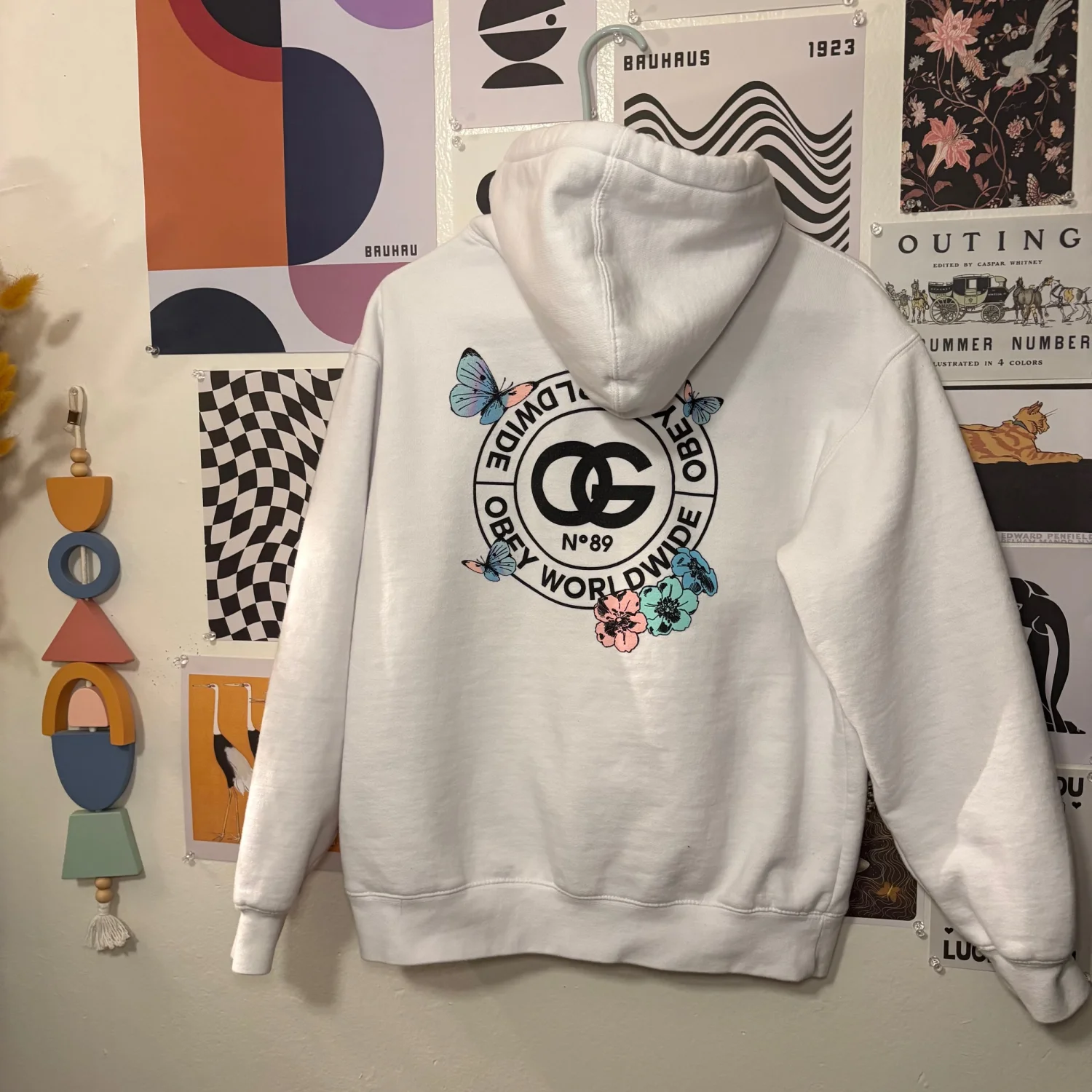 OBEY Worldwide White Hoodie — Tagged L (fits more like M) Soft white pullover featuring pastel butterfly + floral graphics with OBEY’s signature circular “No 89” design on the front and back. A standout streetwear piece with a softer, nature‑inspired vibe. Condition: Excellent, no flaws noted Size: Tagged L — fits snug, best for a modern Medium Measurements: • Pit to pit: 21” • Length: 25” Great everyday hoodie for layering, streetwear styling, or adding a pop of graphic detail to your wardrobe.