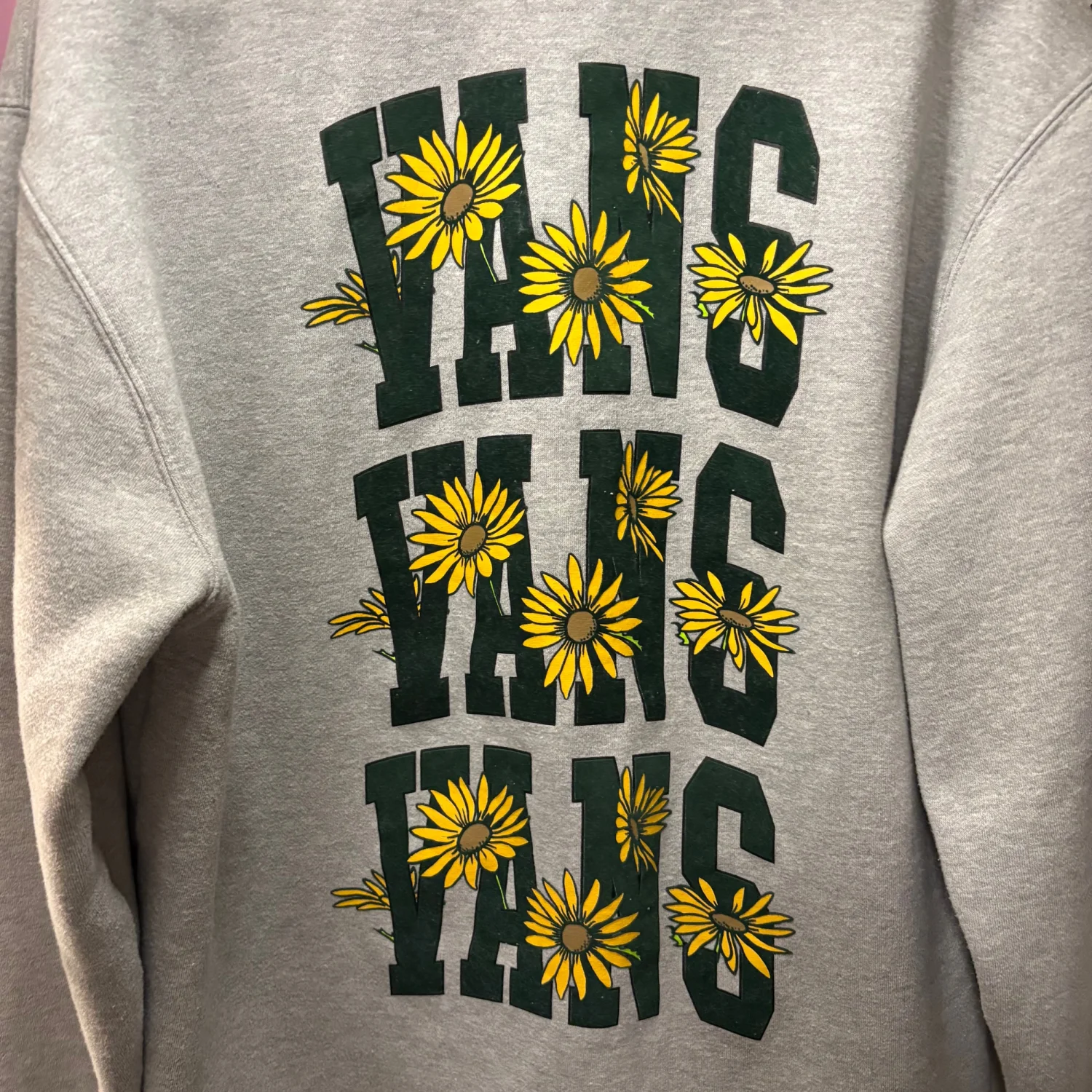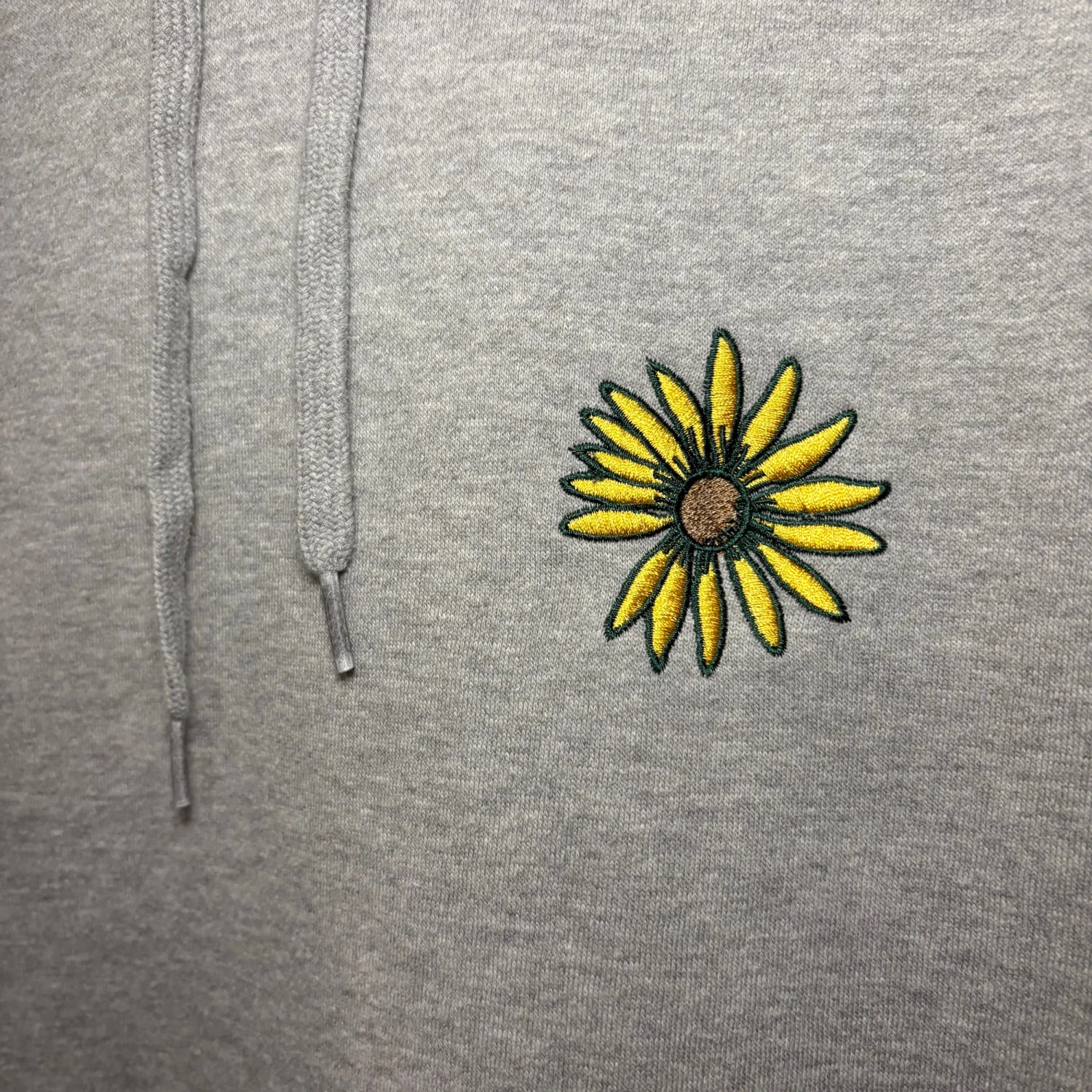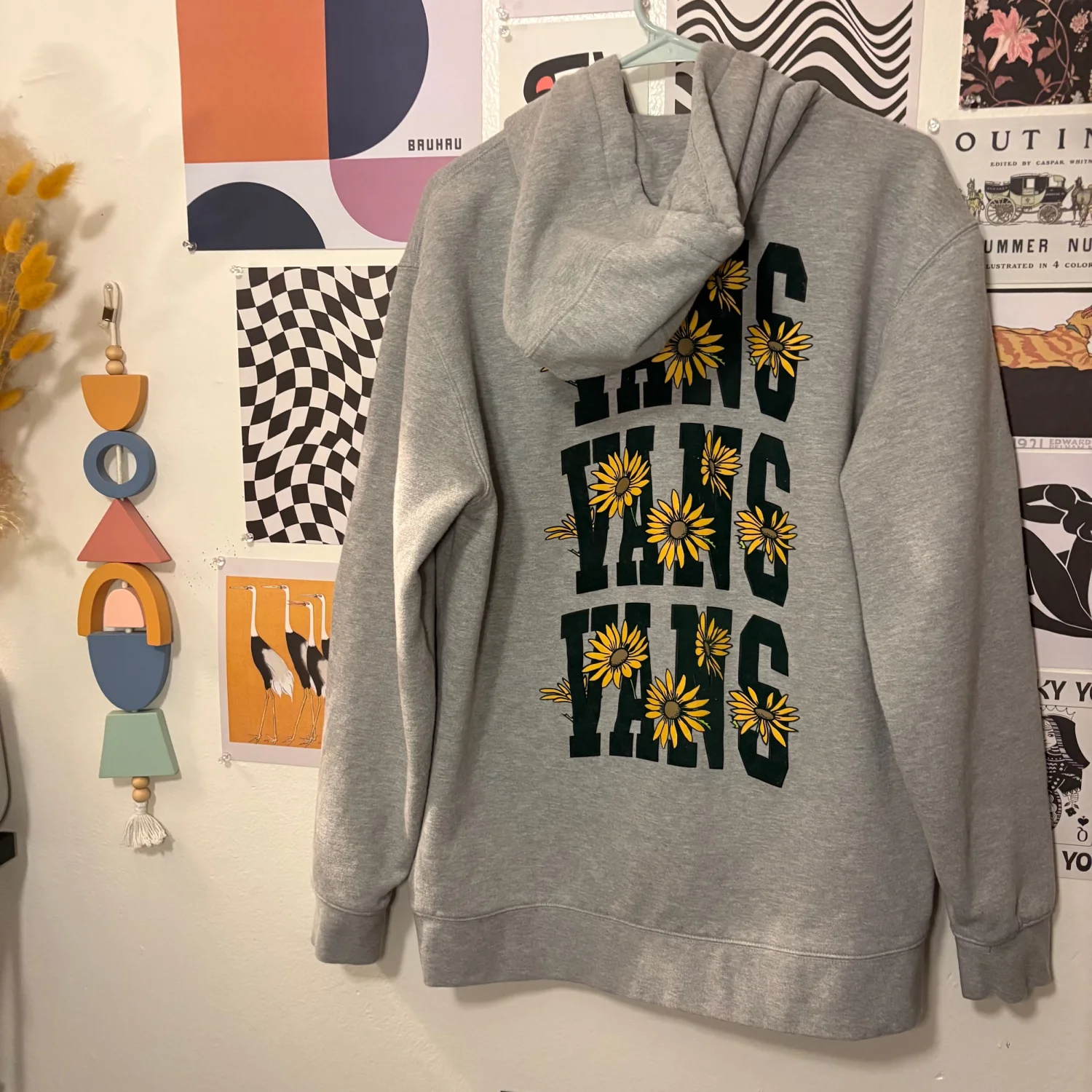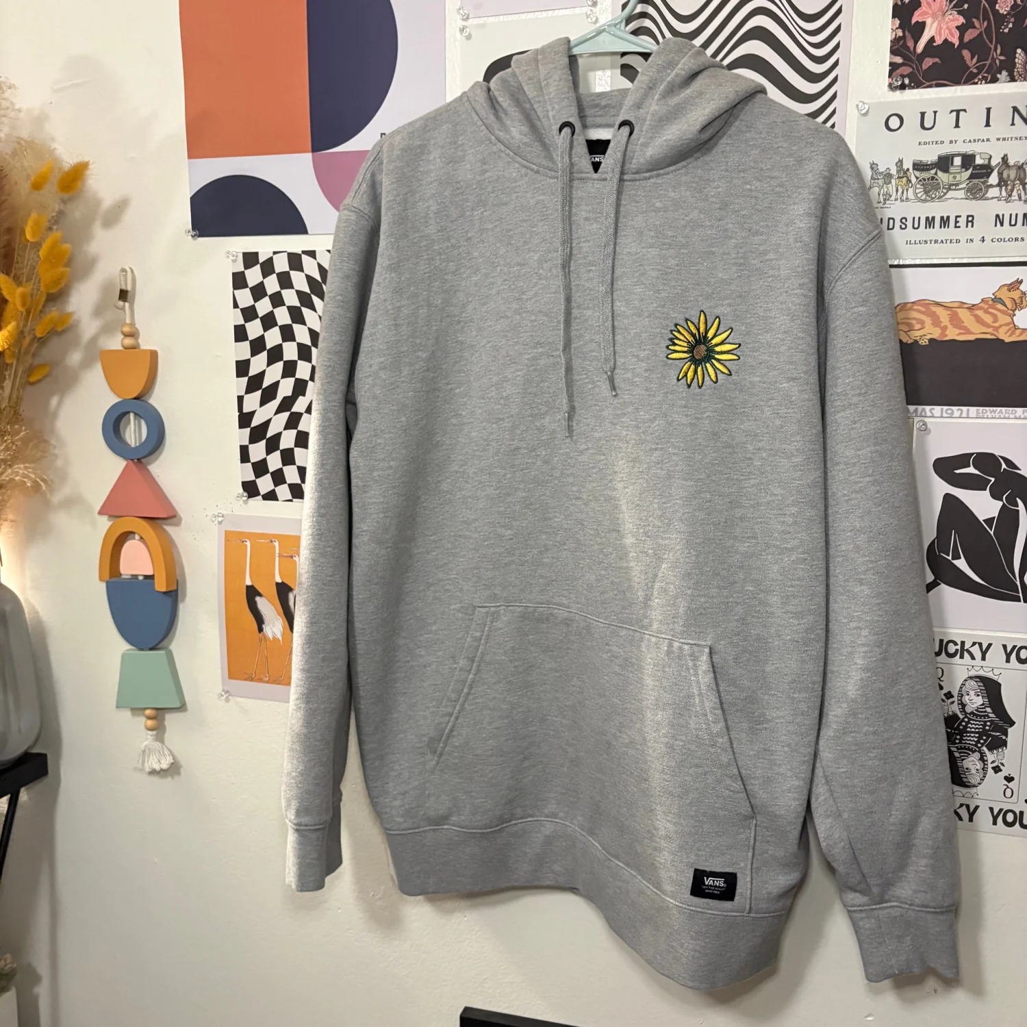 VANS Sunflower Hoodie – Size L Heather gray Vans hoodie featuring green block logo graphics accented with yellow daisy details across the front and back. Small sunflower embroidery at the chest and classic Vans branding at the hem. Soft fleece interior, metal eyelets, and drawstring hood for an easy everyday fit. Size: Large Measurements: Pit to pit 22.5” • Length approx. 29” Condition: Excellent, no noted flaws A cozy, collectible Vans piece with a subtle floral twist.