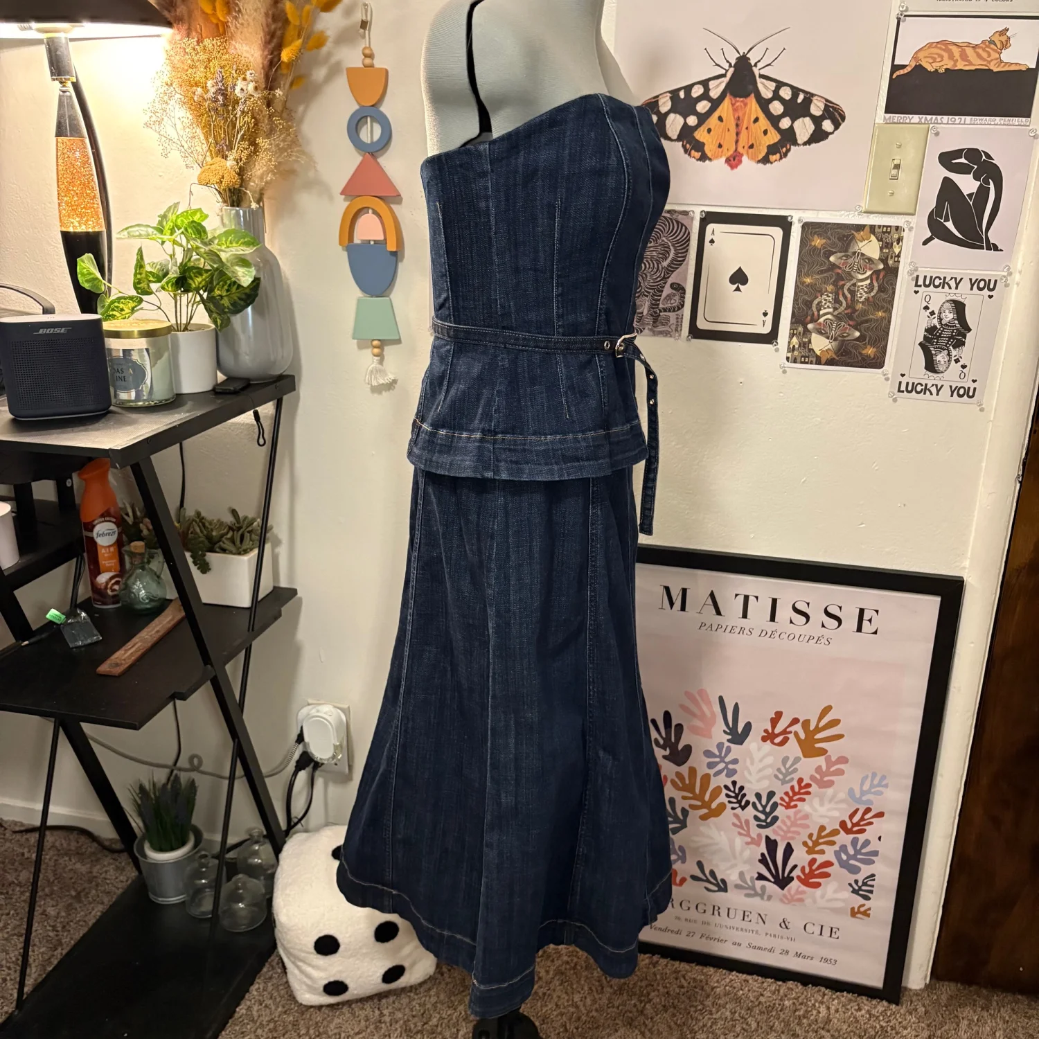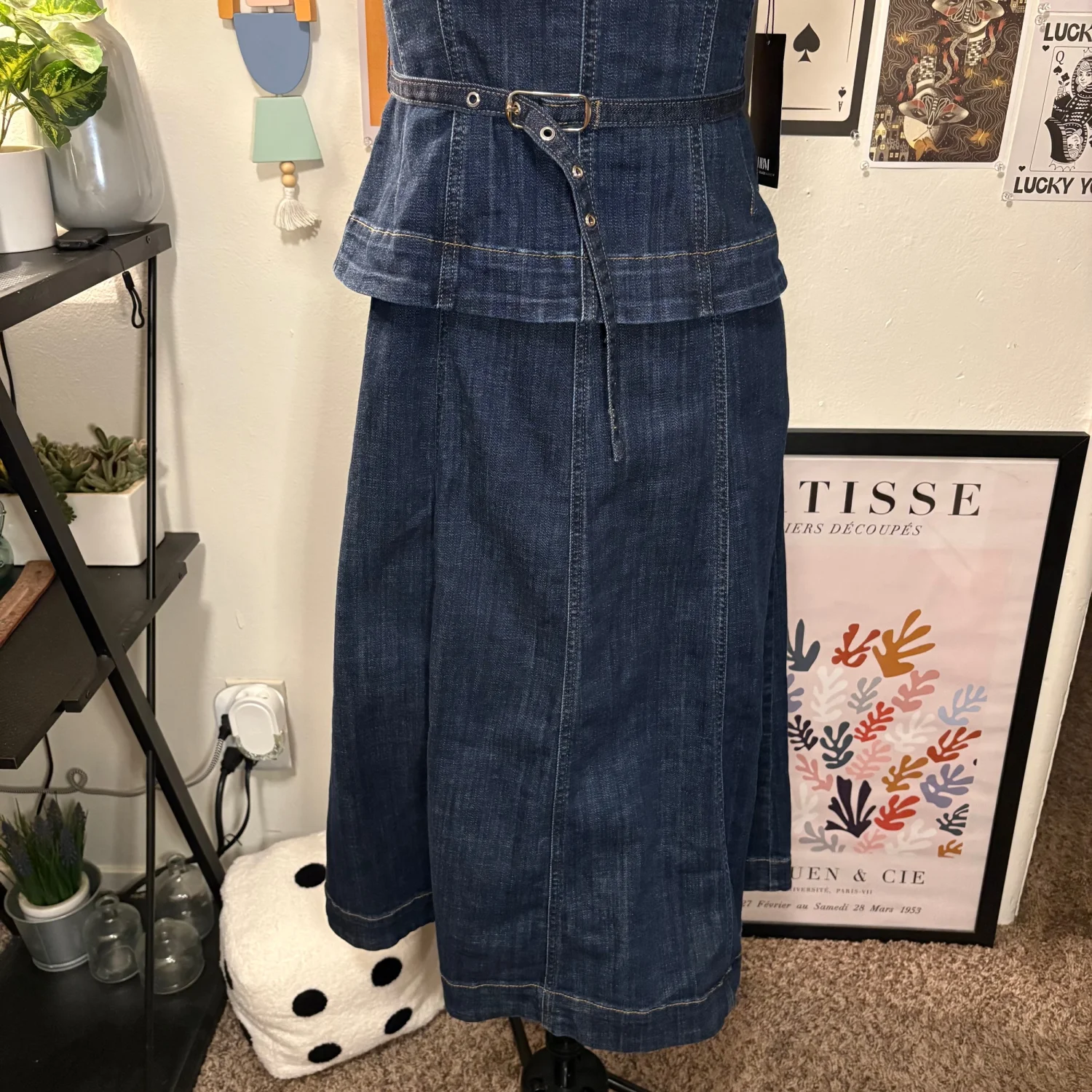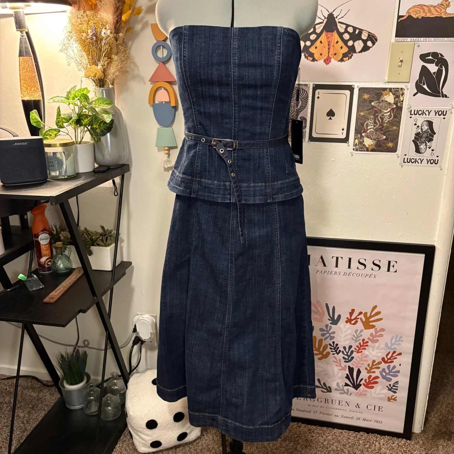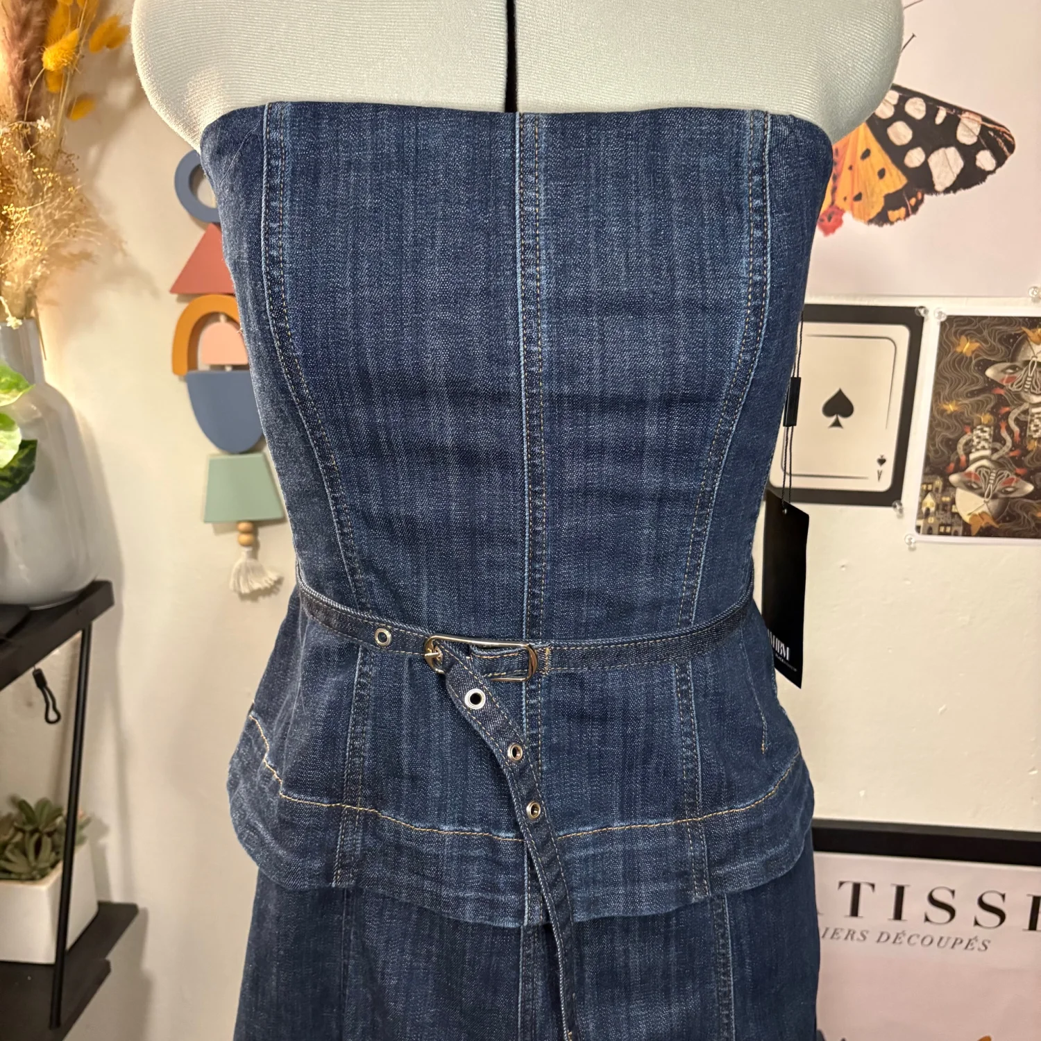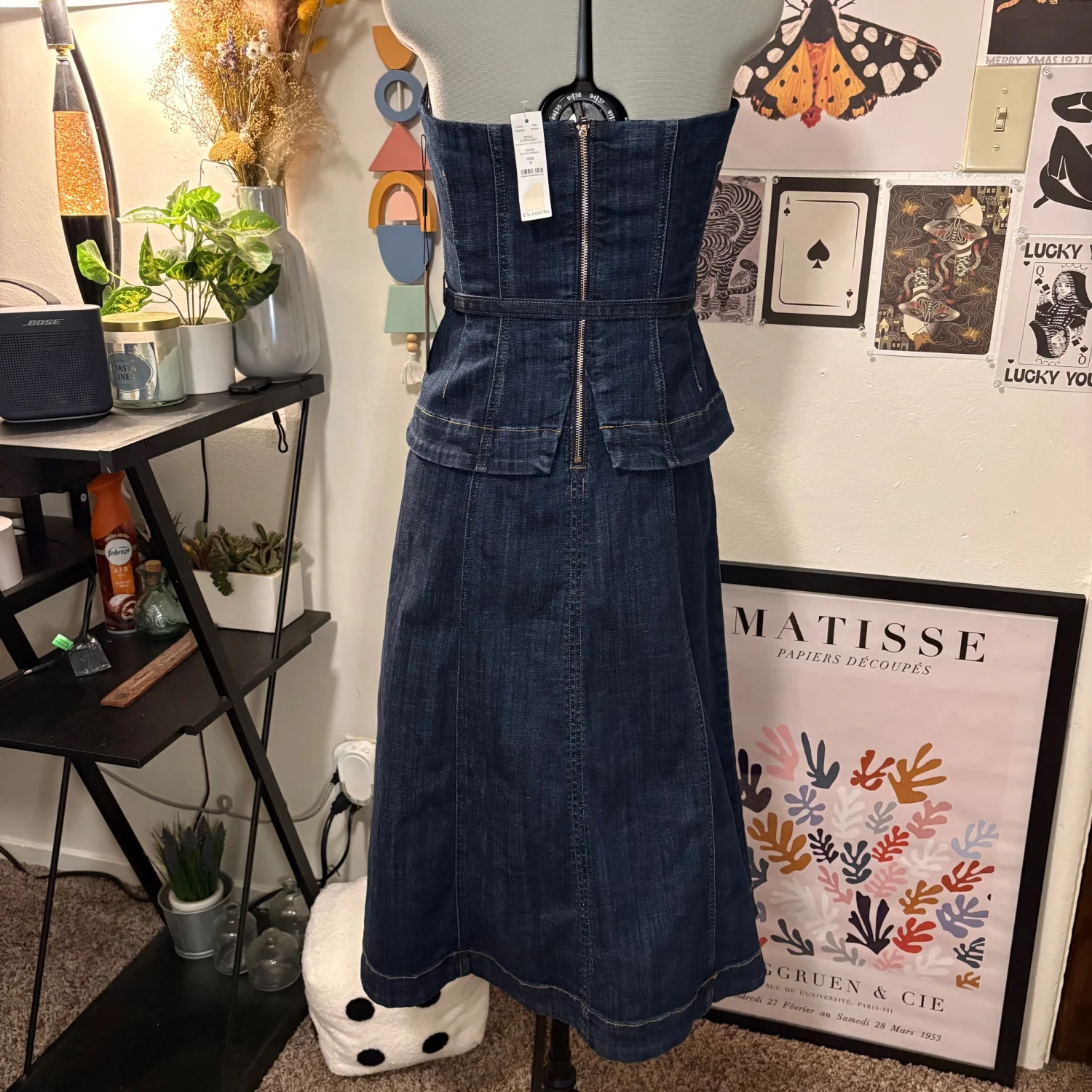 White House Black Market Strapless Denim Midi Dress — Size 8 (NWT, Originally $180) Beautiful strapless denim midi dress featuring a feminine peplum top and A‑line skirt. Seaming details and a thin removable belt define the waist, and the exposed back zipper adds a modern touch. Flattering, structured, and perfect for dressing up or down. Features • New with tags — originally $180 • Strapless • Peplum waist • A‑line skirt • Removable belt • Exposed back zipper • Fitted at bust, straight through hips • Below‑the‑knee length • Size 8 Measurements (flat) • Bust: 16 in • Waist: 15 in • Length: 41 in A timeless denim piece that transitions effortlessly from day to night.