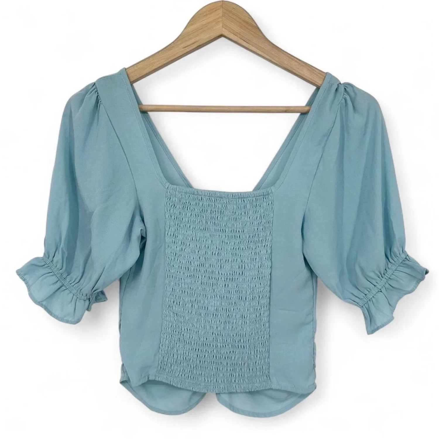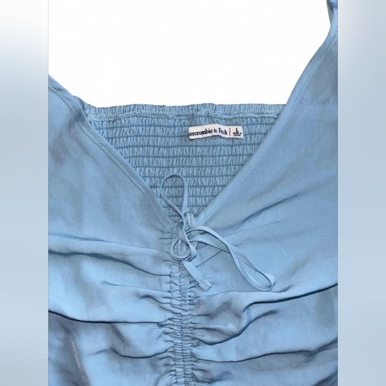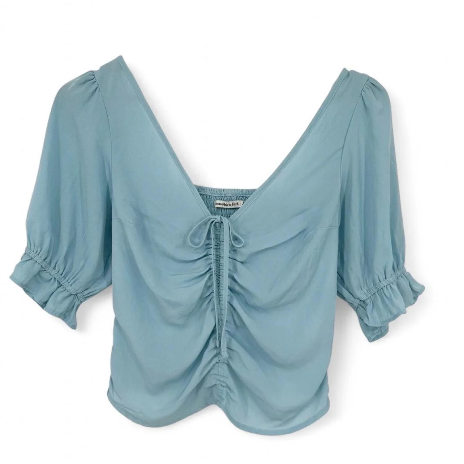Abercrombie & Fitch Cinch Front Puff Sleeve Top V-Neck Ruffle Smocked Blouse Size Large Color : baby blue