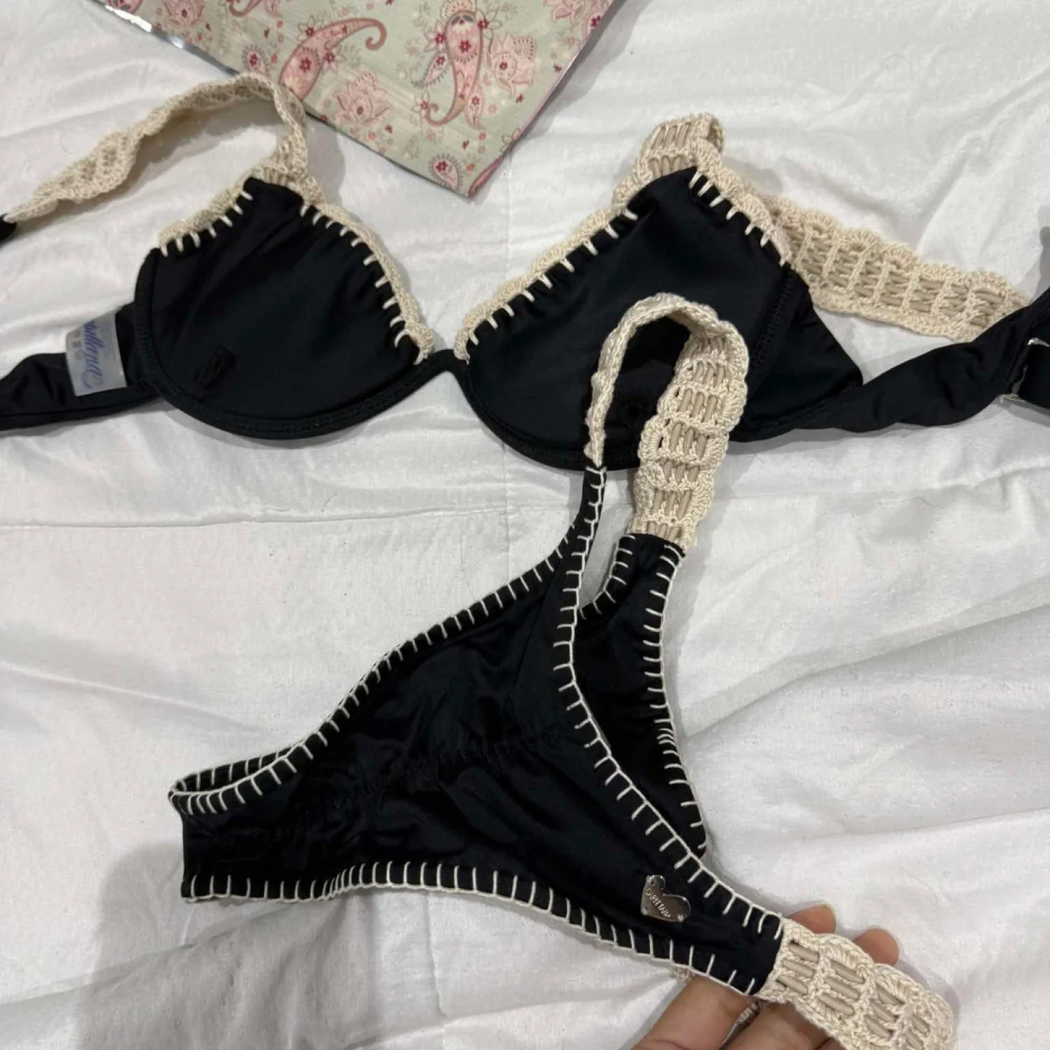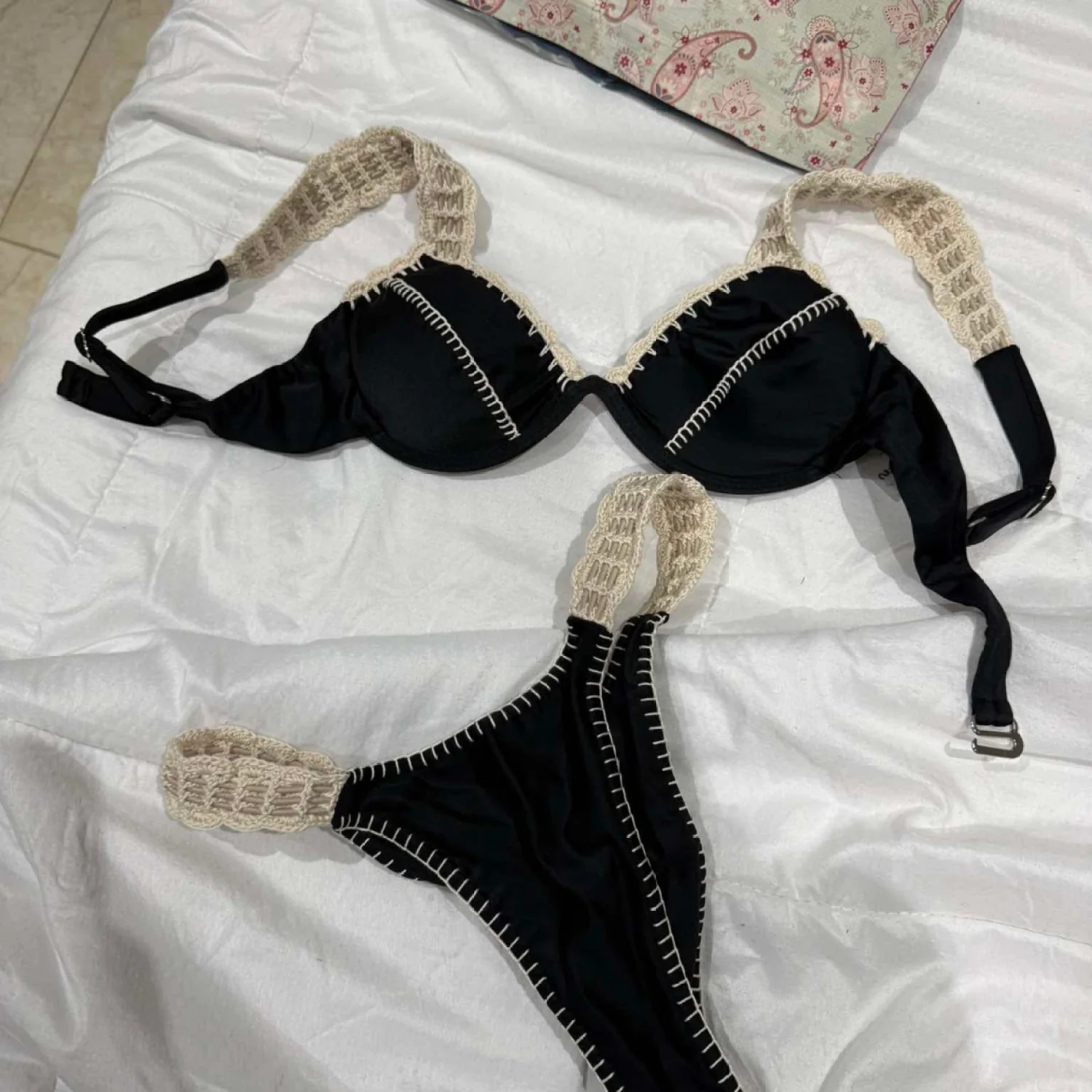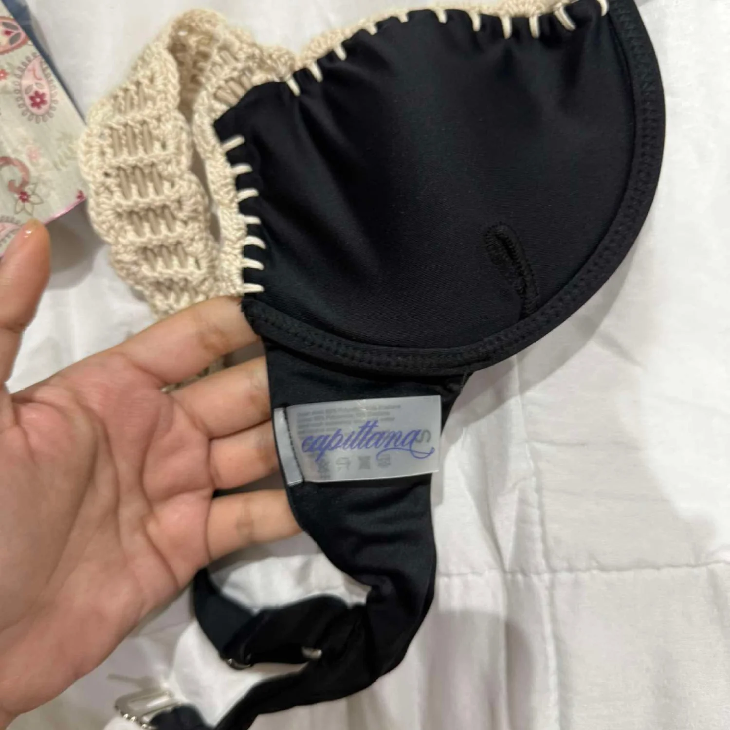 Capittana Alessia Black Bikini Set Crochet Trim Swimsuit Underwire Size Small Set contains: Top (bra) and bottom. Both in Small. 2025 released model. Sold at Capittana, Free People, Anthropologie and Macys site for more than $220. Condition: Perfect condition. Used only once. Comes with Capittana Bag. About the Top (bra): V-neck, crochet trim. Crochet straps, adjustable at back. Blanket-stitch trim at front. Clasp closure at back. Underwire support. Removable padding About the bottom: Cheeky coverage. Thong silhouette. Elasticized waist. Crochet side straps. Blanket-stitch trimruching at center back. This bikini is made of solid fabric. Water resistant. Recommended to hand hash only. Tags: Designer swimsuit, swimwear, quiet luxury, luxury, underwire, crochet, trim, handmade details, brazilian bikini bottom, boho chic, beachwear, resort, resortwear, coastal chic, vacation essentials, adjustable straps, cheeky, thong.