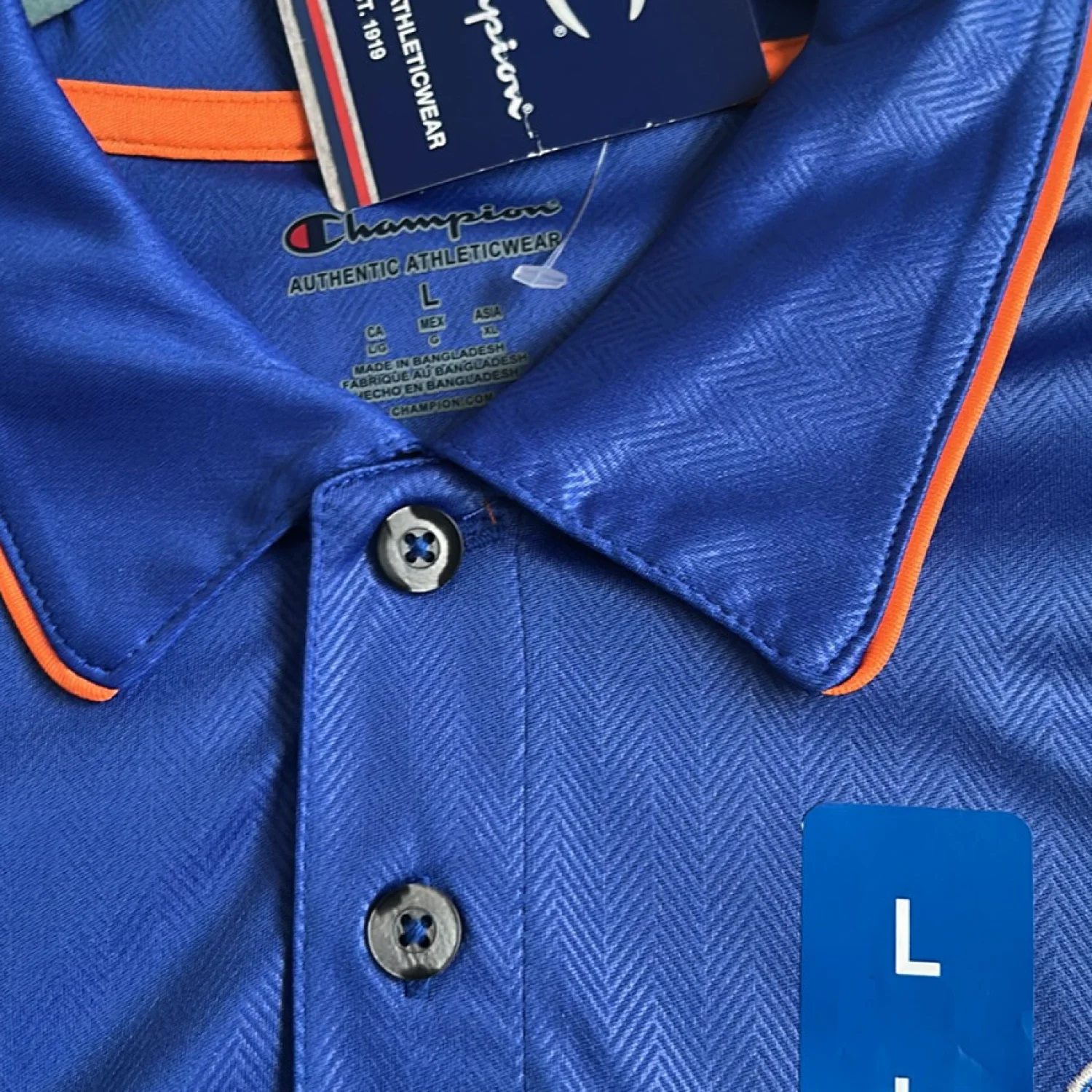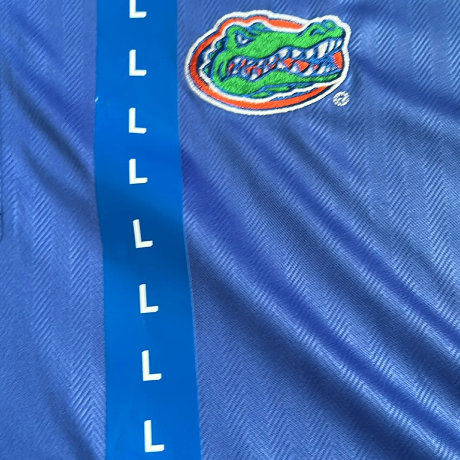 This is a blue polo shirt by Champion featuring the Florida Gators on the chest. Made with a smooth, lightweight fabric, perfect for casual or sporty wear. The shirt includes a three-button placket and orange trim along the collar for added style. Ideal for fans and supporters of the team. Tags are attached, indicating new condition. #collegiate #sportswear #FloridaGators