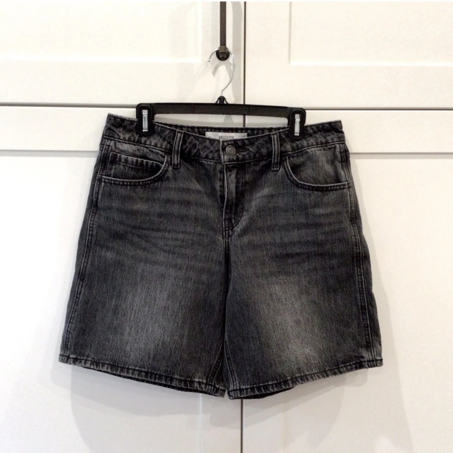 Hollister black denim jeans in great, pre-owned condition. No stains no holes. Low-rise baggy Jort style Size 28” 9” inseam 10.5” rise