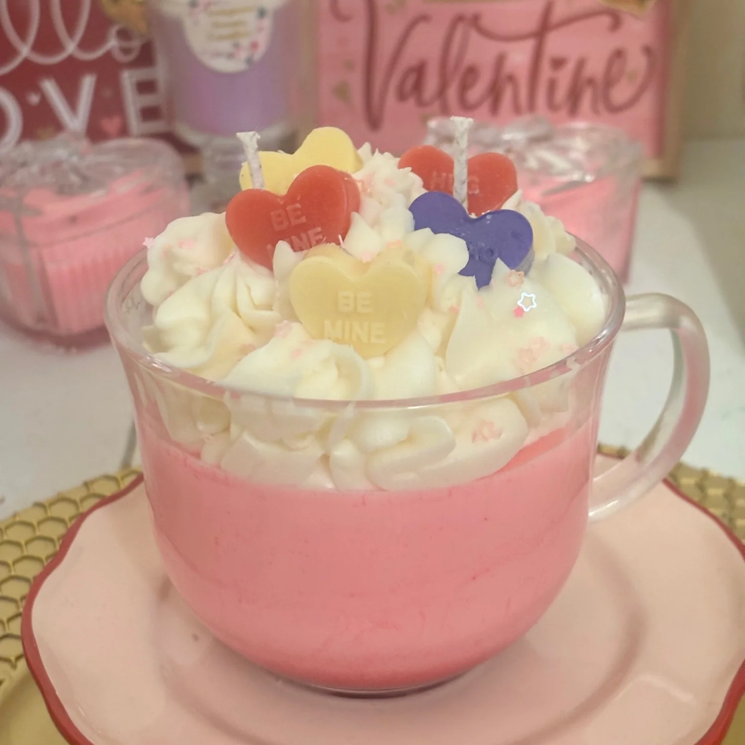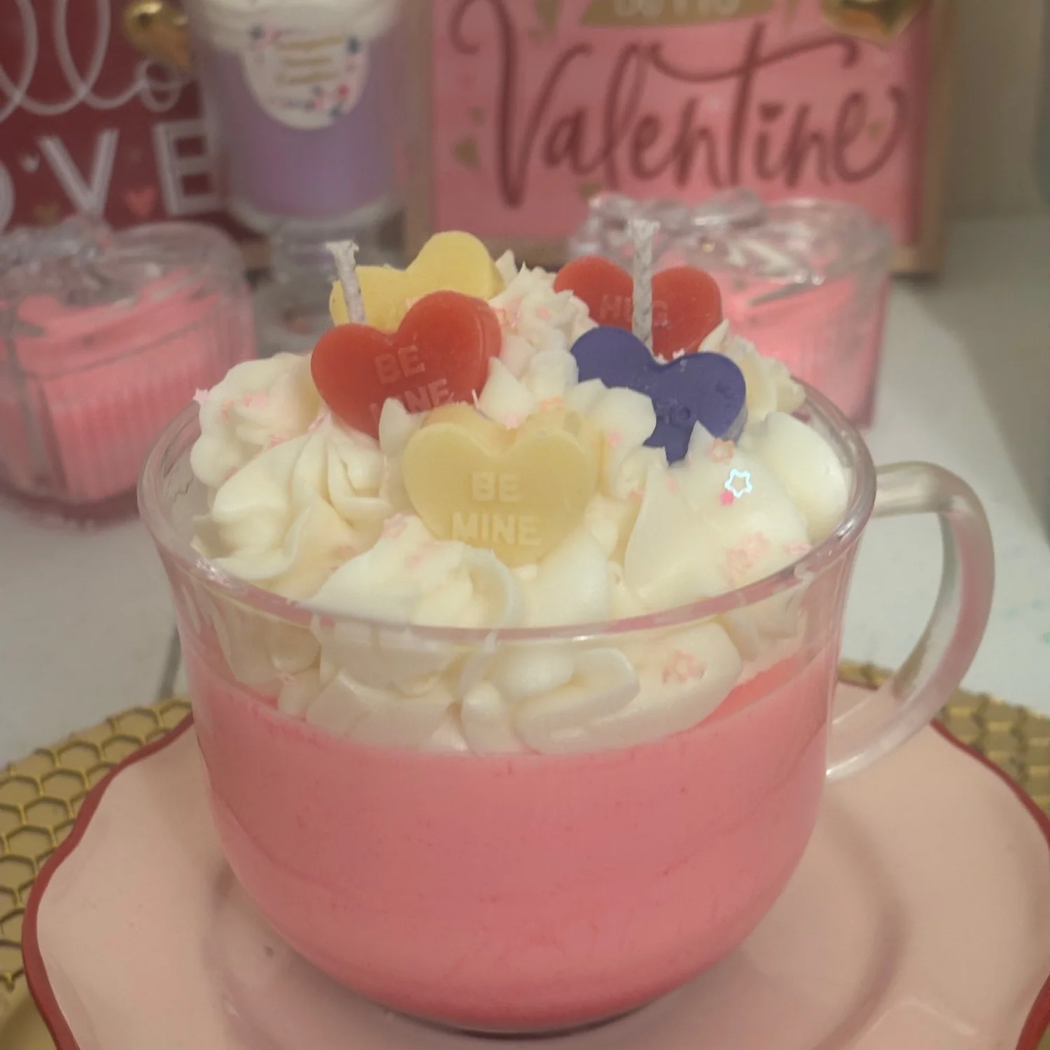 Fragrant with kiss me Cupid,it has 2 wicks handmade with coconut soy wax hours of burn time