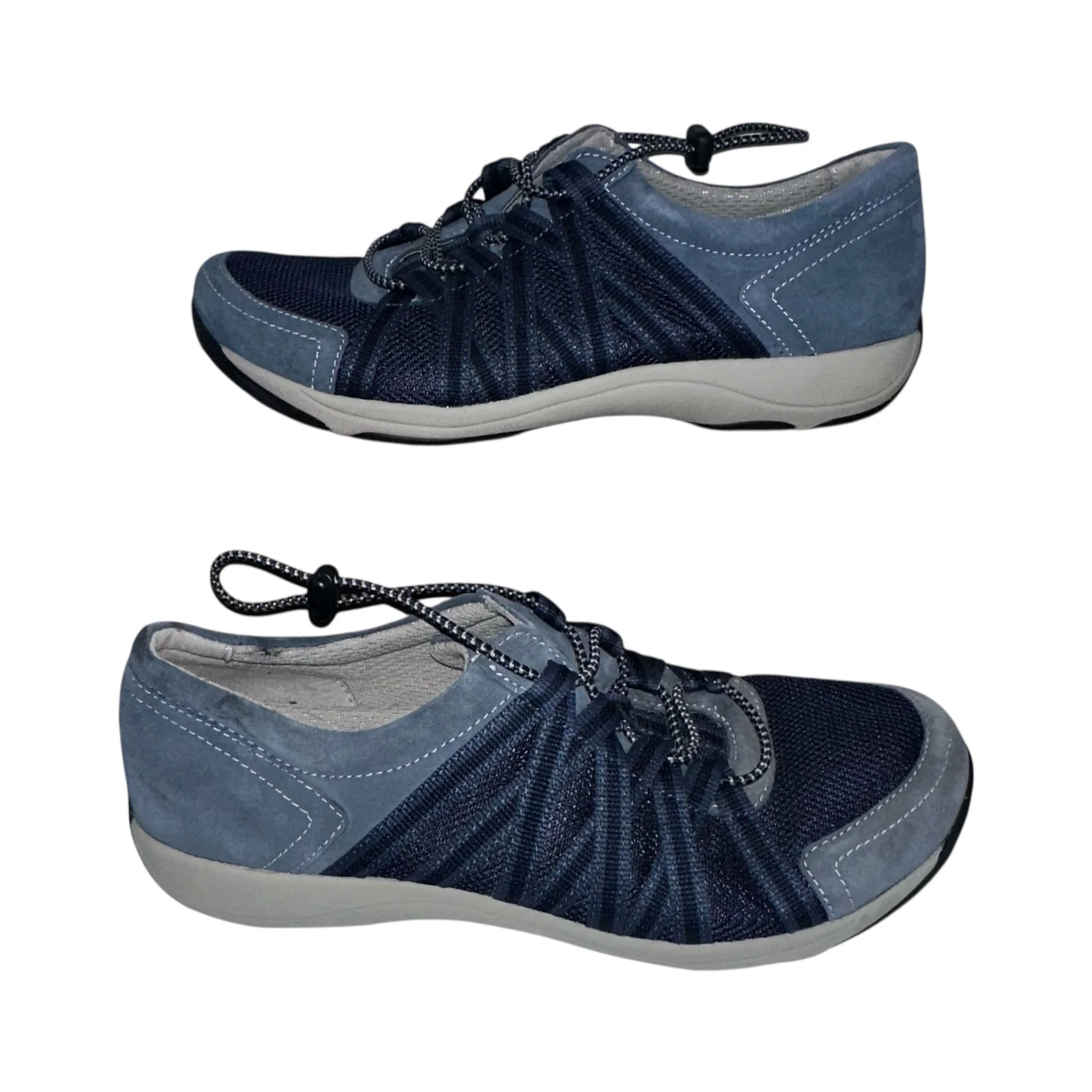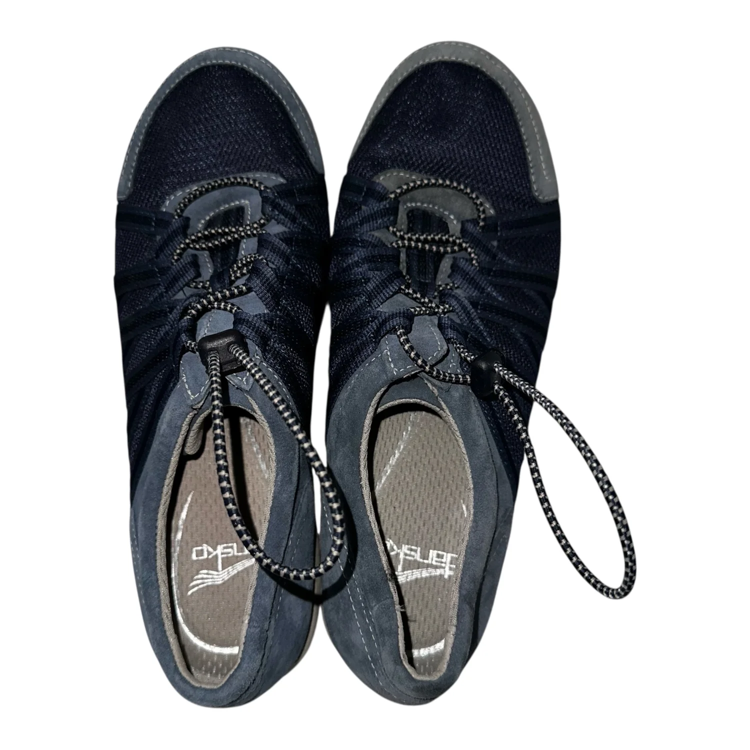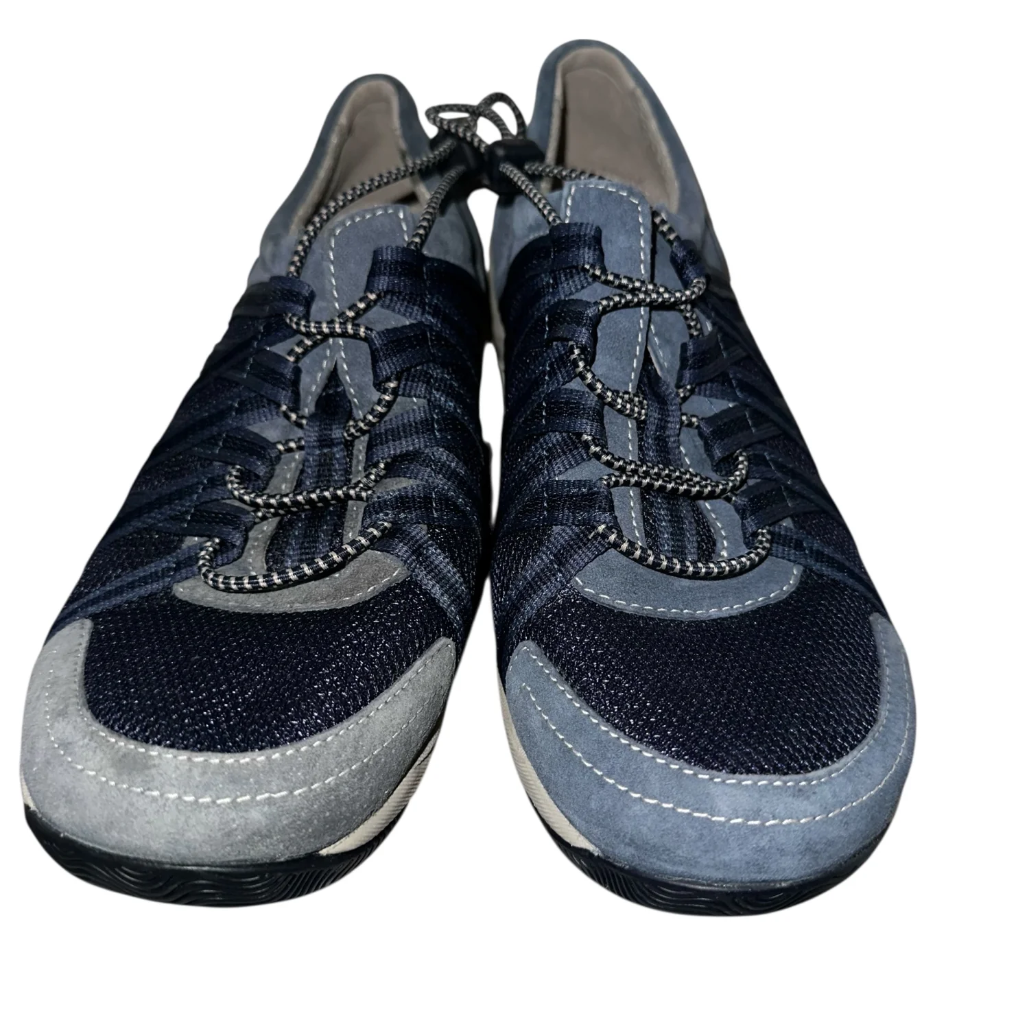 These stylish navy and gray sneakers feature a comfortable lace-up design with mesh and suede materials, perfect for casual wear. The durable outsole provides excellent grip, making them ideal for everyday activities. The shoes have a unique bungee lace system for easy on-and-off wear. EU 39/US 8.5-9. Tags: #casual #sneakers #everydaywear #nursing #dansko #comfort #suede