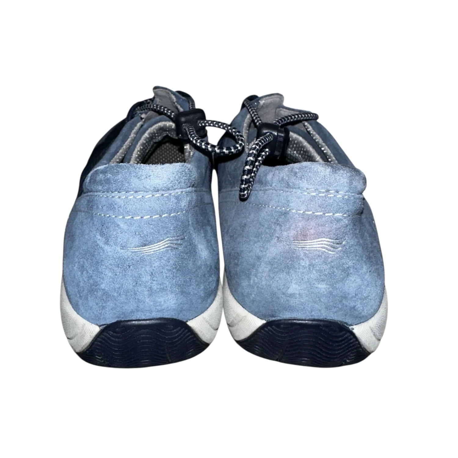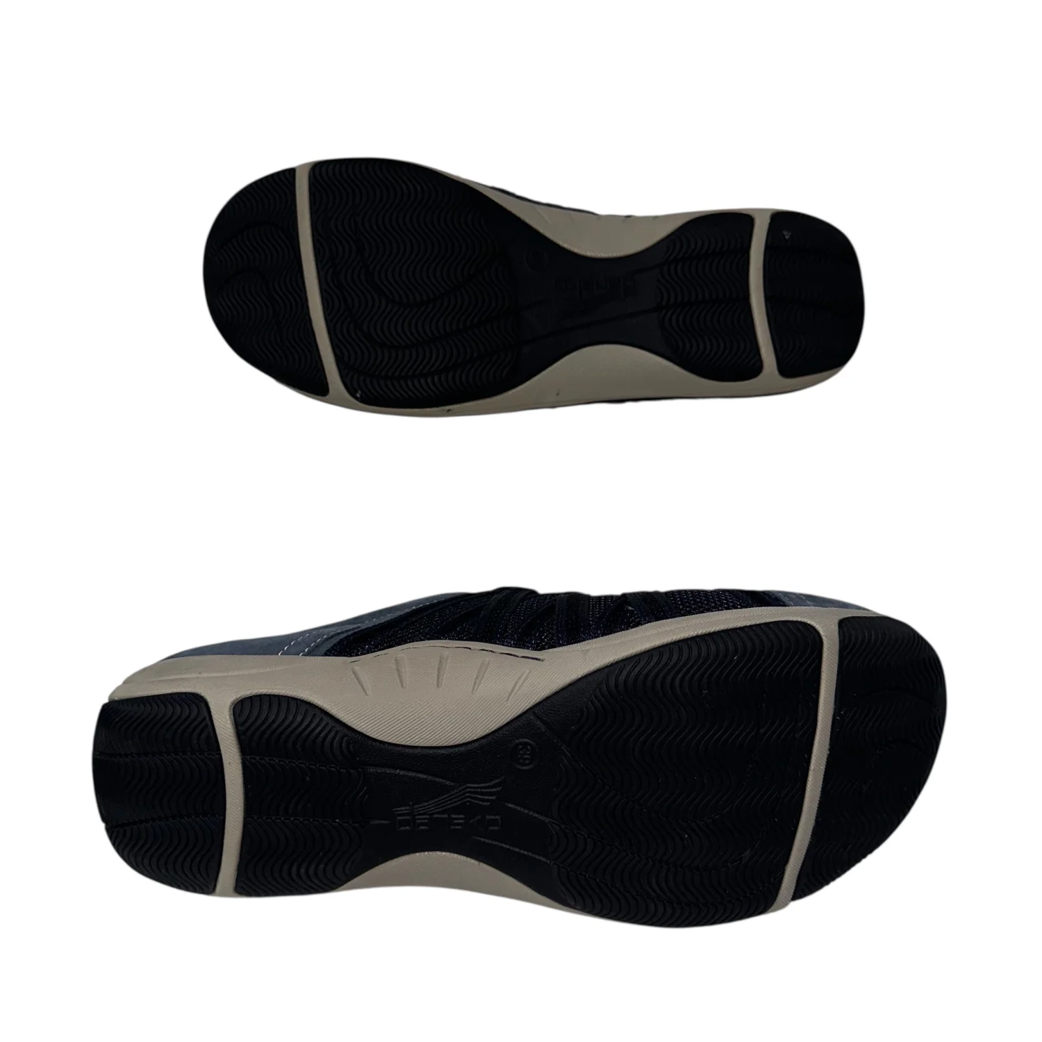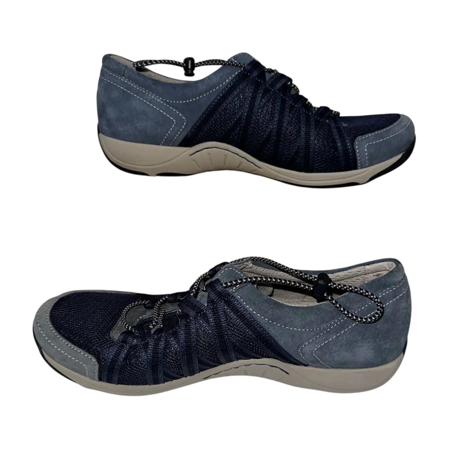These stylish navy and gray sneakers feature a comfortable lace-up design with mesh and suede materials, perfect for casual wear. The durable outsole provides excellent grip, making them ideal for everyday activities. The shoes have a unique bungee lace system for easy on-and-off wear. EU 39/US 8.5-9. Tags: #casual #sneakers #everydaywear #nursing #dansko #comfort #suede