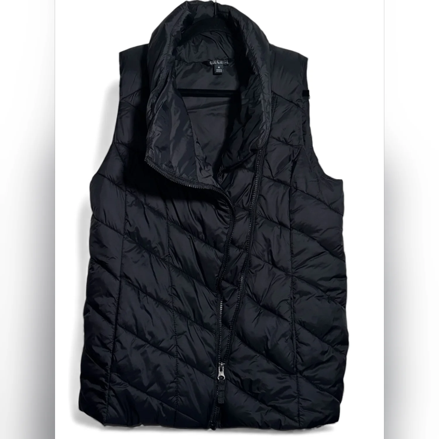 The EUC Black Quilted NICOLE MILLER Asymmetrical Zipper Insulated Vest in size Medium is a stylish and functional outerwear piece perfect for travel, casual, or workwear occasions during the winter, fall, or spring seasons. Made with a durable nylon outer shell and quilted accents, this sleeveless vest features a unique asymmetrical zipper closure for added flair. The black color and solid pattern make it versatile for various wardrobe styles, while the insulated design provides warmth and comfort. With a regular fit and high-quality construction from the Nicole Miller brand, this vest is a classic choice for outdoor activities in colder weather. Approximate PTP is 20”. Size medium. Excellent condition.