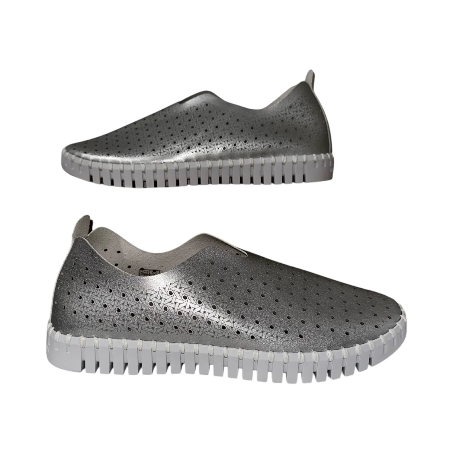 The Ilse Jacobsen Size 40 9.5-10 Tulip Shoes are stylish and comfortable slip-on metallic silver shoes with a low top design, round toe shape, and floral pattern. These shoes are perfect for travel, casual outings, and workwear, with a flat heel height for added comfort. The shoes are designed with scalloped accents and the Ilse Jacobsen logo, featuring a breathable synthetic upper material. These slip-on shoes are part of the Ilse Jacobsen Tulip product line and are ideal for walking, beach outings, school, or everyday use during the summer, fall, and spring seasons. Brand new without box.