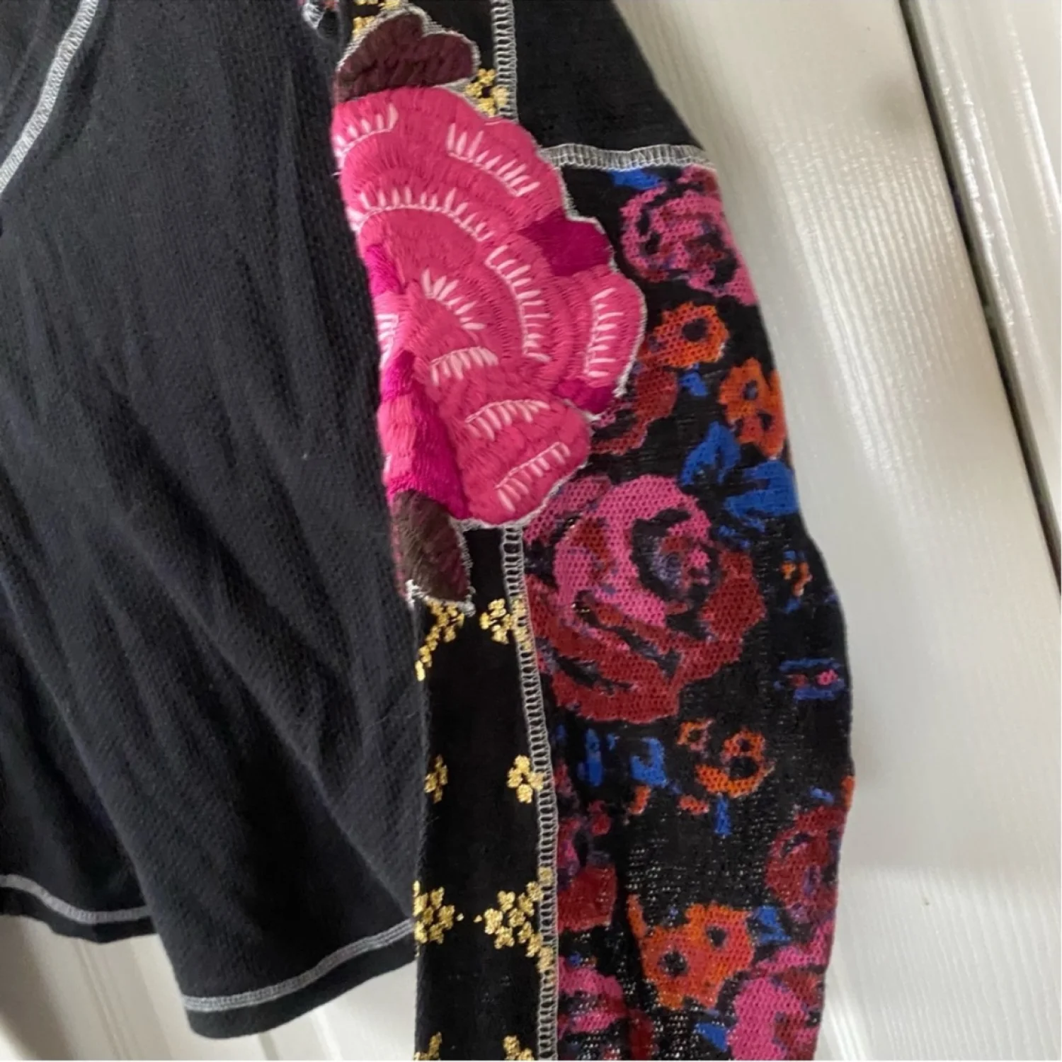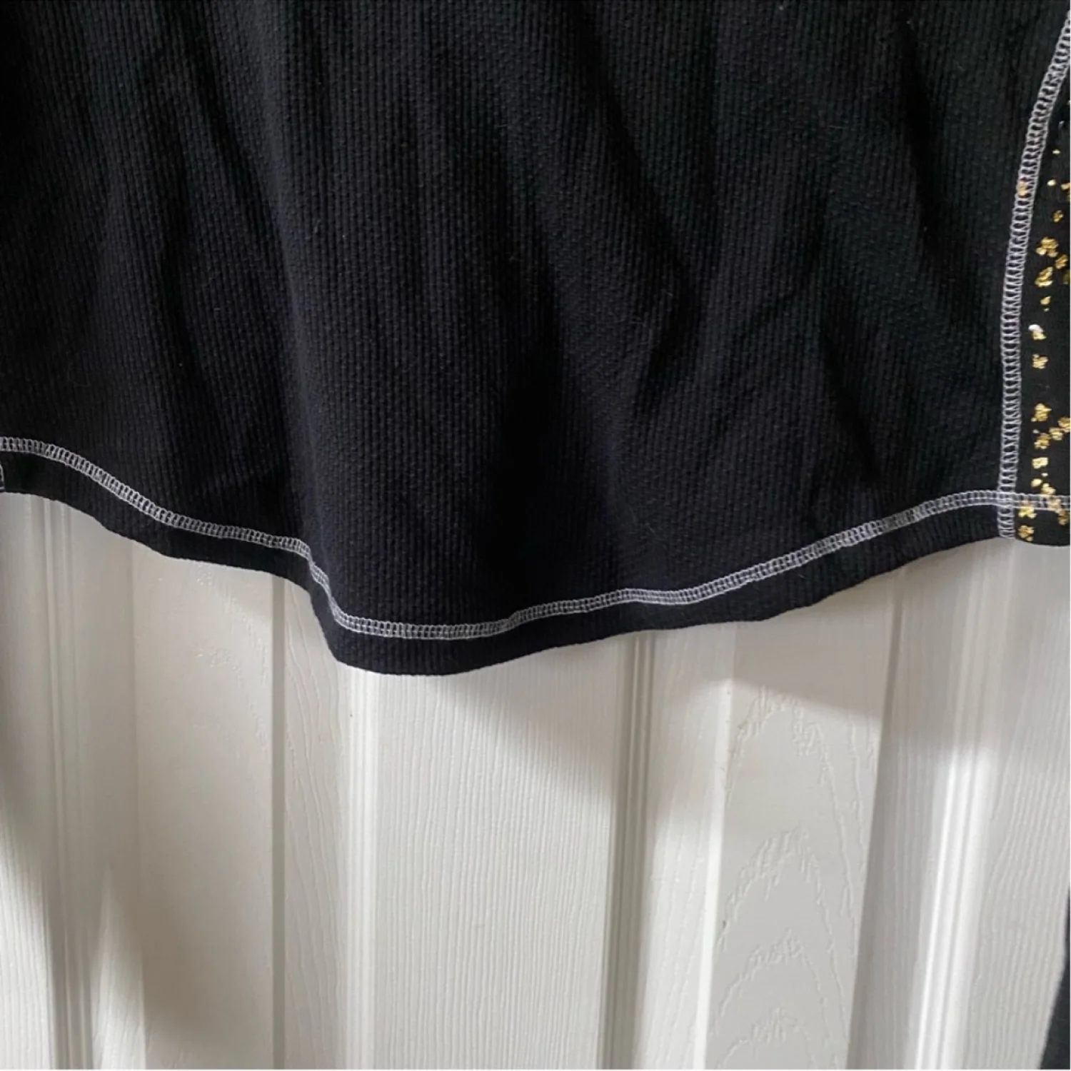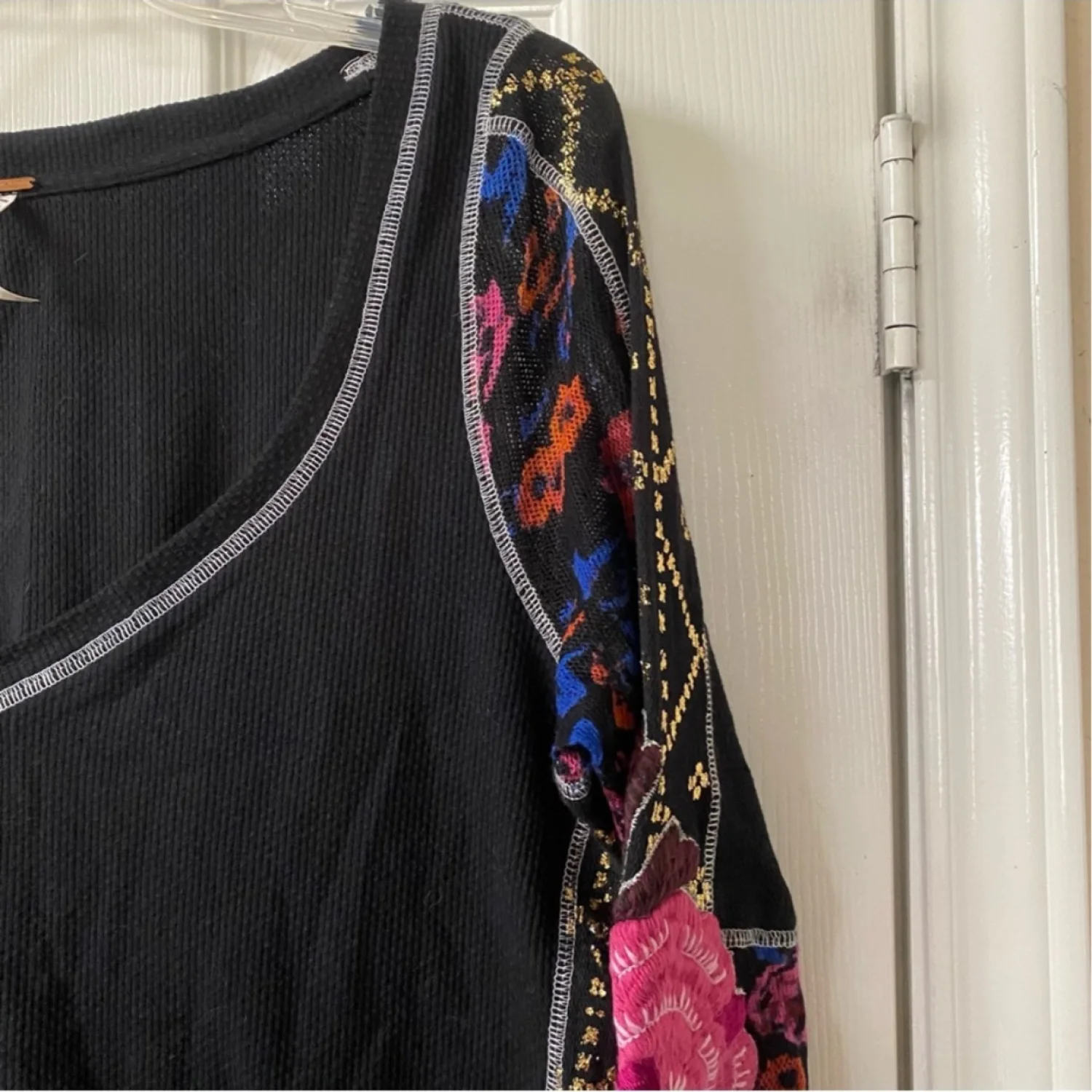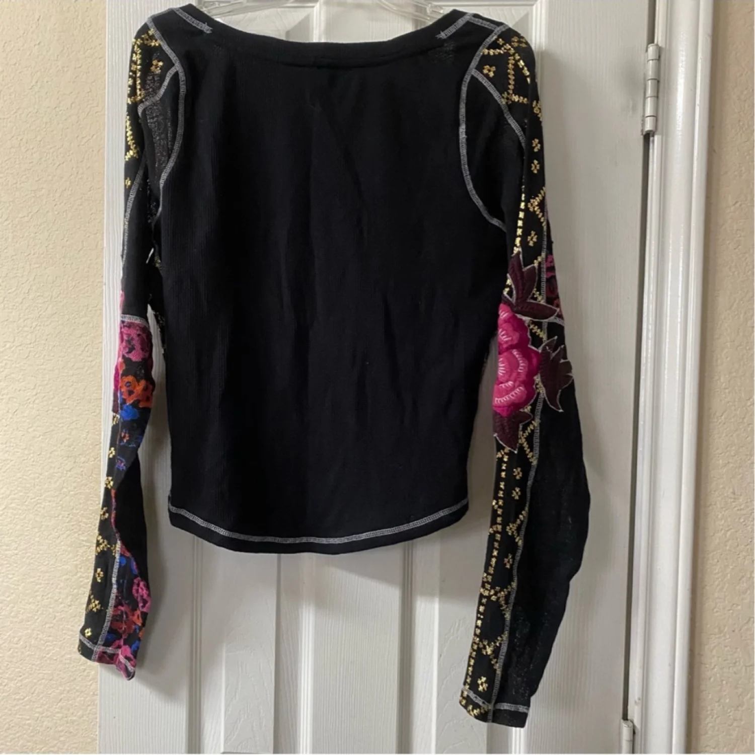 Free People Amara Black Embroidered Floral Gold Foil Sleeve Thermal Top XL