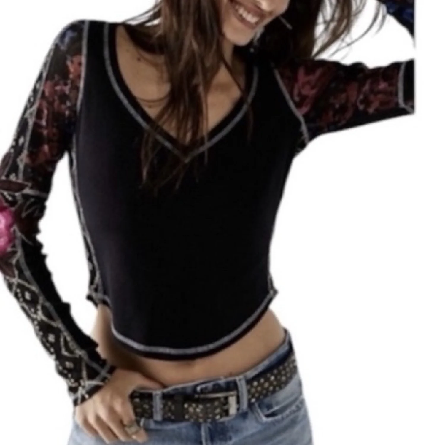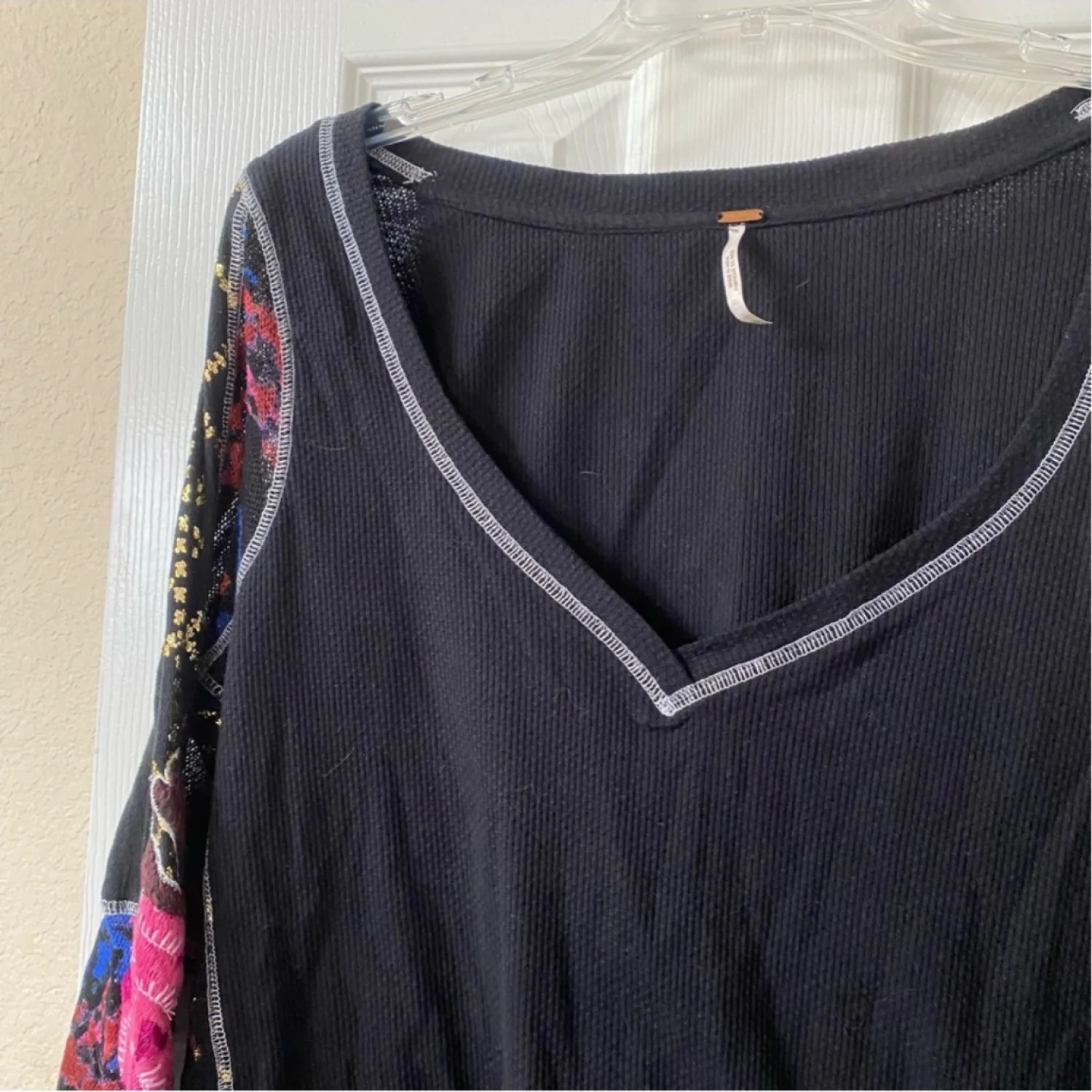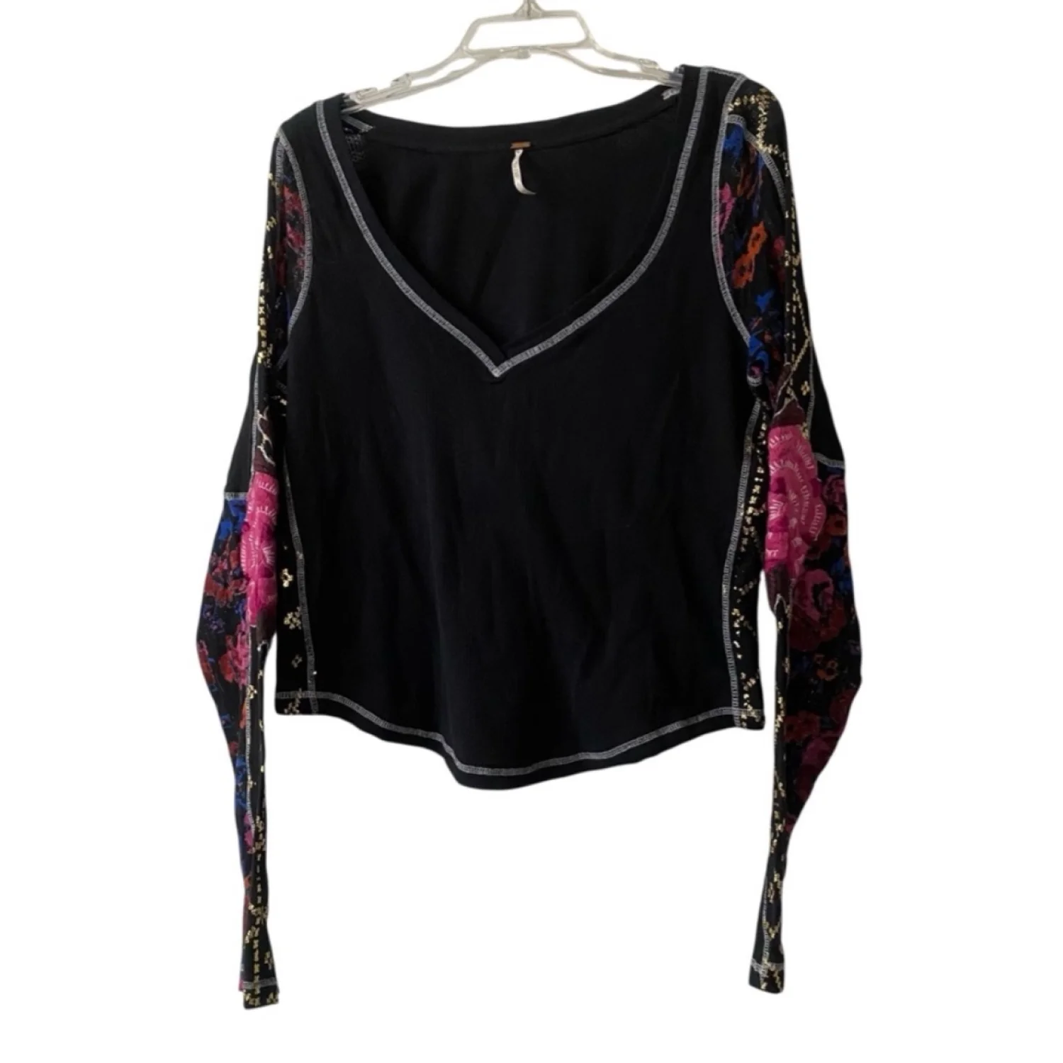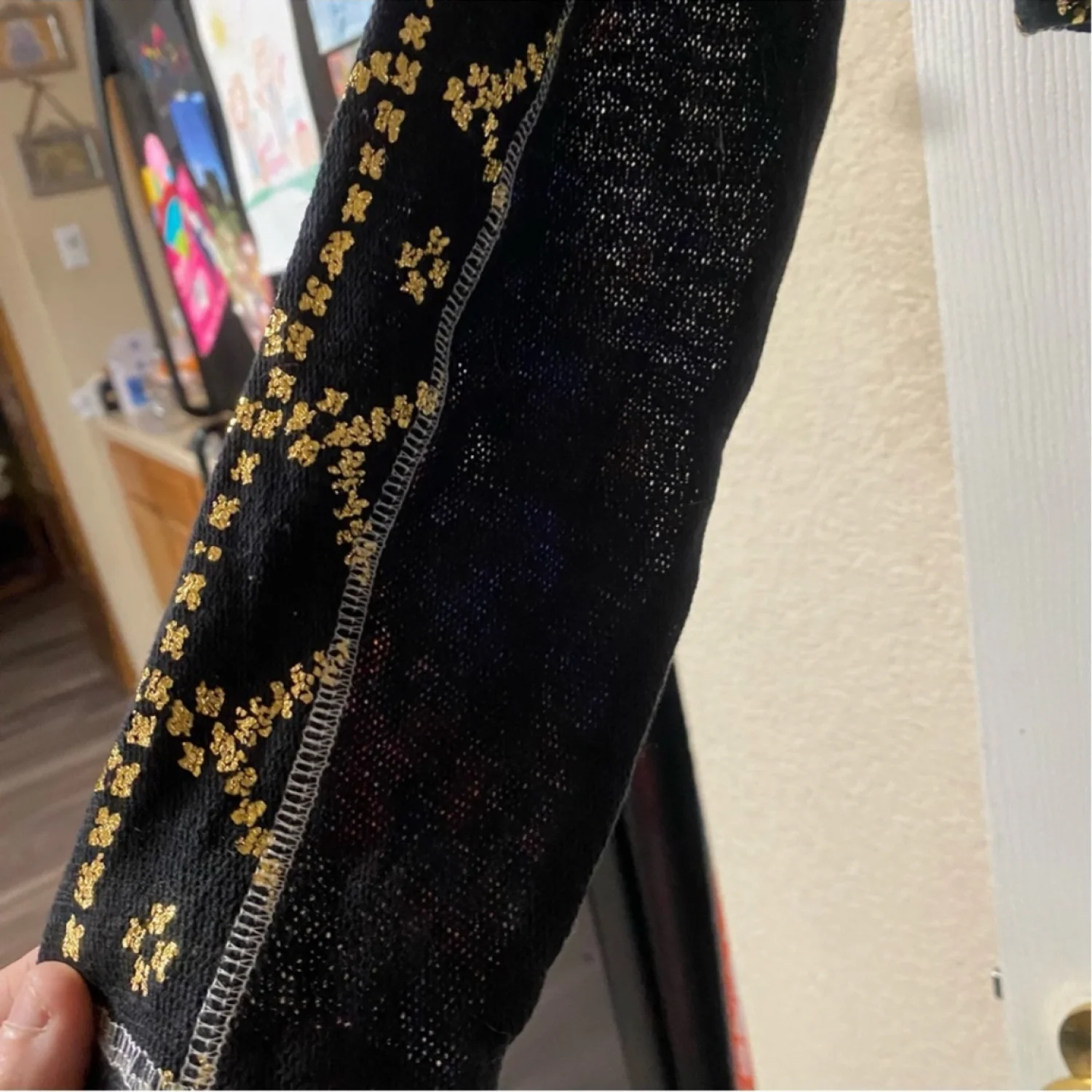 Free People Amara Black Embroidered Floral Gold Foil Sleeve Thermal Top XL