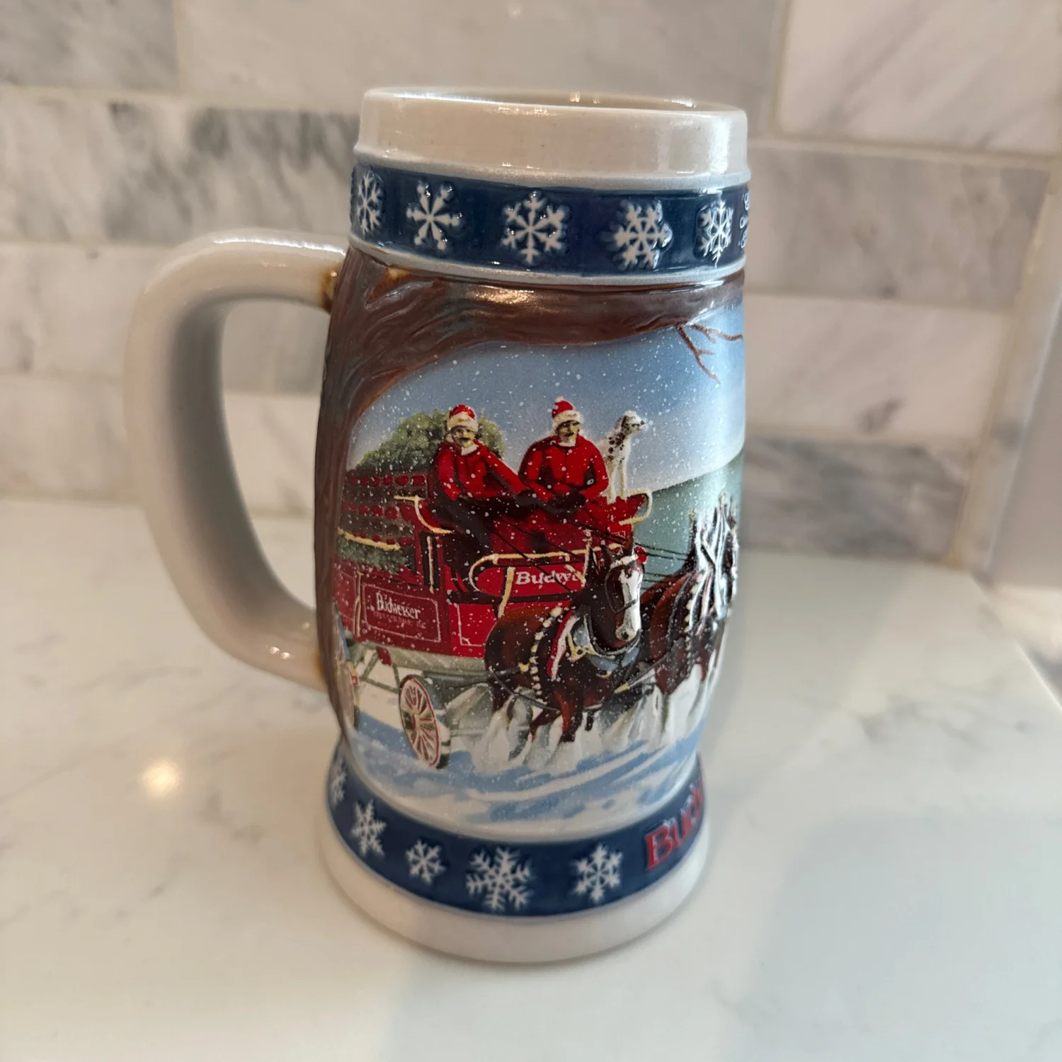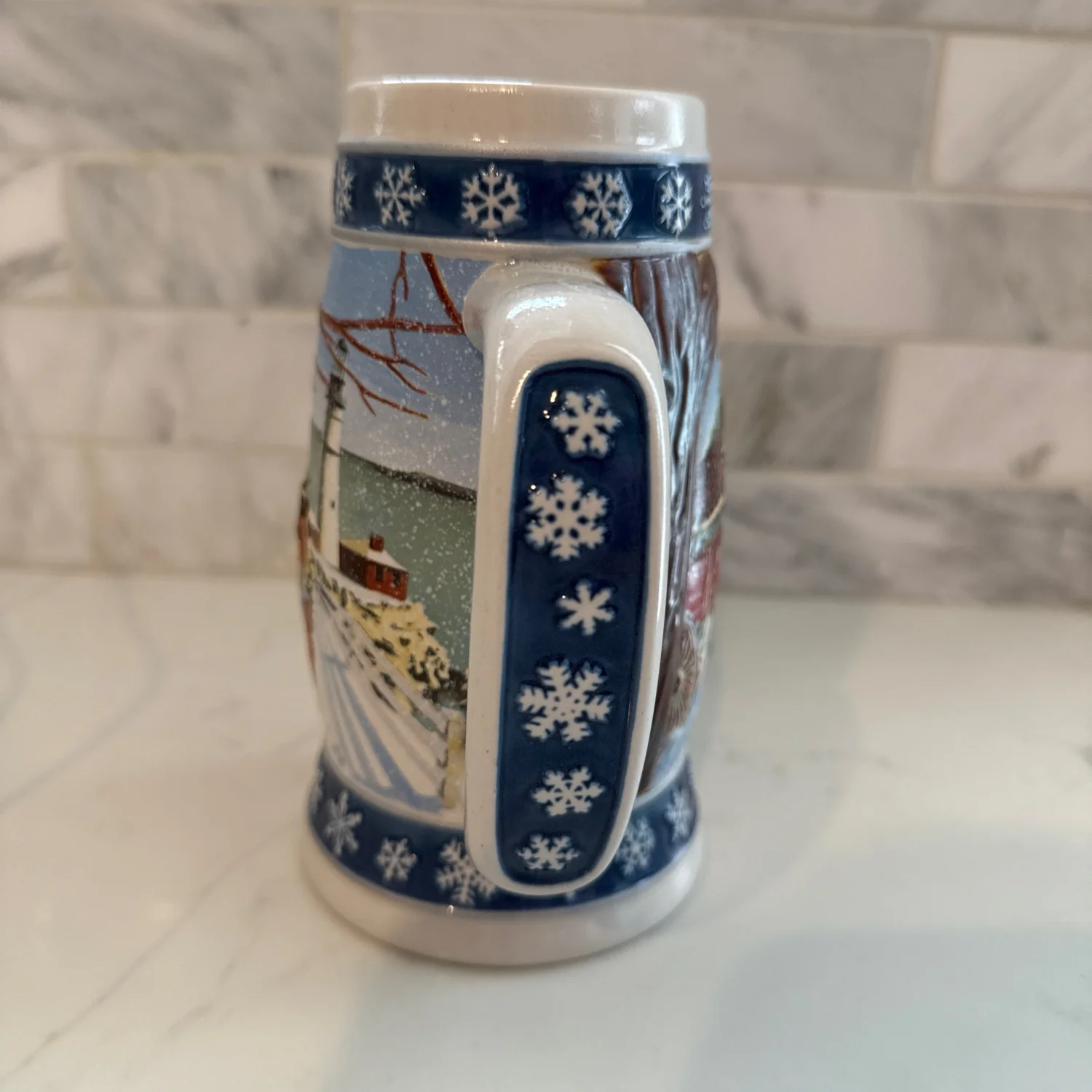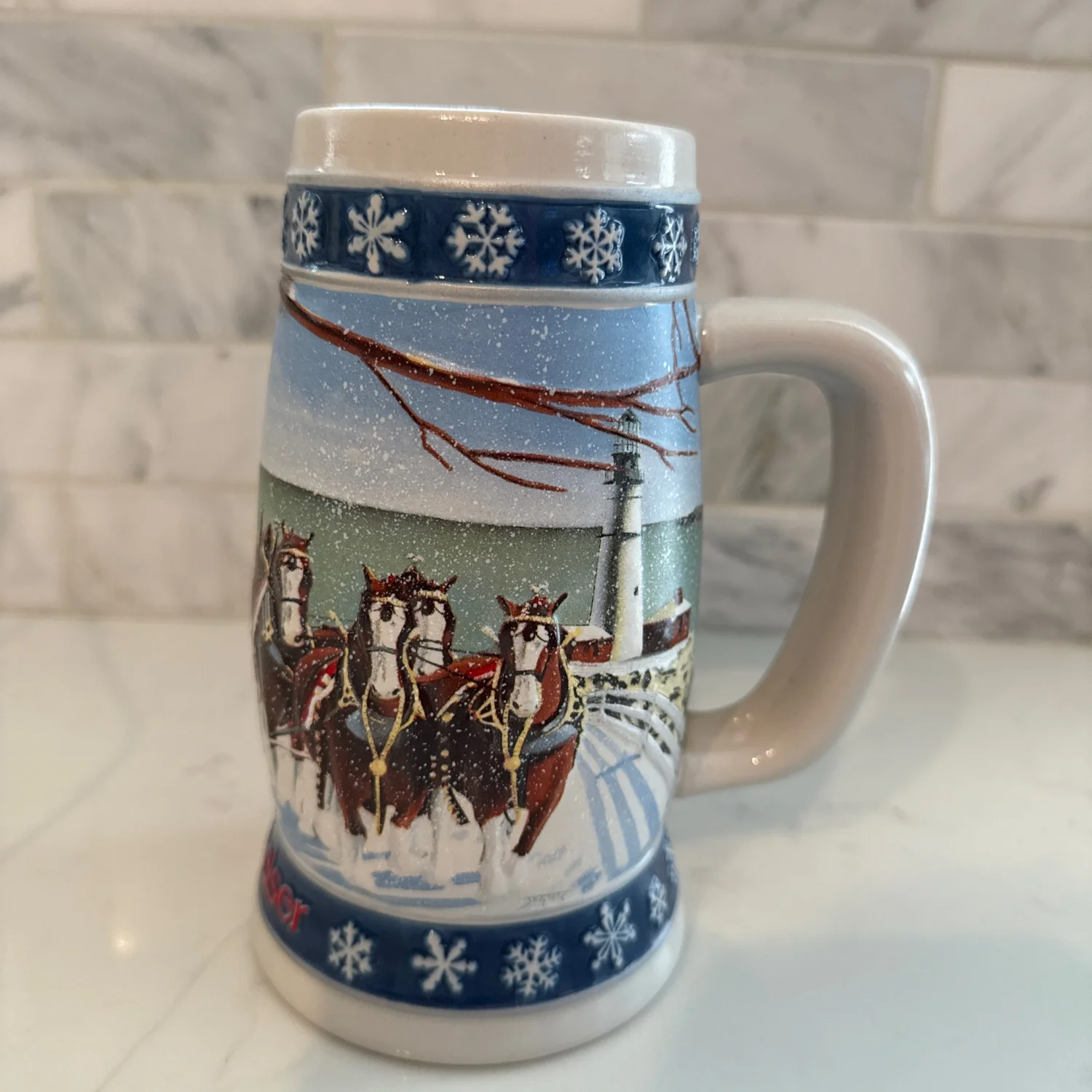 This 1995 Budweiser Holiday Stein, titled 'Lighting the Way Home,' features a festive scene with a Budweiser wagon drawn by majestic horses in a snowy landscape, accented with snowflakes and a lighthouse design. The collectible stein is perfect for Budweiser enthusiasts and holiday decor. Made by Anheuser-Busch, this ceramic mug is part of a series of holiday collectibles. Stock up now for Christmas