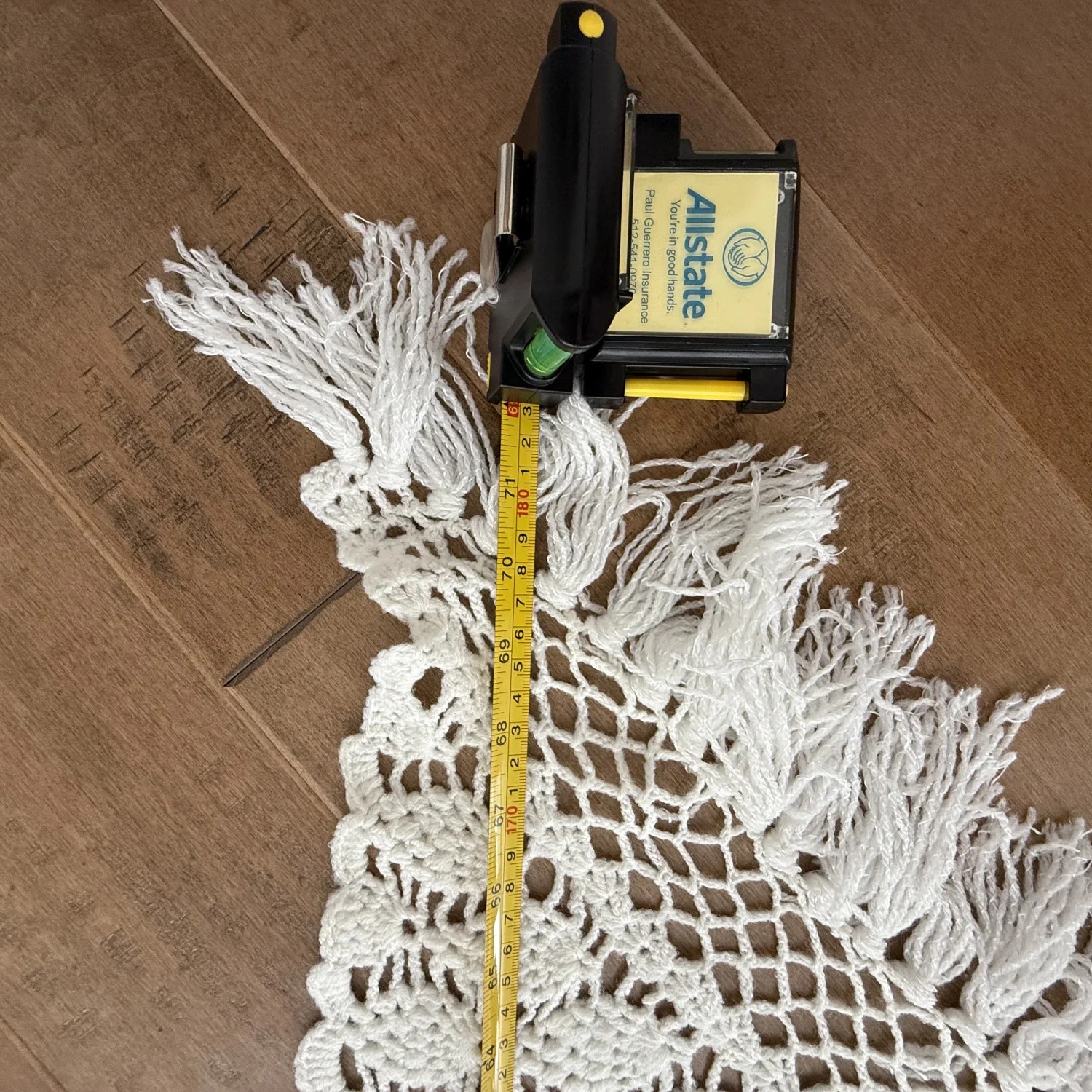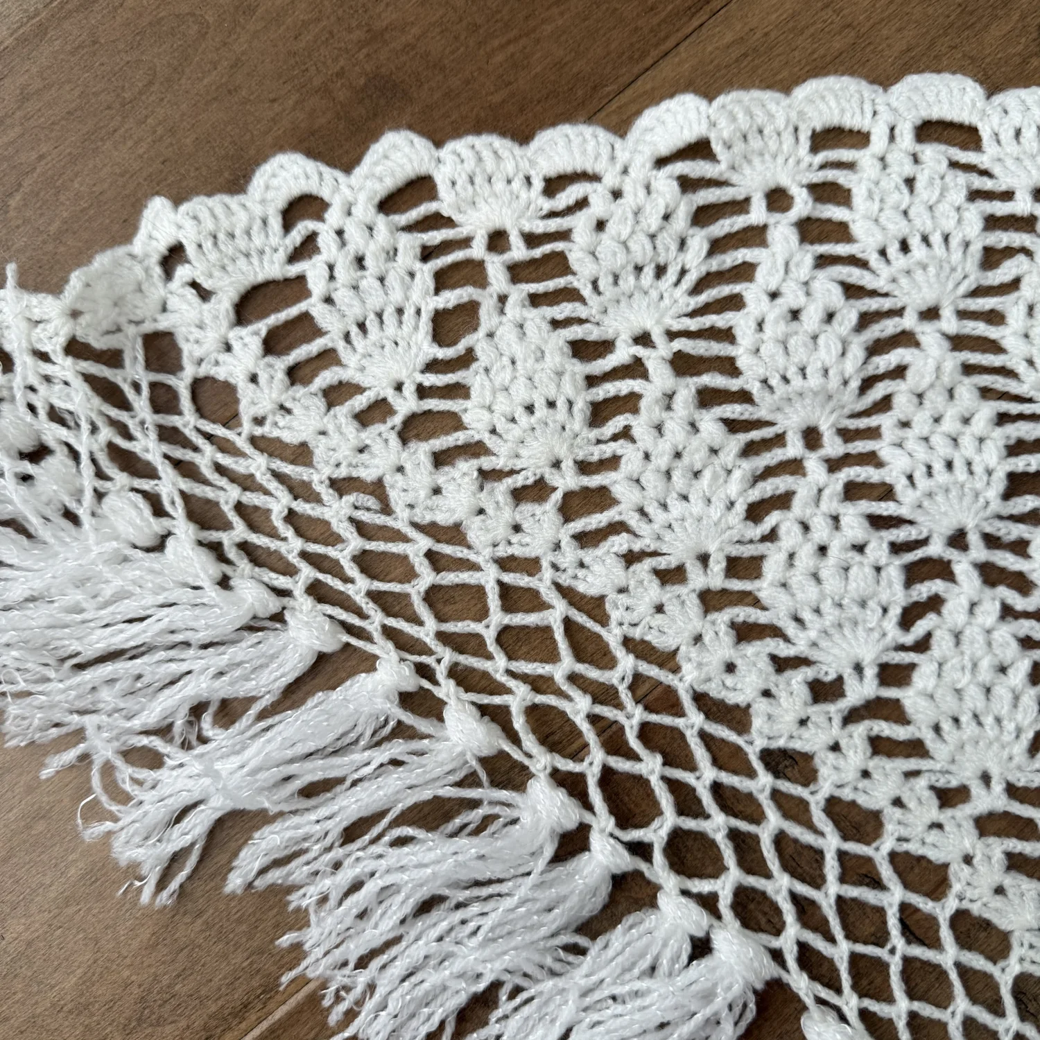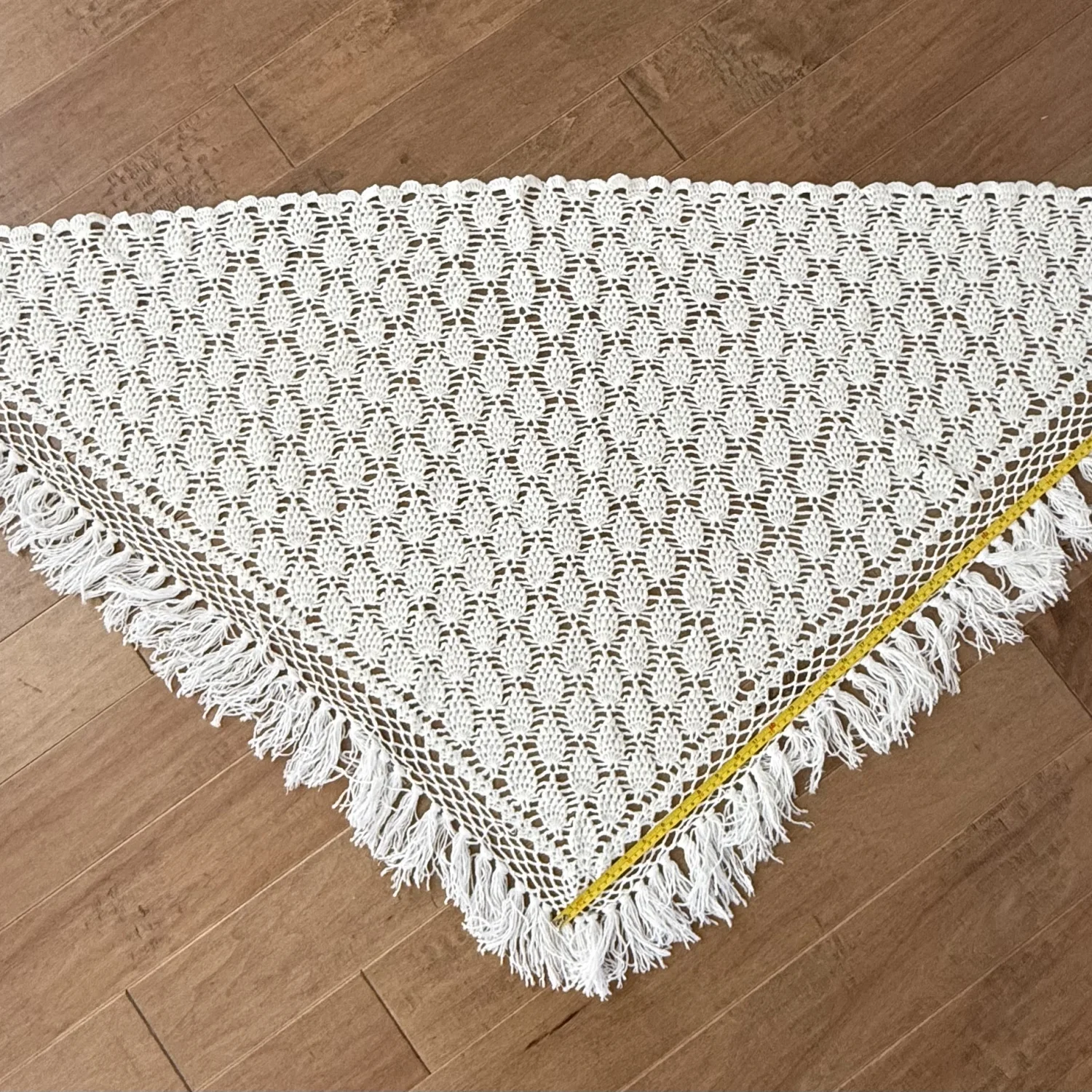 A handmade lace shawl with a detailed pattern and fringes on the edges.
