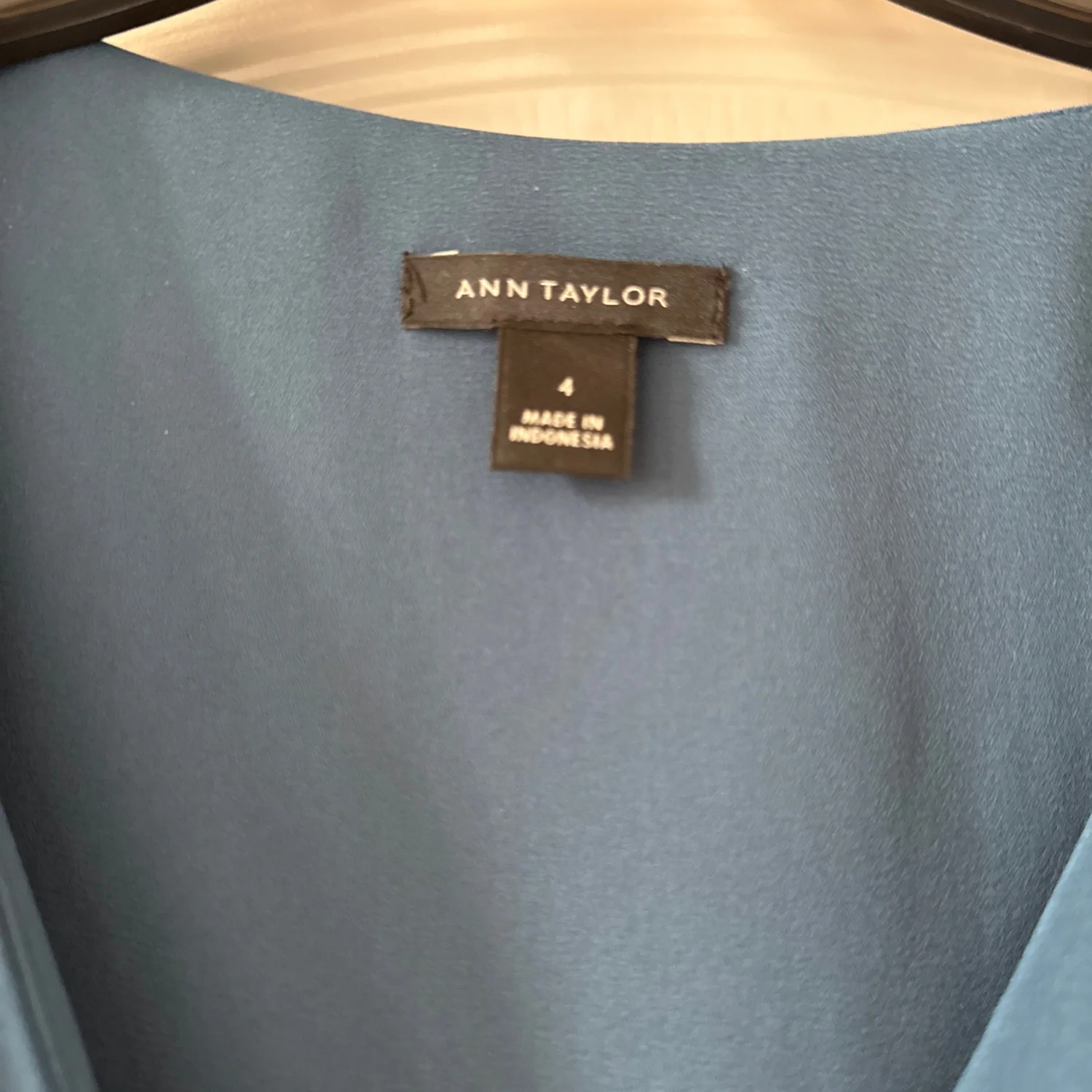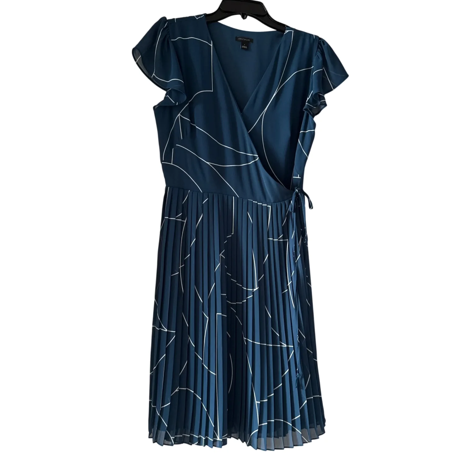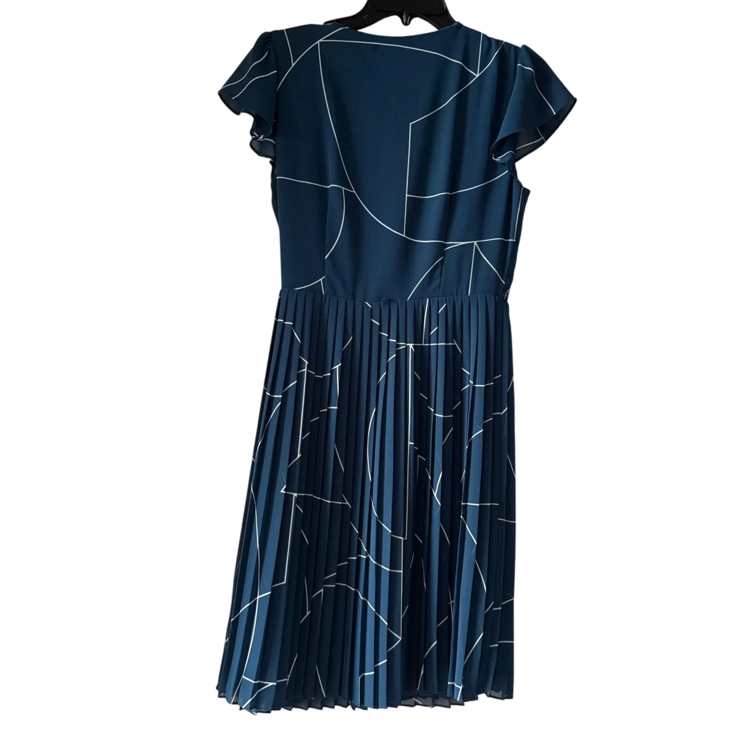 Elegant Ann Taylor blue wrap dress featuring a stylish abstract white line pattern. Made from lightweight fabric, this dress has flutter sleeves and a pleated skirt. Perfect for both casual and semi-formal occasions. Size 4. Care instructions: machine wash. #elegant #wrapdress #AnnTaylor
