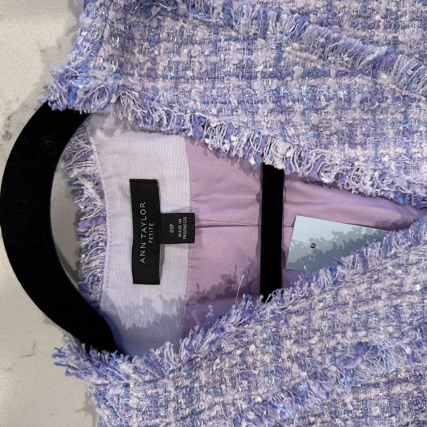 A purple tweed blazer with a purple silk lining. The blazer features a single breasted design with four brown buttons and a notched lapel. Size is 00P