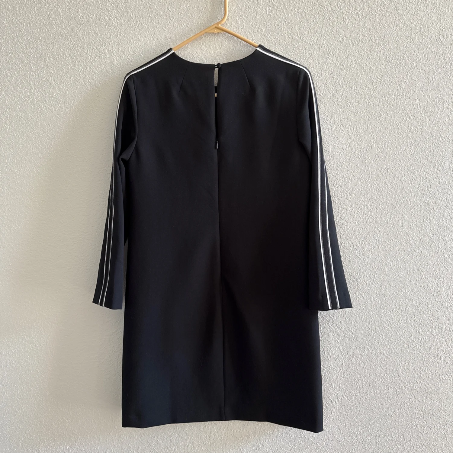 Elegant Banana Republic black shift dress with white side stripe details on the sleeves. Features a round neckline, long sleeves, and a back button closure. Perfect for both casual and formal occasions. Made from a smooth, lightweight fabric for a comfortable fit. Size S_4. Ideal for a chic and minimalist style. #BananaRepublic #ShiftDress #MinimalistFashion