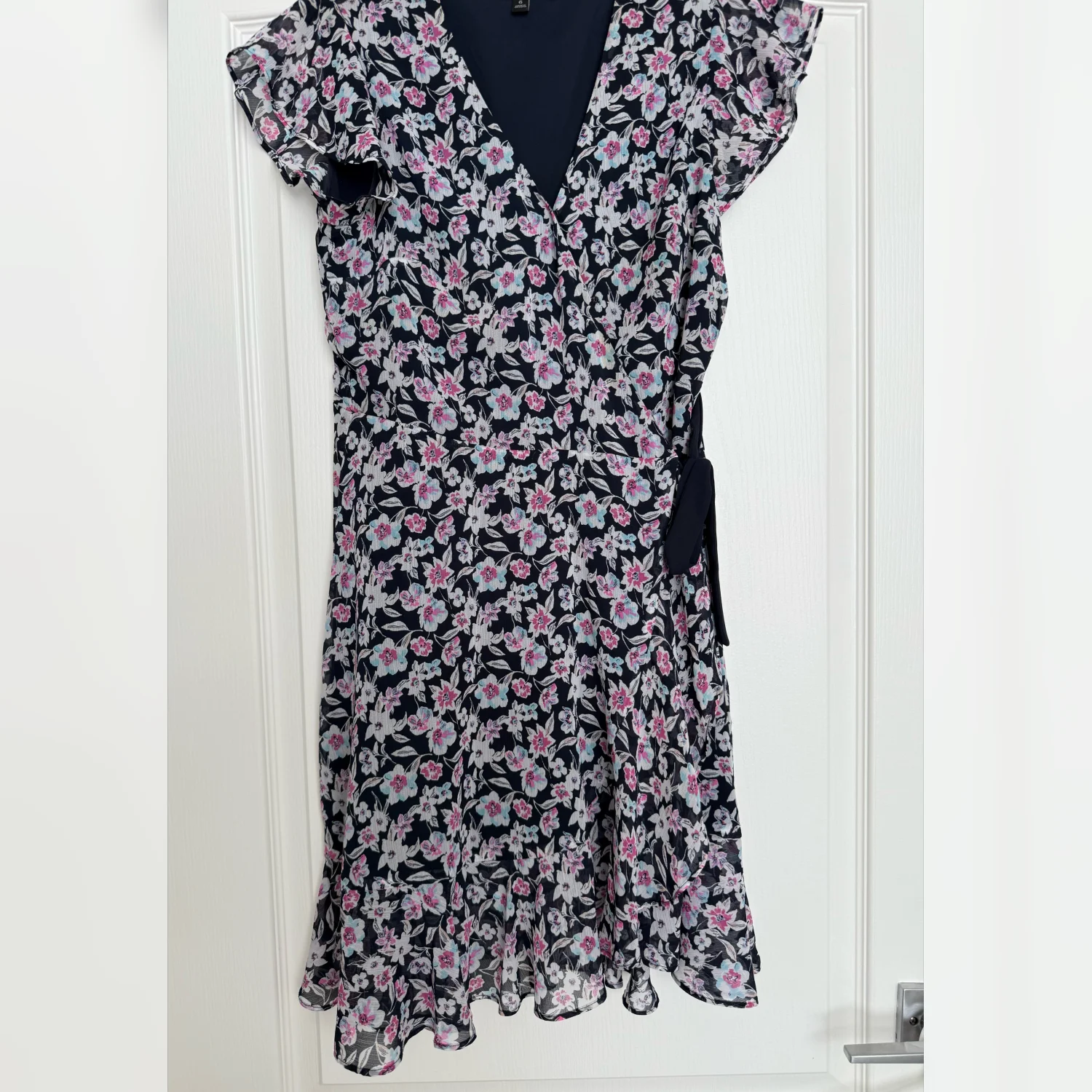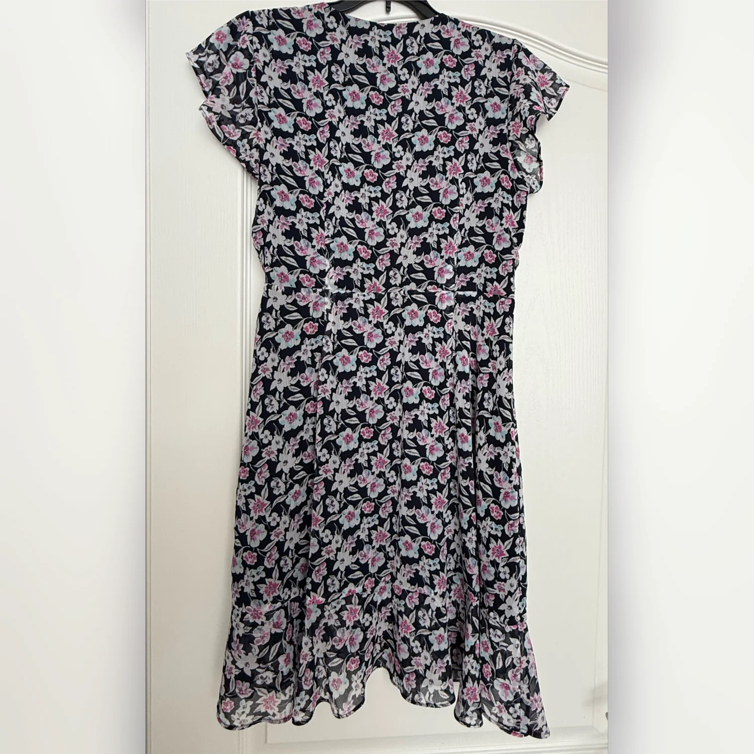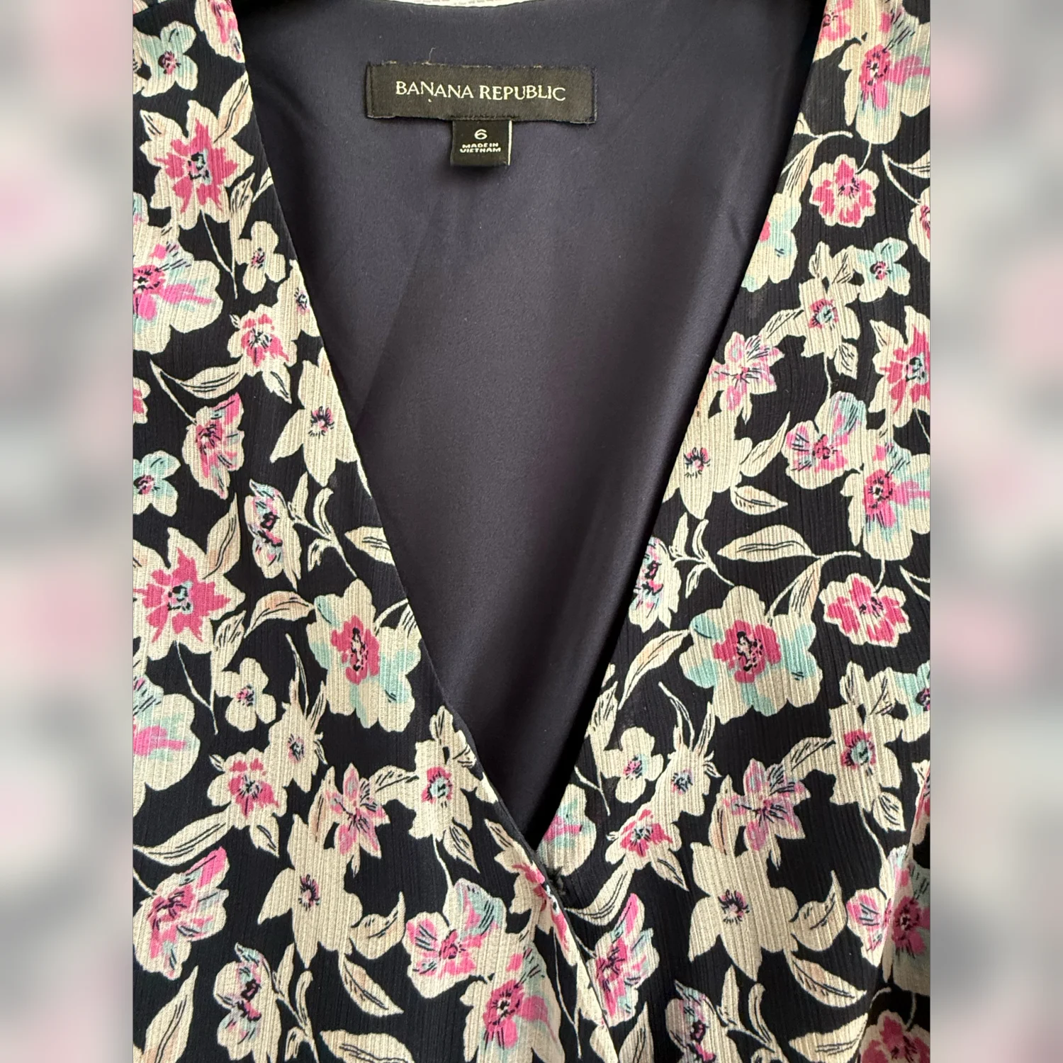 Banana Republic, floral print dress with a navy base and florals in pink, white, and blue. Size 6.