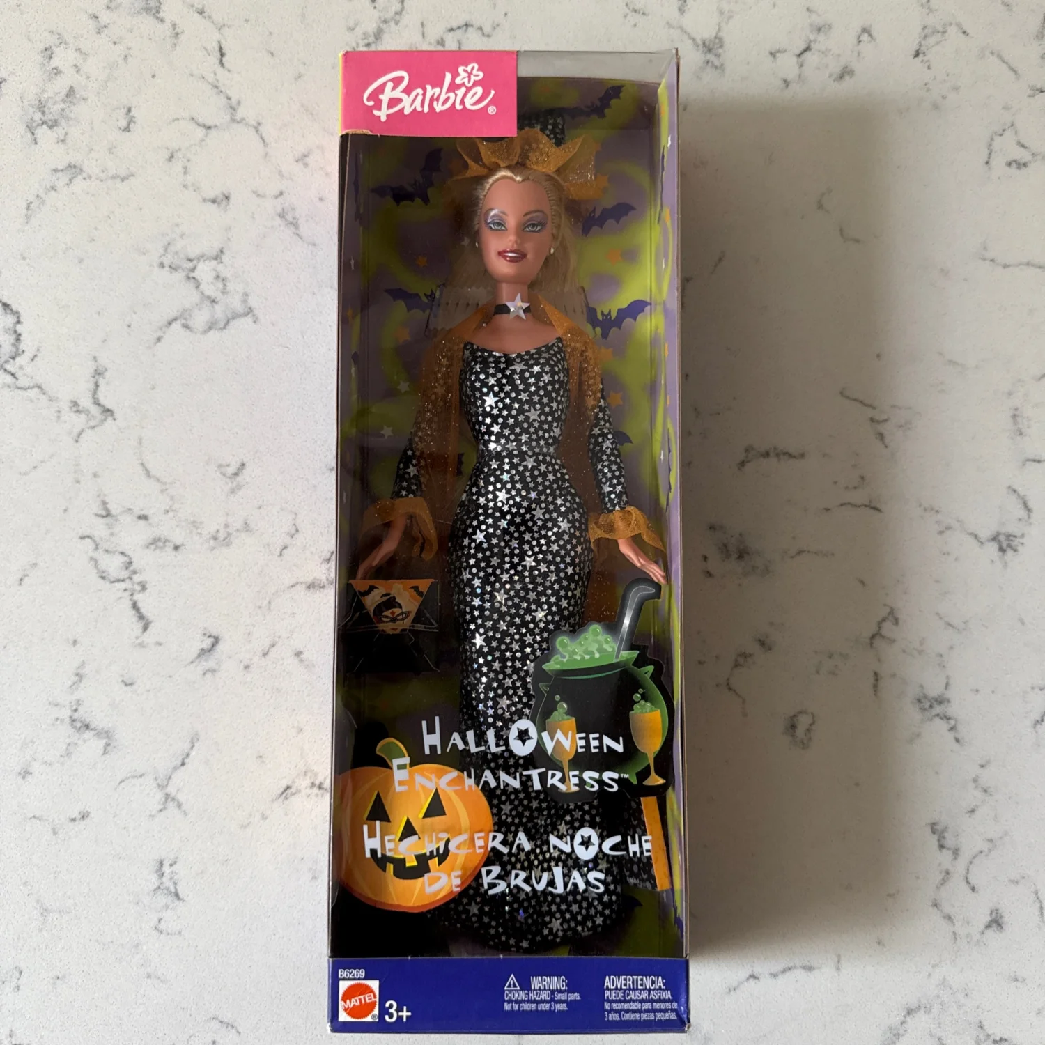 This Barbie Halloween Enchantress doll is perfect for Halloween enthusiasts and collectors alike. The doll features a black and white dotted dress with a brown cape and matching hat, embodying a classic witch theme. Packaged in a themed box with pumpkins and a cauldron illustration, this collectible is a must-have for festive occasions. Suitable for ages 3 and up. #Halloween #Barbie #Collectible