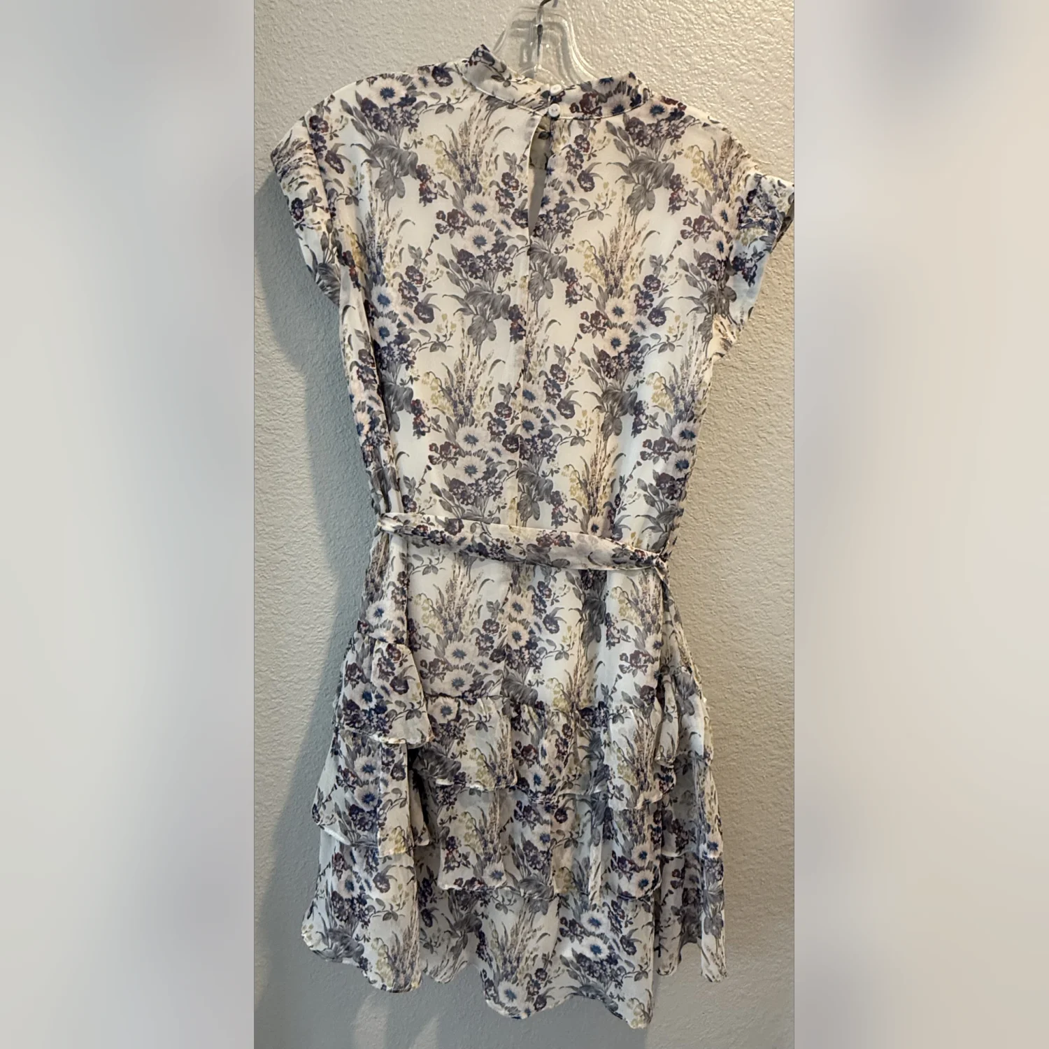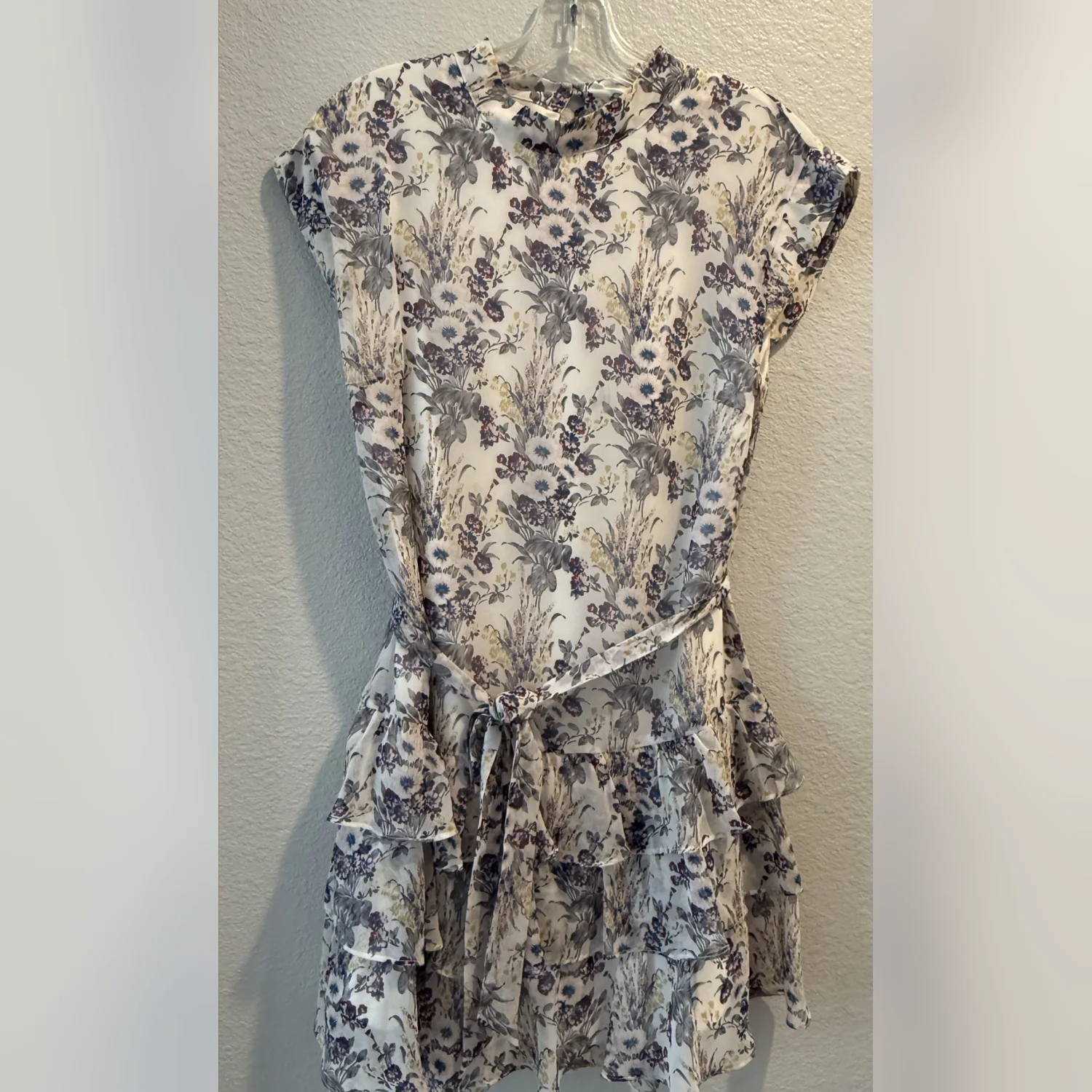 A light floral printed dress with a belt at the waist.