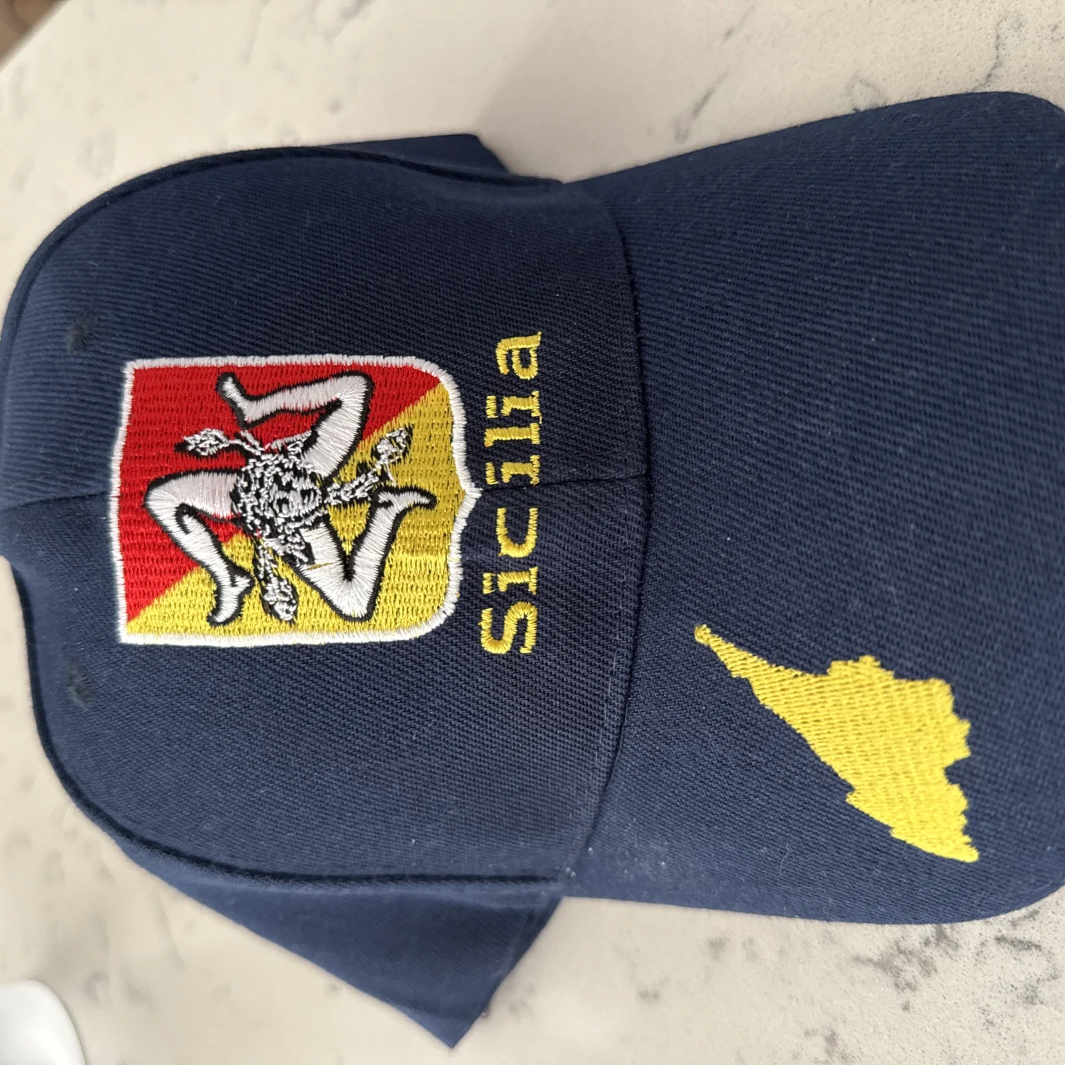 The cap features a white patch with a logo and the word 'Sicilia' on the front. The patch includes a stylized figure and a map. The cap has a mesh back and a curved brim.