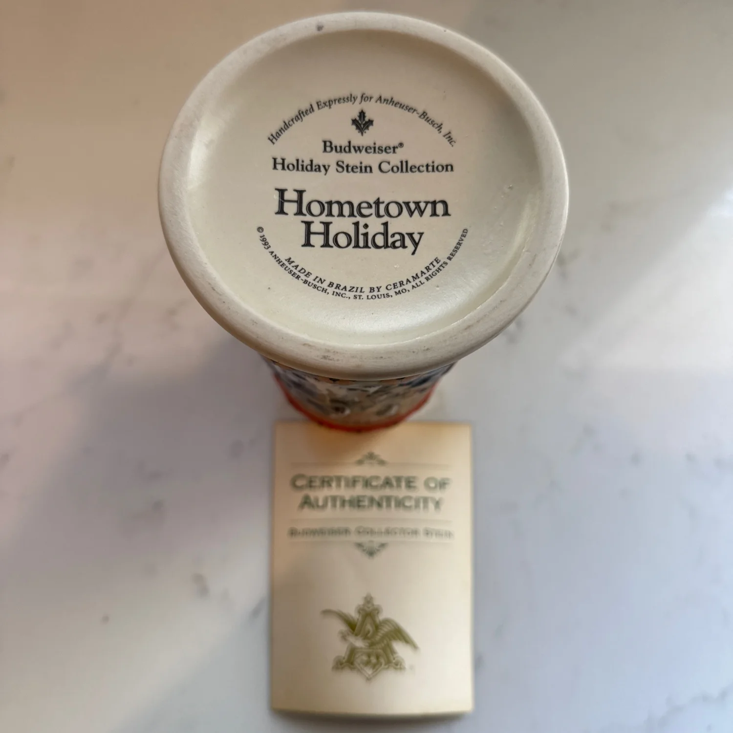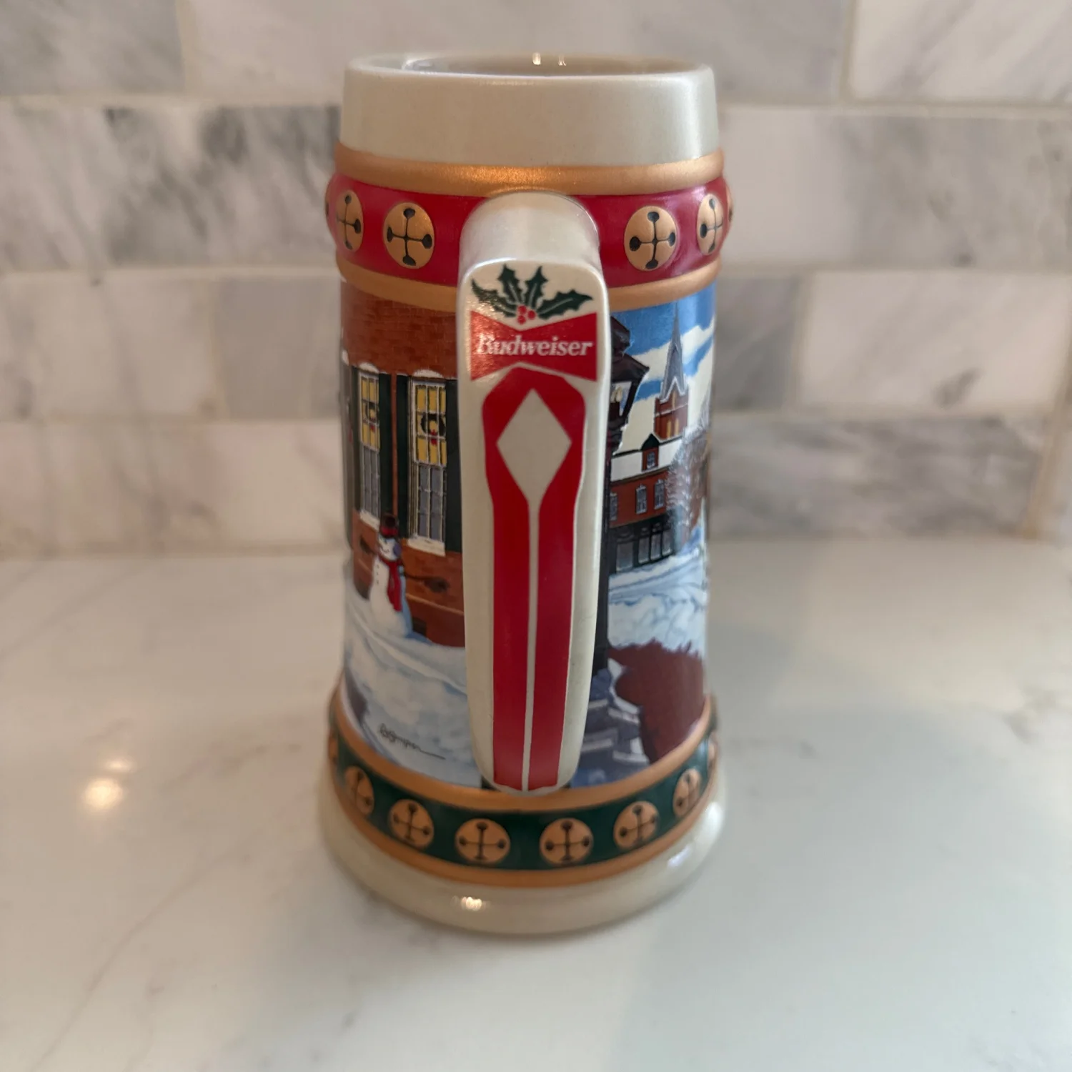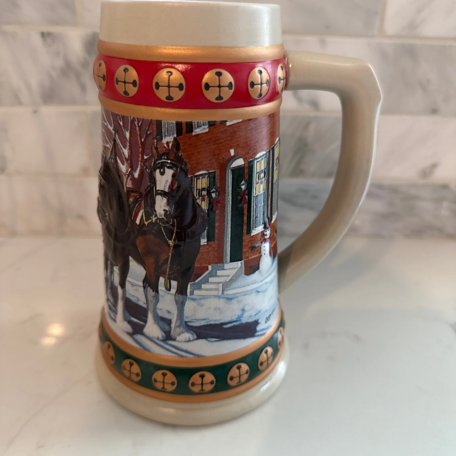 Save for Holiday!!This collectible Budweiser Holiday Stein from the 'Hometown Holiday' series features a festive winter scene with horses and snow, bordered by red and green accents with decorative symbols. Made by Ceramarte in Brazil, this ceramic stein is part of the Budweiser Holiday Stein Collection and comes with a certificate of authenticity. A perfect piece for collectors or as a holiday decoration. #Budweiser #HolidayStein #Collectible
