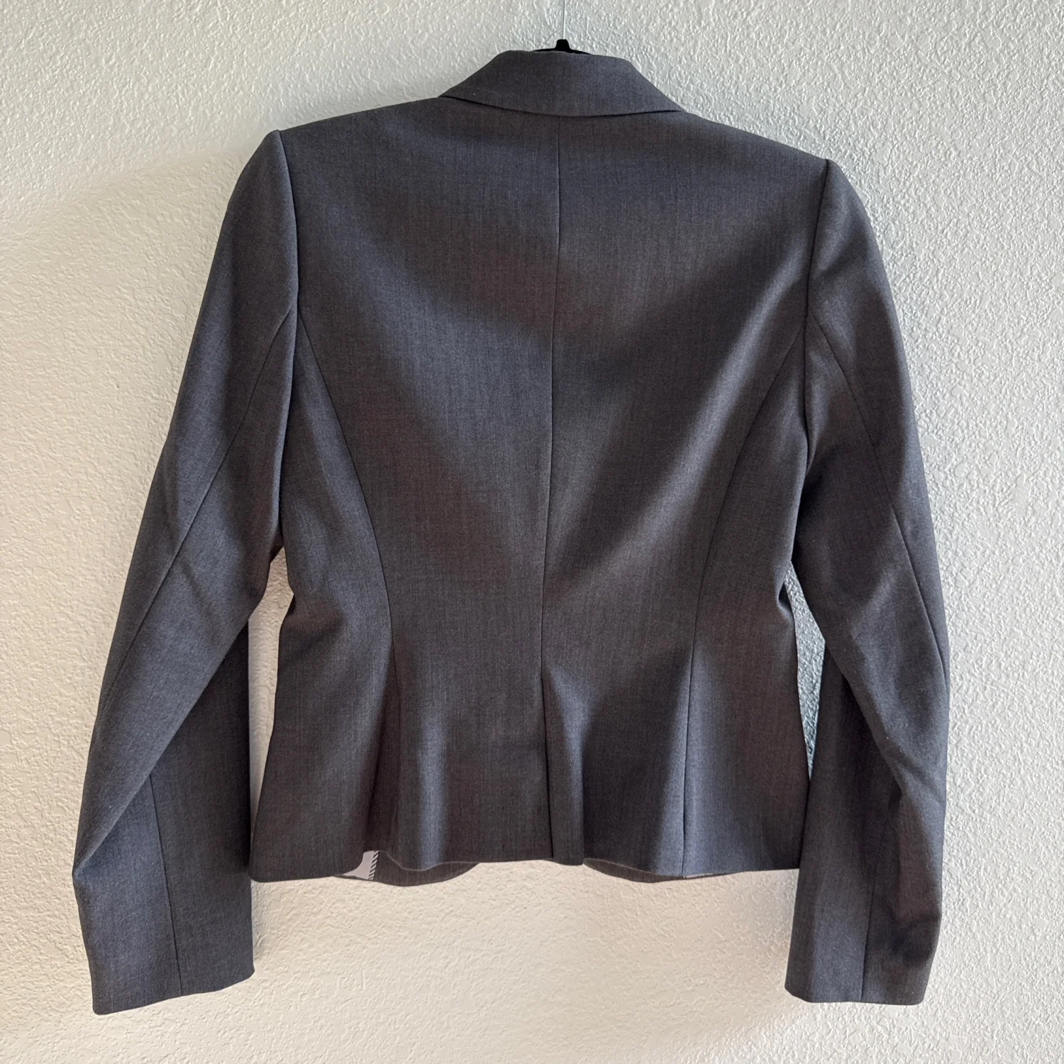 Calvin Klein women's grey blazer with a sleek, professional design. Features a two-button closure and notched lapel, providing a classic look. The blazer is fully lined, offering comfort and a tailored fit. Perfect for office wear or formal occasions. Size 4P. Made from quality materials for durability. #CalvinKlein #Blazer #ProfessionalWear