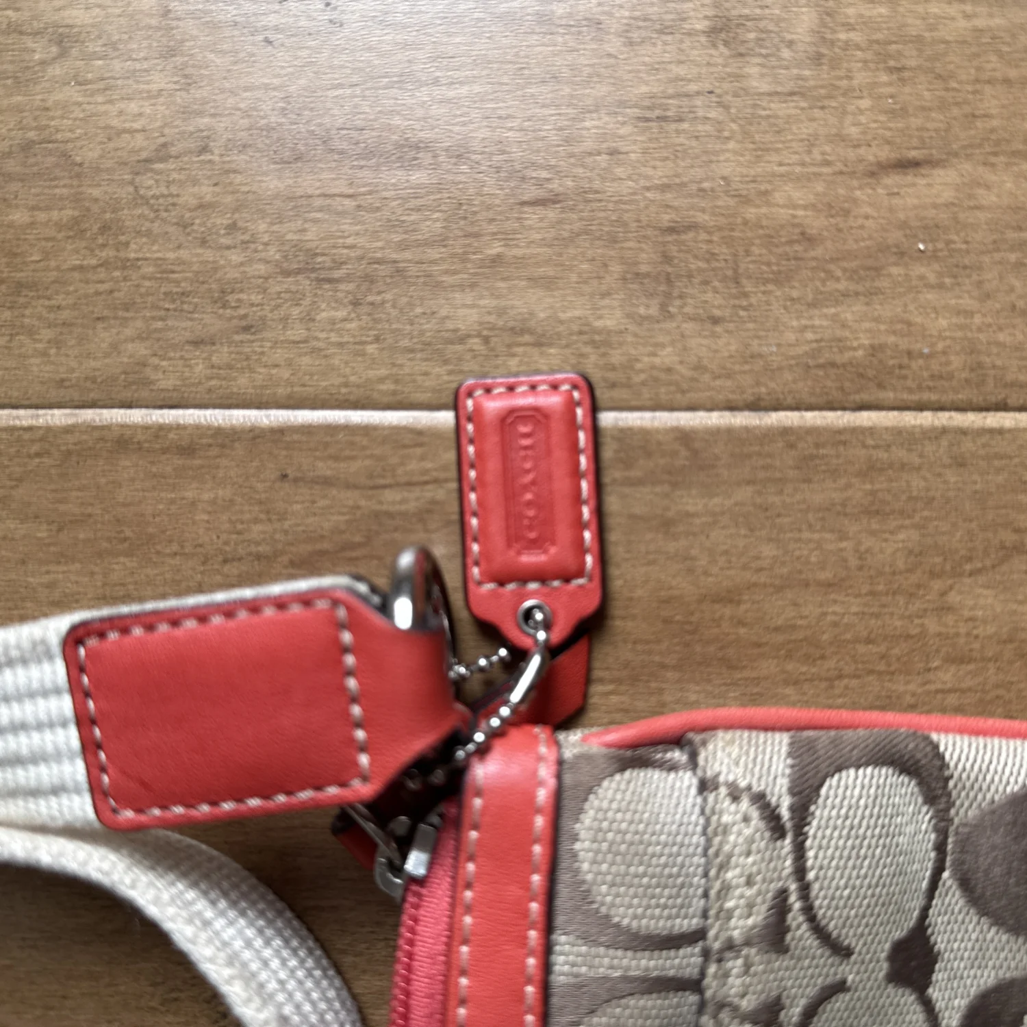 Coach crossbody bag in a brown and cream design with orange leather trim and a cream adjustable strap.