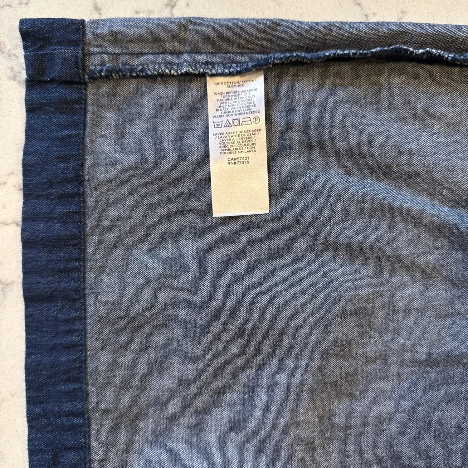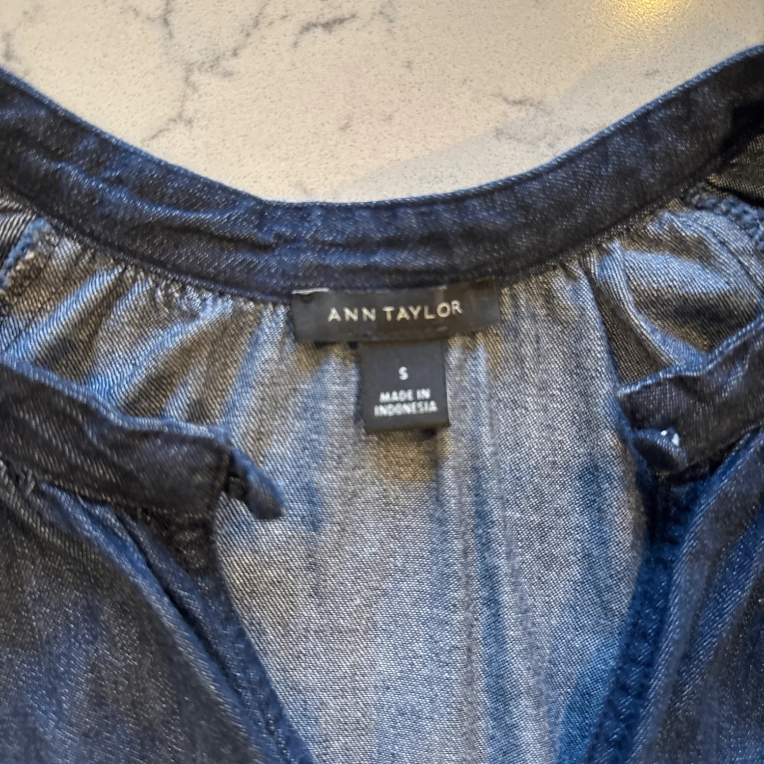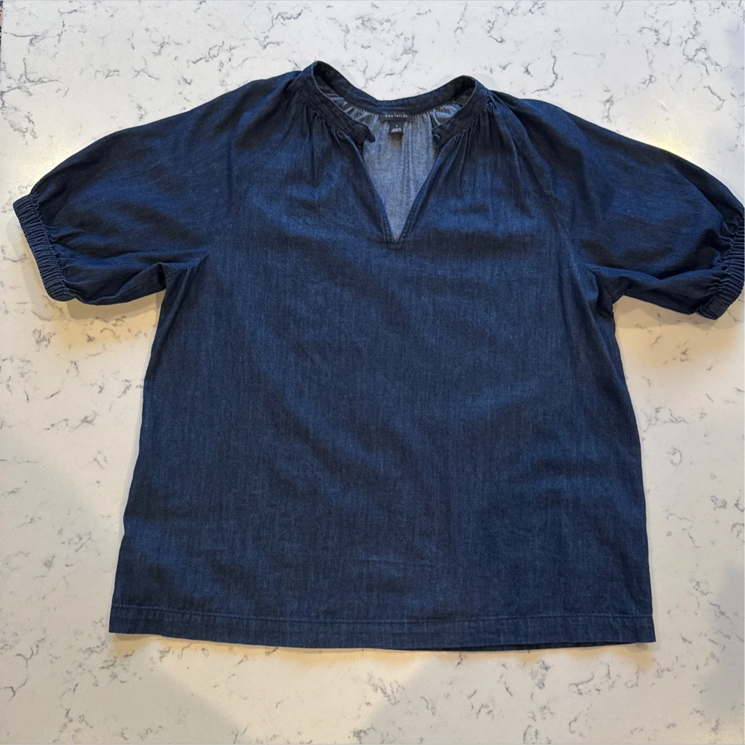Denim blouse with a V-neck and ruffled sleeves. The blouse appears to be in excellent condition with no visible damage.