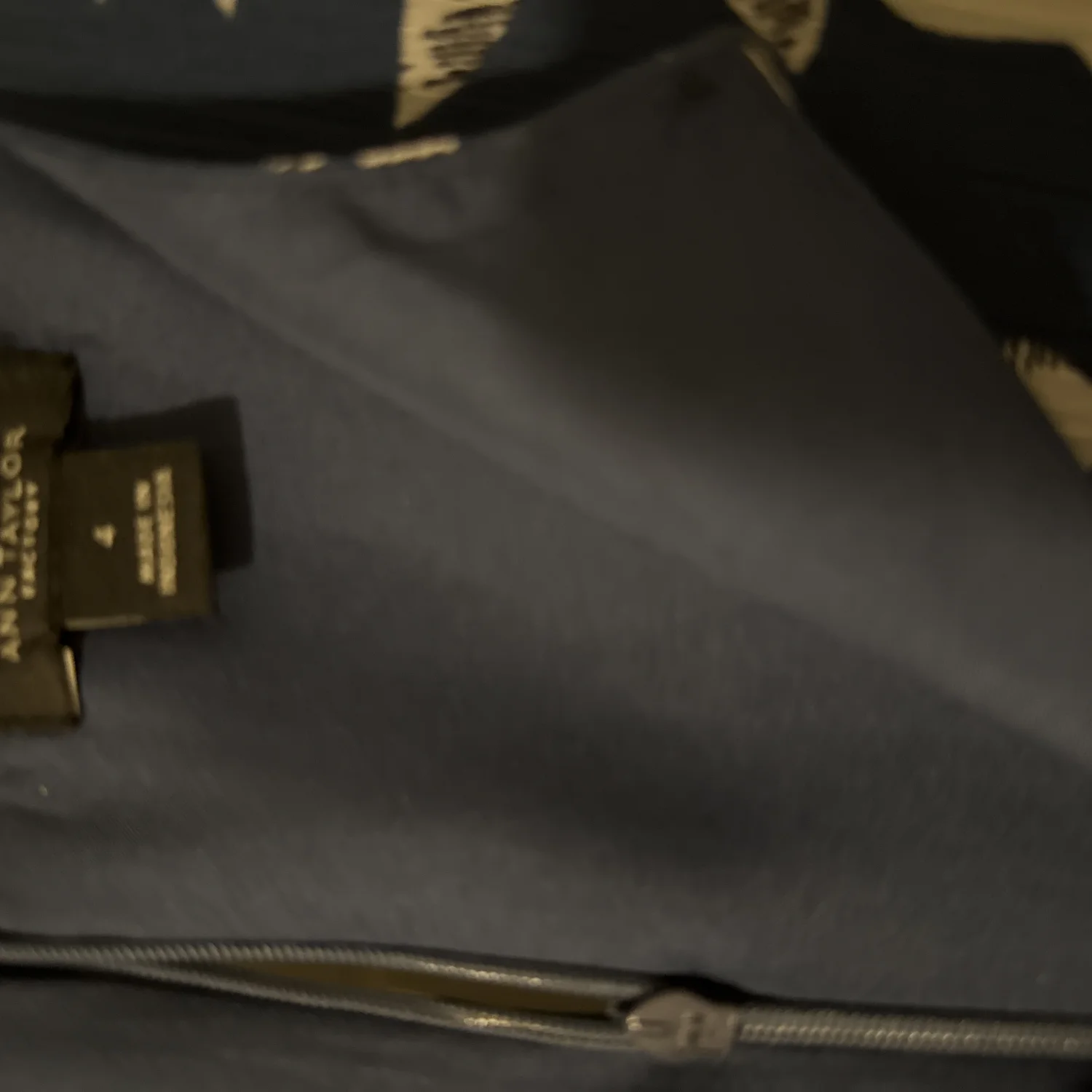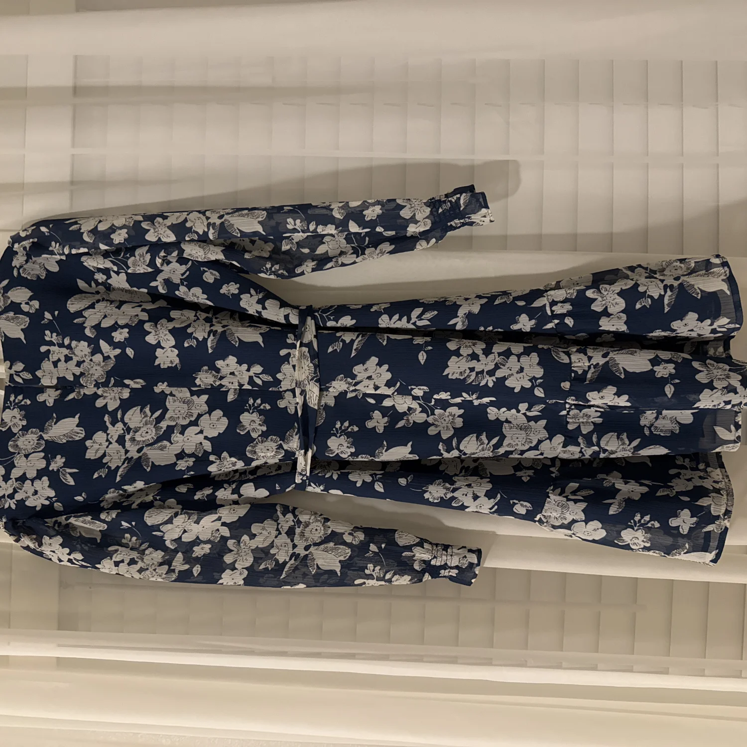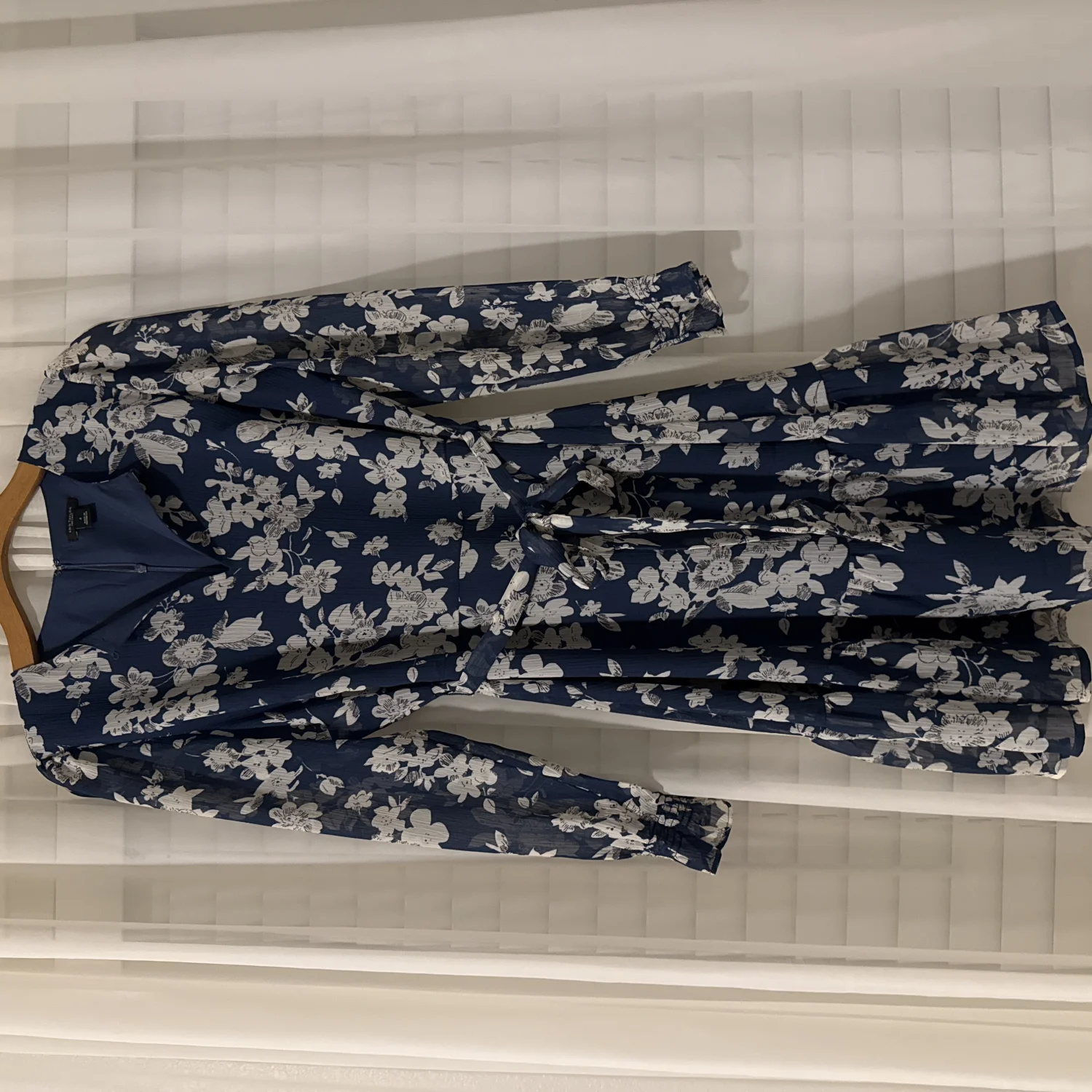 A blue floral dress with a white pattern. The dress appears to be in great condition! Size 4