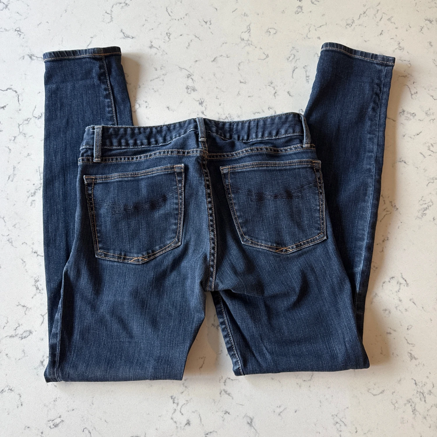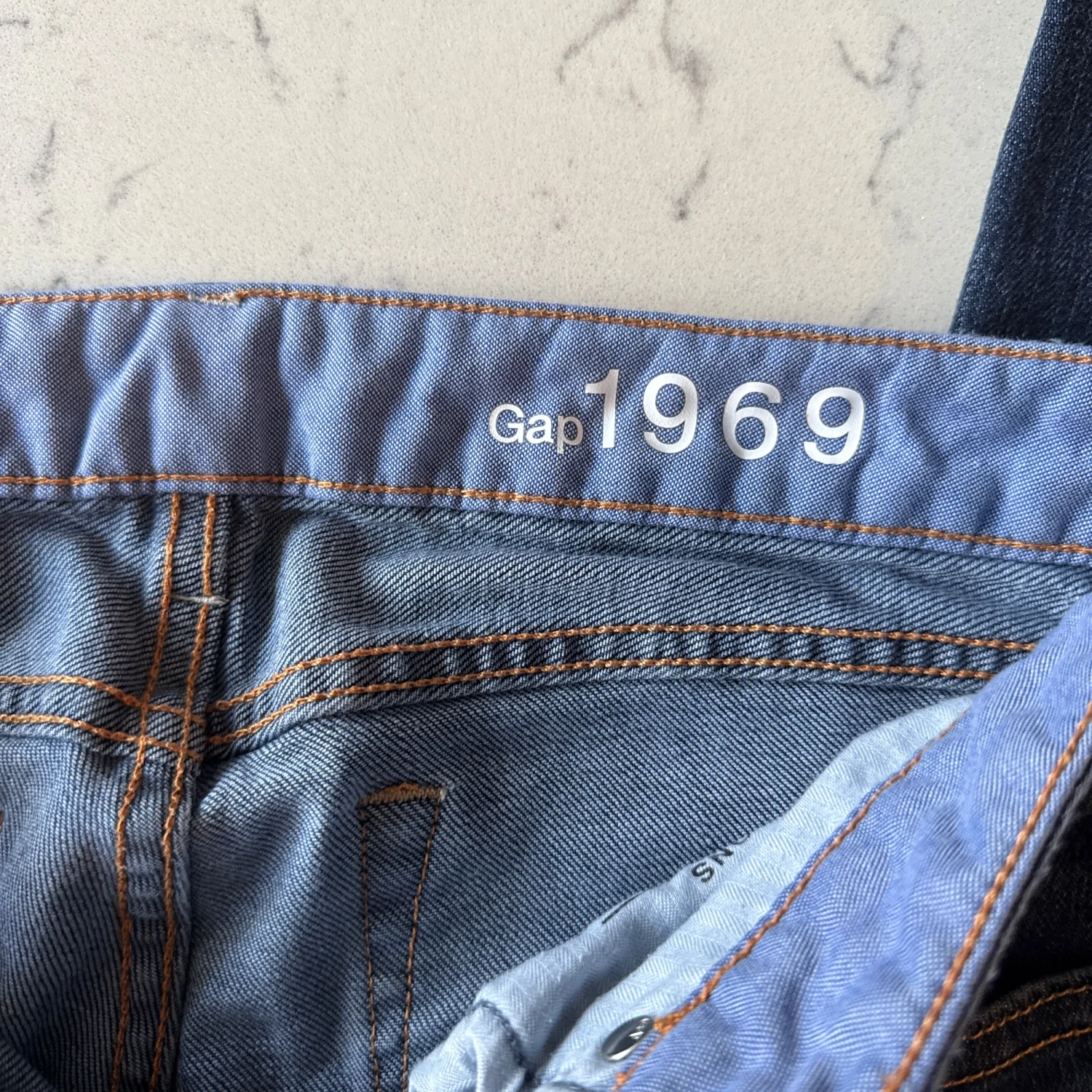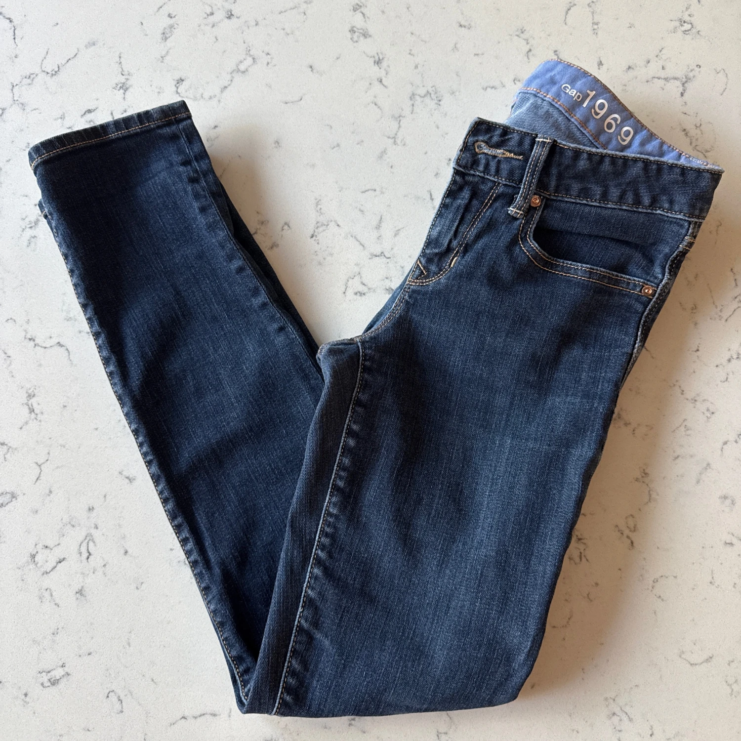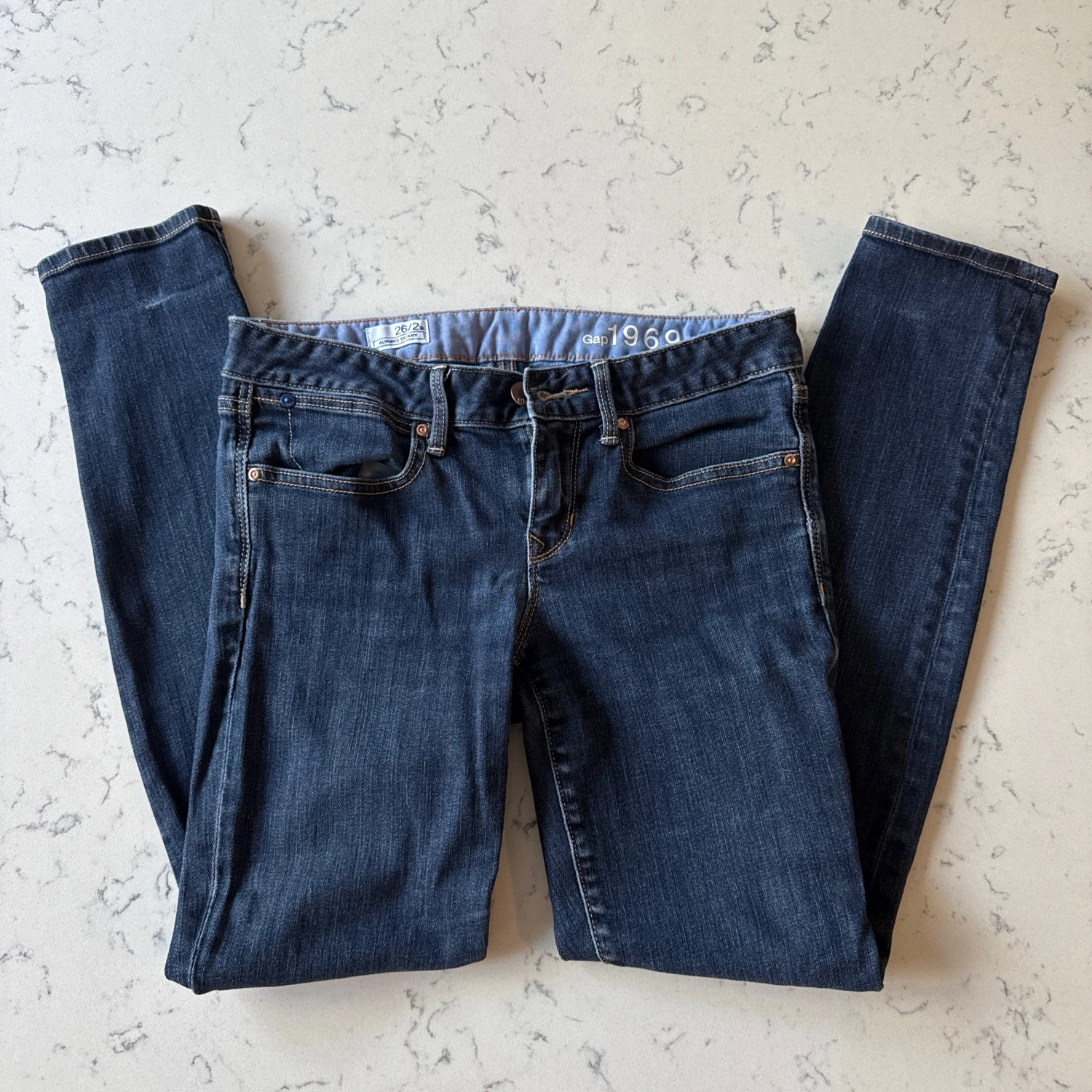 Gap 1969 Always Skinny Jeans in a classic dark blue wash. These jeans are made with a comfortable stretch denim fabric. Featuring a five-pocket style with button and zip closure. Ideal for casual or semi-casual wear. Tag size 26/2 indicates a waist size of 26 inches. #Gap #1969 #SkinnyJeans #CasualWear
