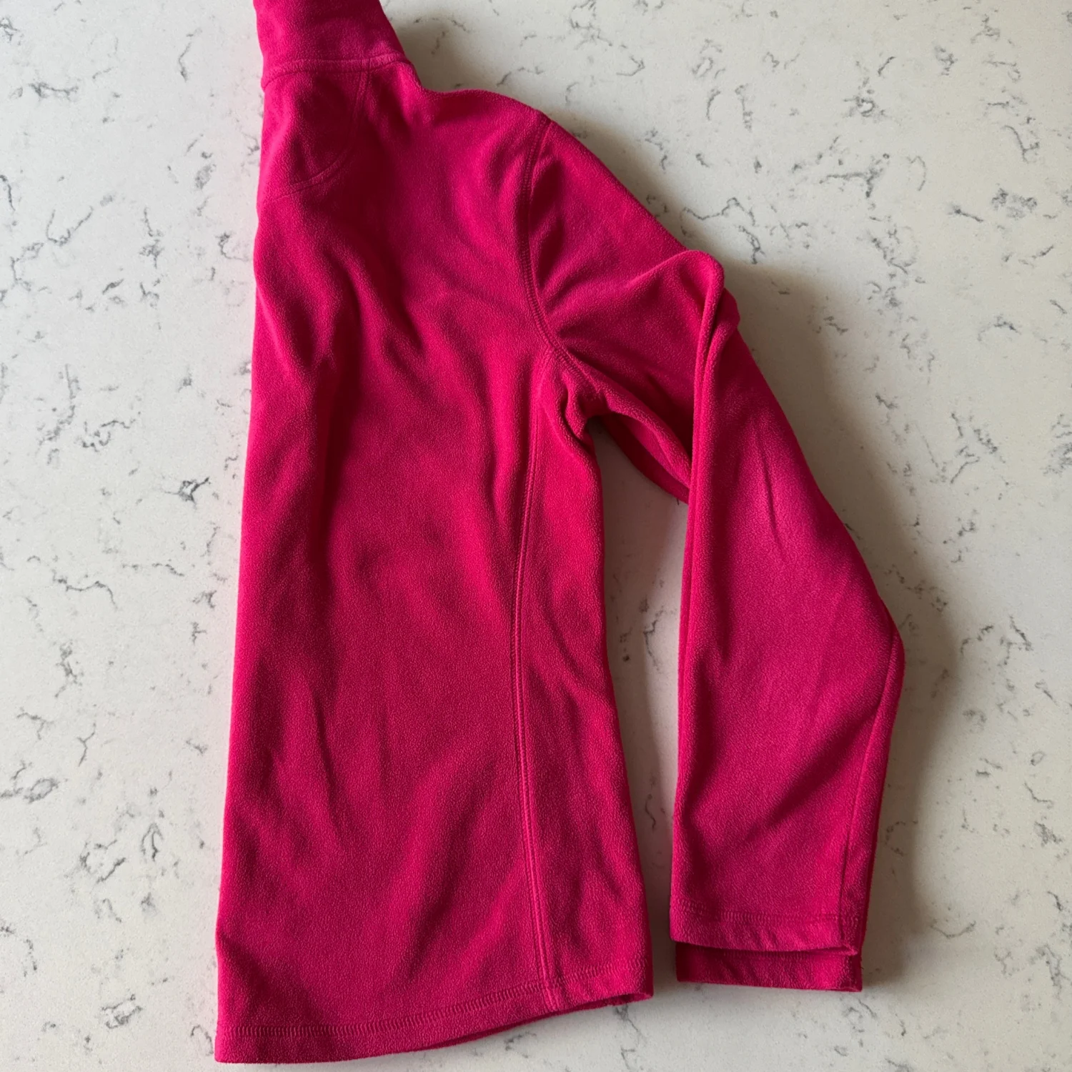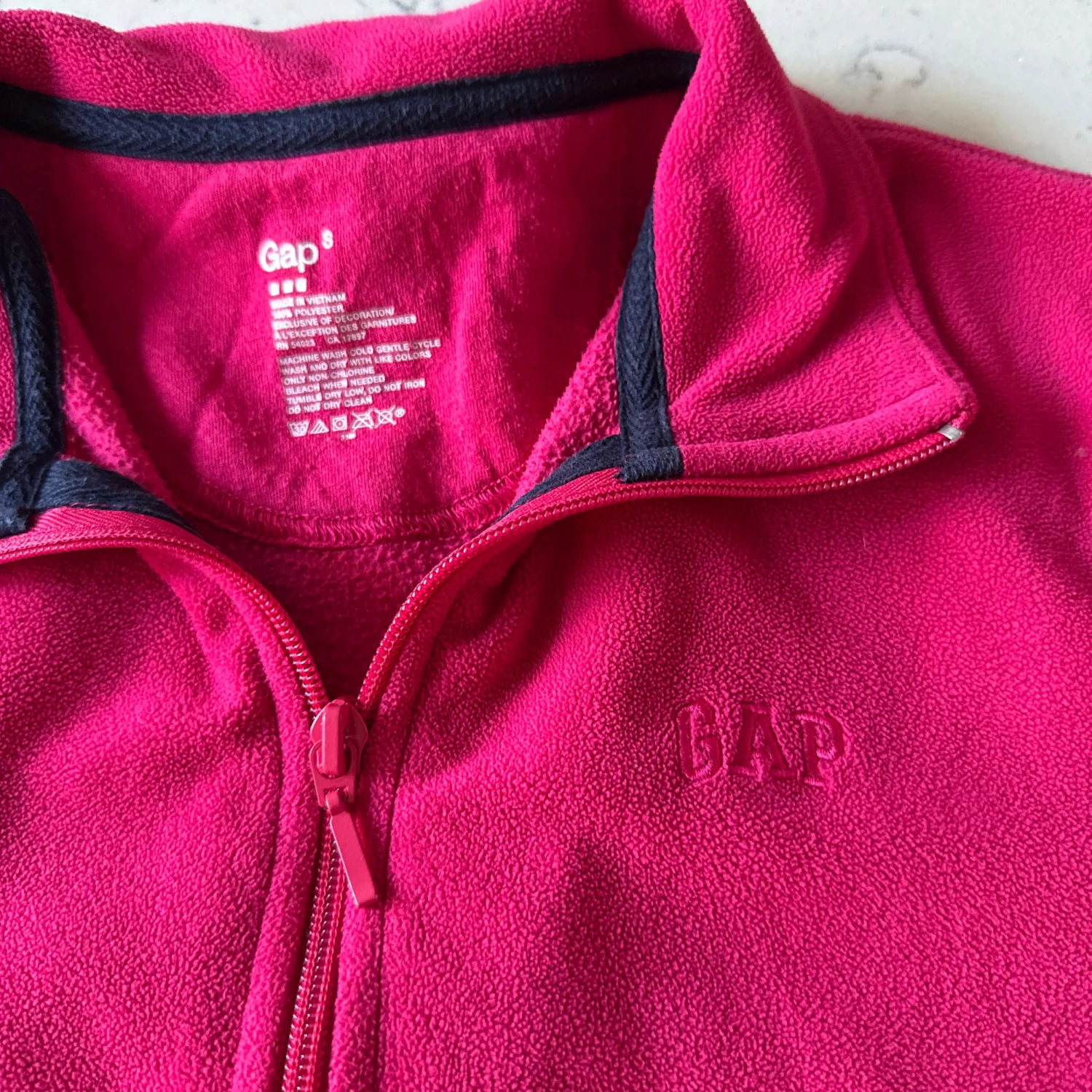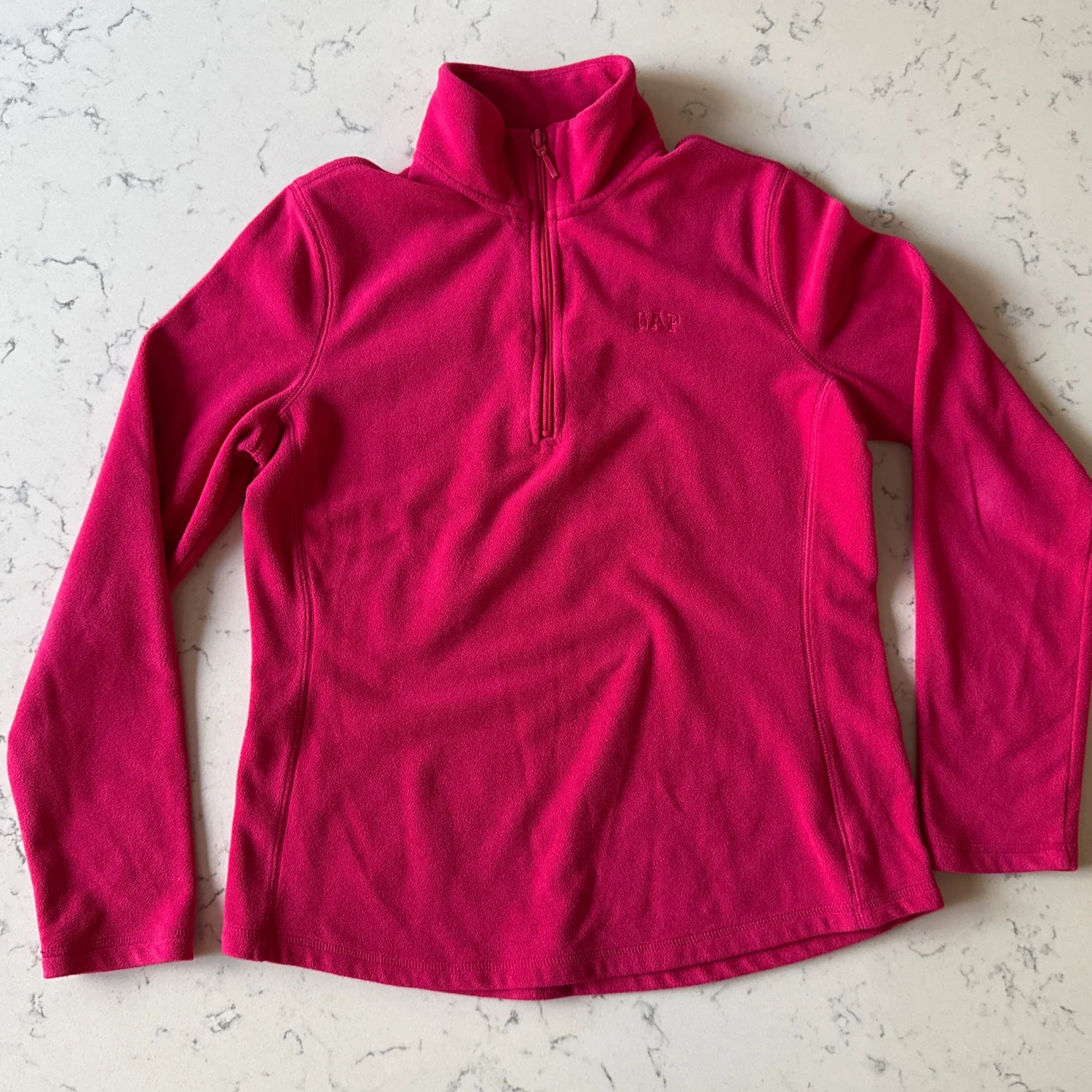 Women's Gap pullover made from soft fleece material in a vibrant pink color. Features a quarter-zip front and a high collar for added warmth. Perfect for layering in cooler weather. #casual #cozy
