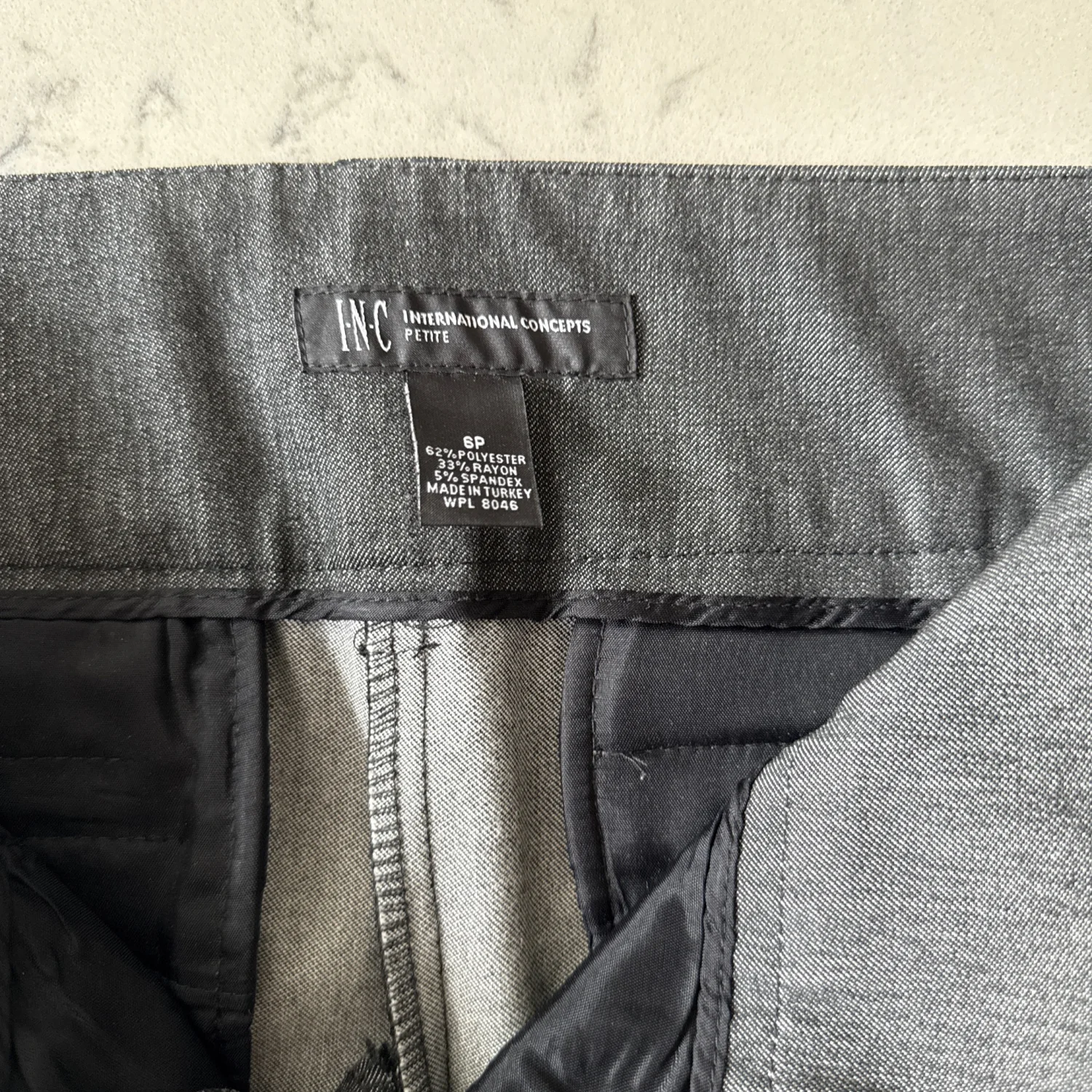INC International Concepts grey dress Low Cut pants in size 8P. These pants feature a classic straight-leg cut, suitable for professional or formal occasions. Made from a comfortable blend of materials that provide a sleek appearance. Perfect for pairing with blouses or blazers. Size 6P. #businessattire #formalwear